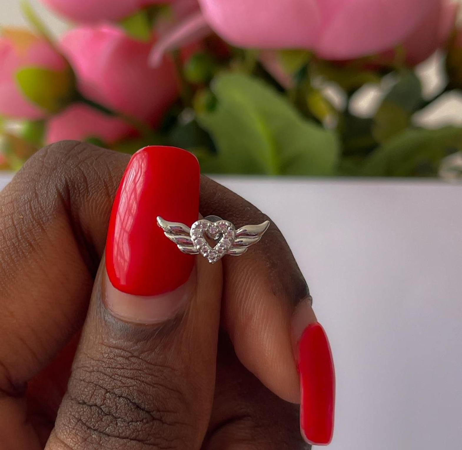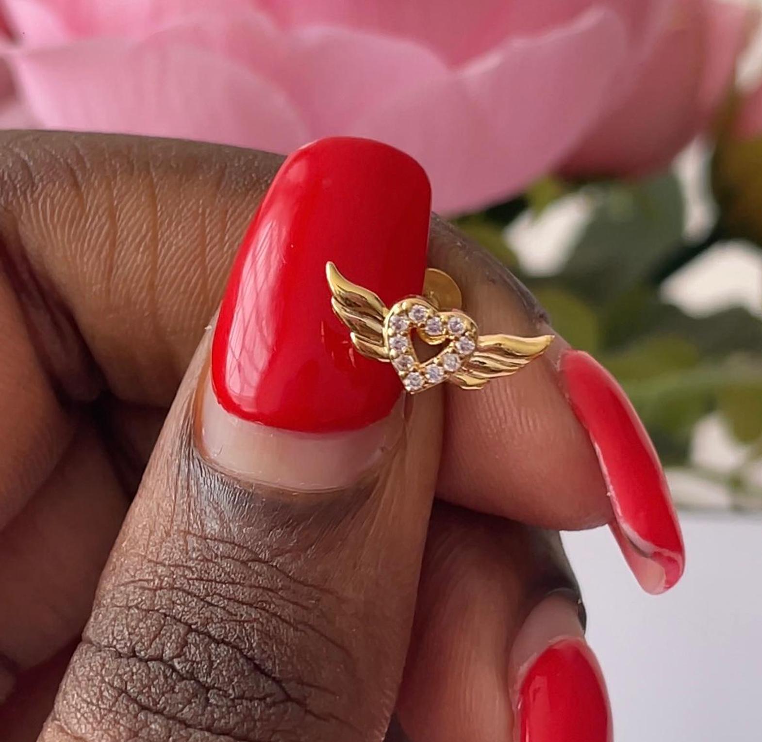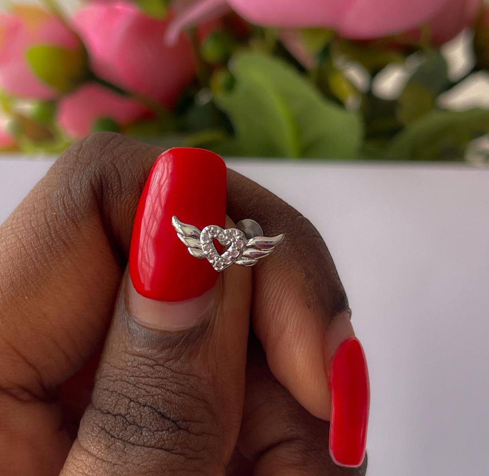Embrace a whimsical touch with this enchanting heart and wings flat back stud, delicately adorned with sparkling details. Perfect for adding a sweet and celestial charm to your piercing.