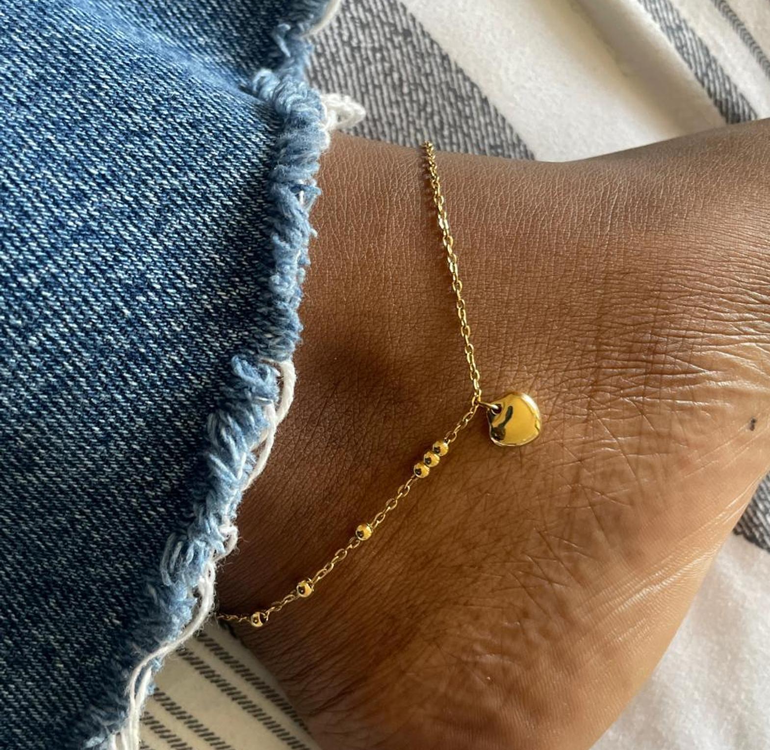 Show your affection with this charming anklet featuring a small, high-polish heart charm that rests delicately on the ankle. The fine chain is accented with tiny, gleaming beads for added texture and shine.