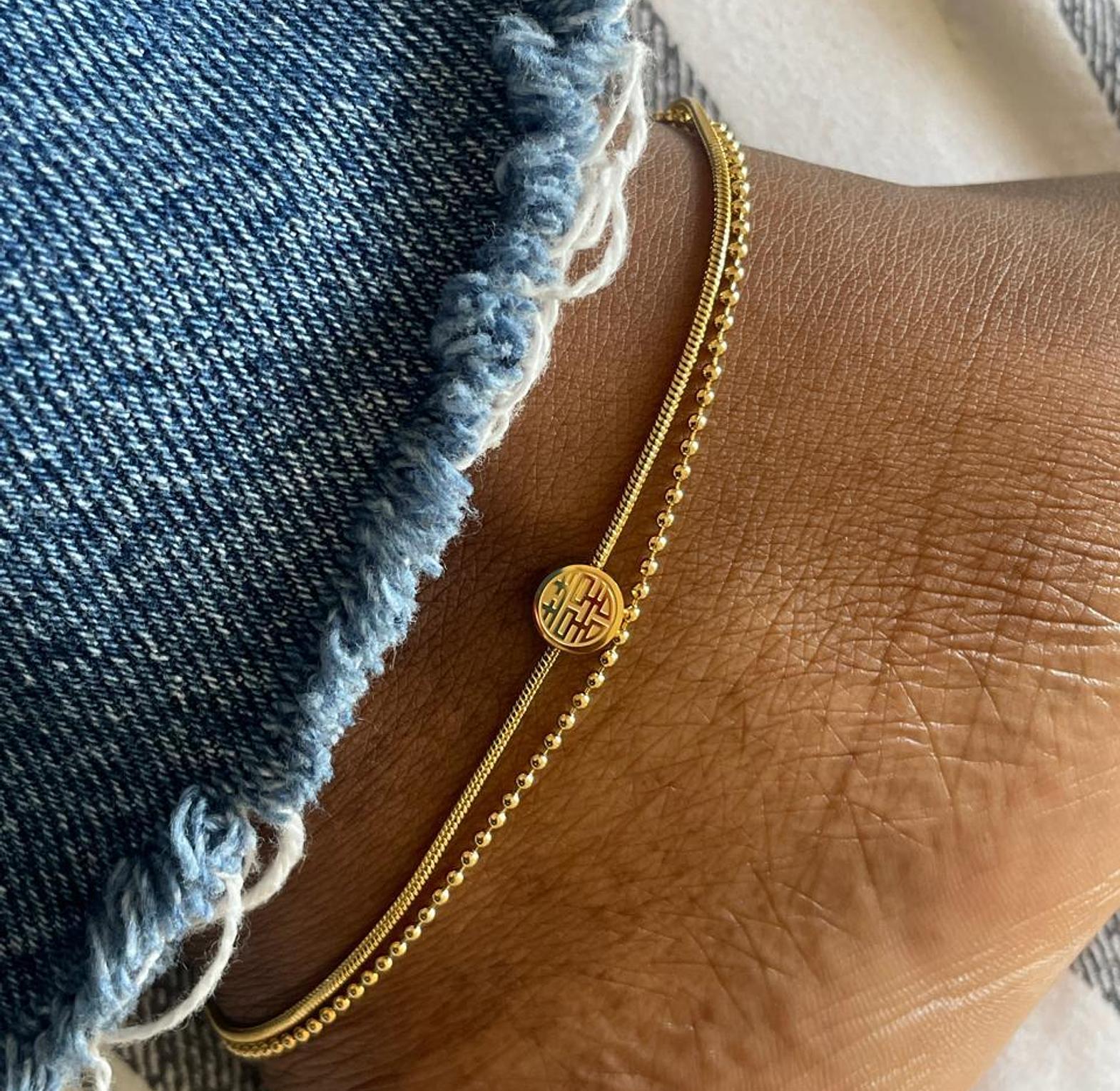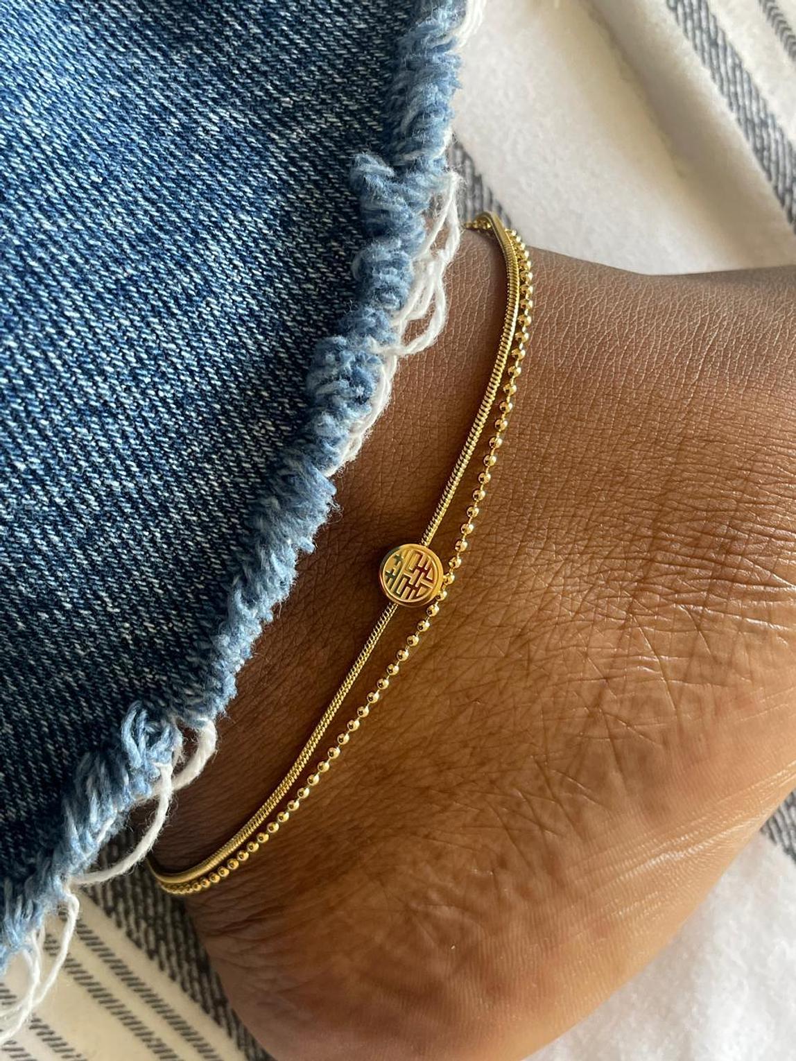 This elegant layered anklet features a smooth snake chain and a delicate bead chain, unified by a central circular medallion. The piece offers a sophisticated blend of texture and meaning for a refined finish.