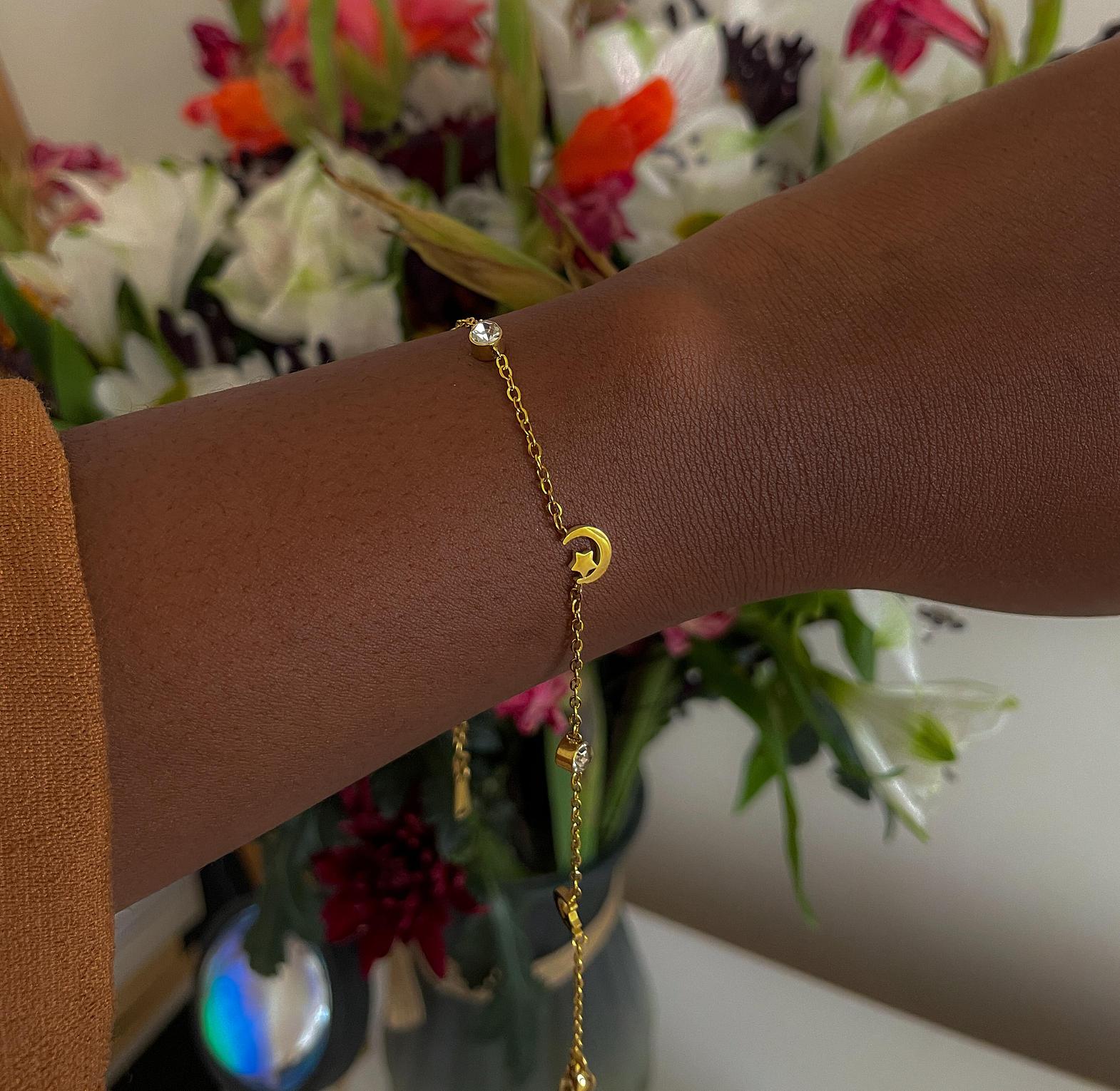 Adorn your wrist with the enchanting Celestial Whimsy Dual Bracelet, blending playful charms with delicate sparkle. This gorgeous, durable, and comfortable piece is perfect for adding a touch of magic to your everyday look.
