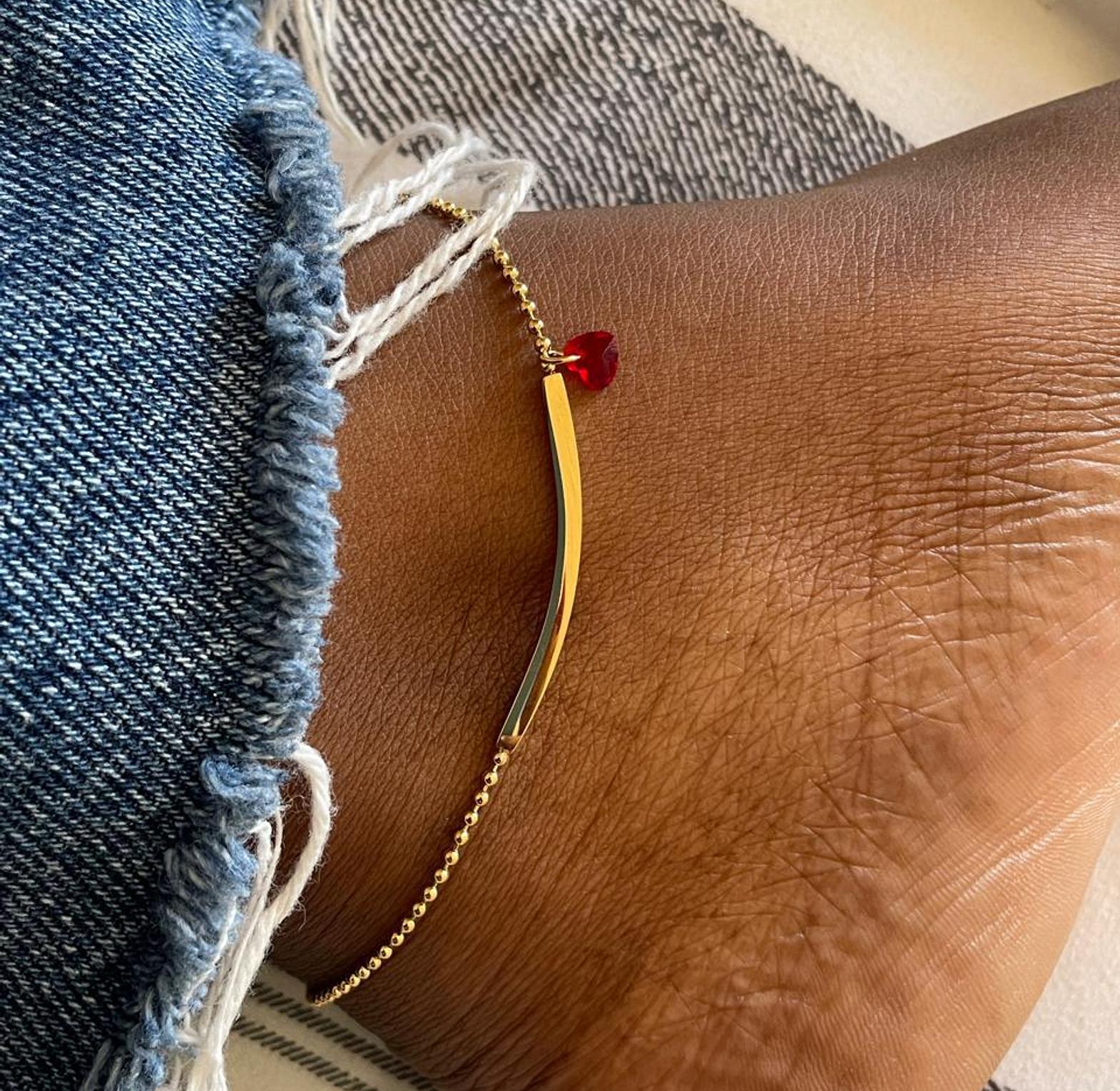 This contemporary piece features a sleek, gracefully curved gold bar anchored by a vibrant, miniature crimson heart accent. The design offers a sophisticated blend of modern lines and passionate color.