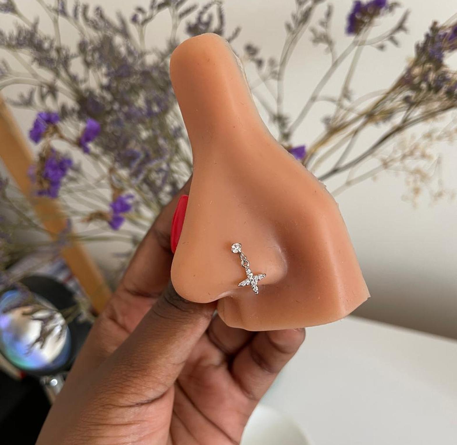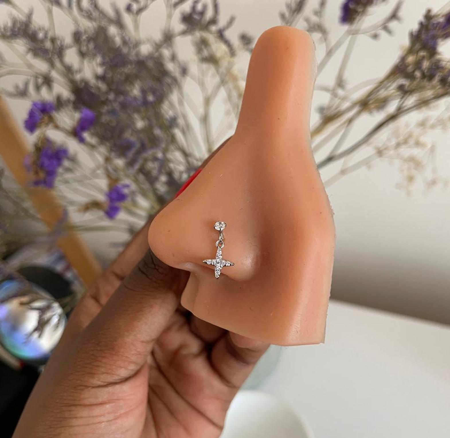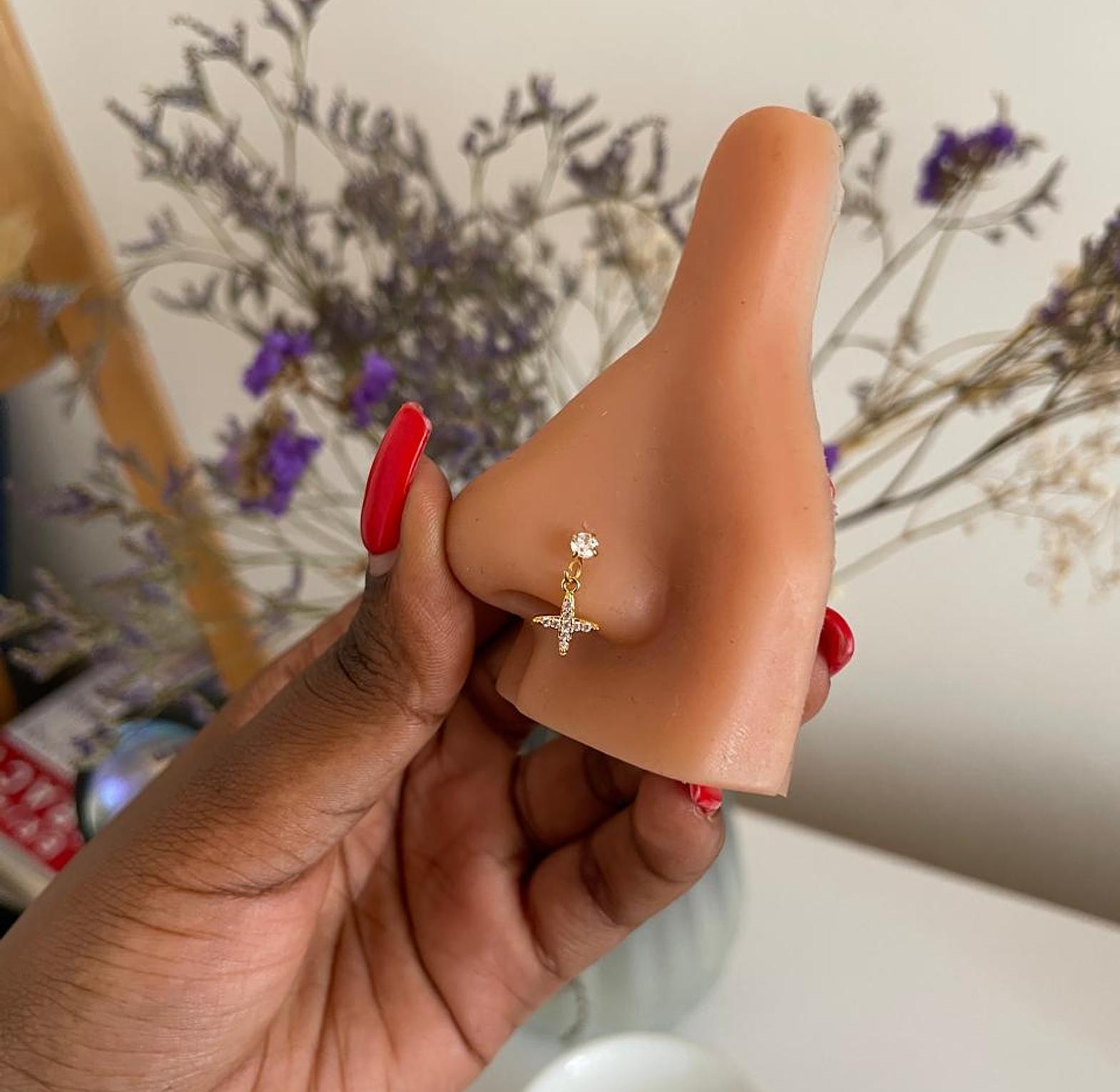 Adorn your nose with this elegant corkscrew nose ring, featuring a sparkling cross charm gracefully dangling below a brilliant stud. Available in luminous silver and radiant gold.