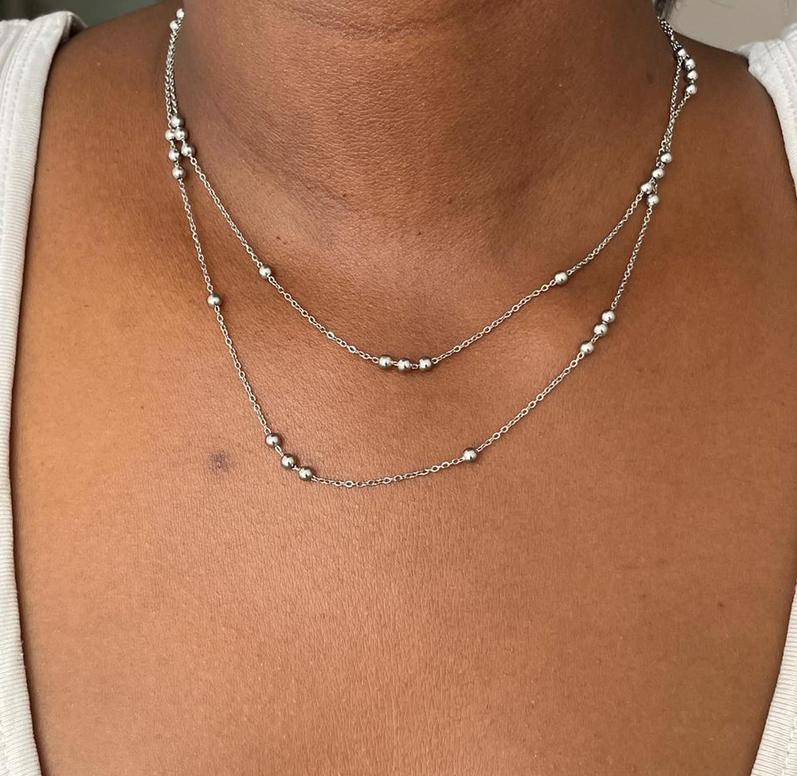 Grace your neckline with this elegant dual-layered silver-toned necklace, featuring delicate chains adorned with tiny, shimmering beads. A versatile piece that offers subtle sparkle and sophisticated charm.