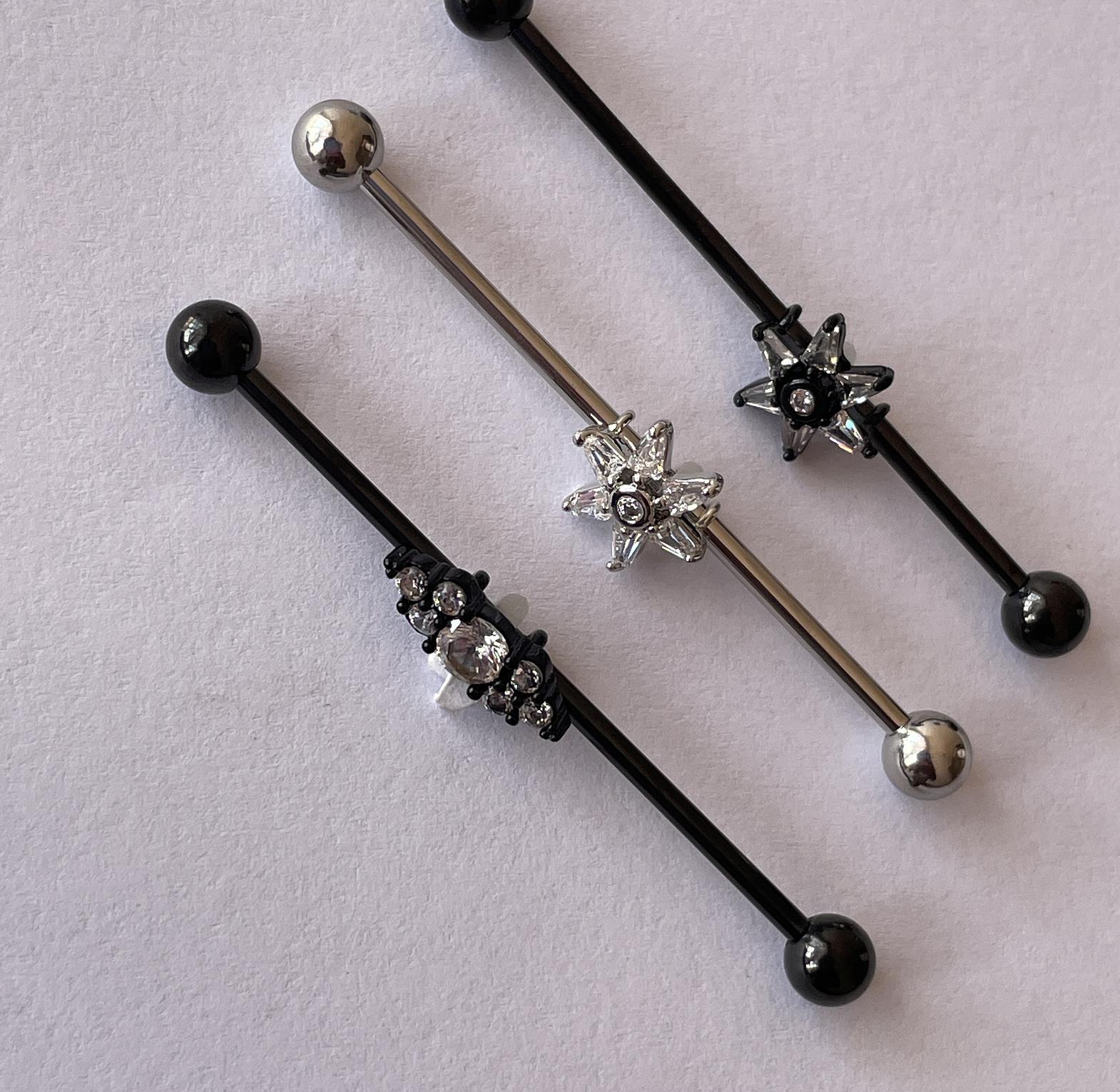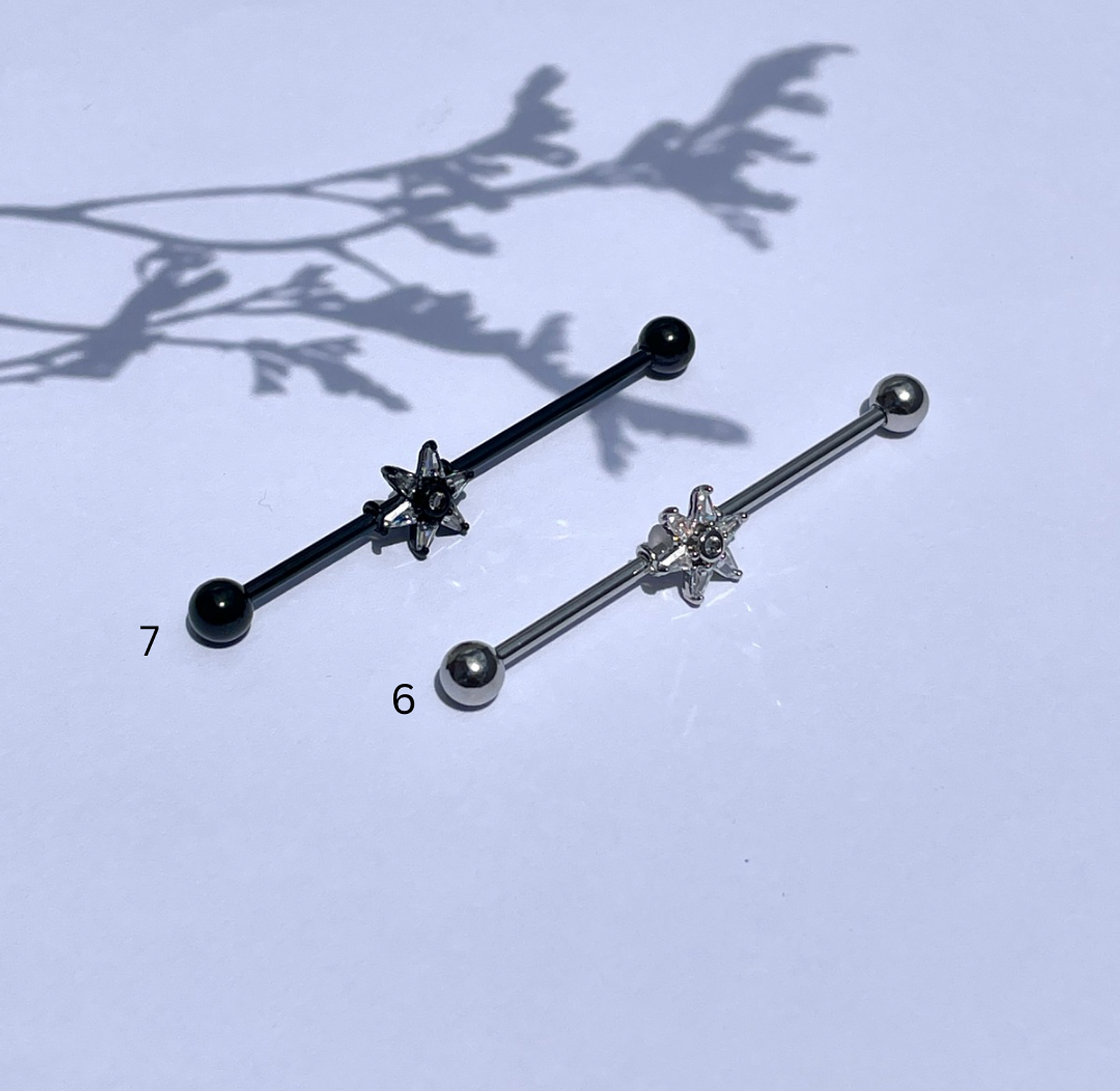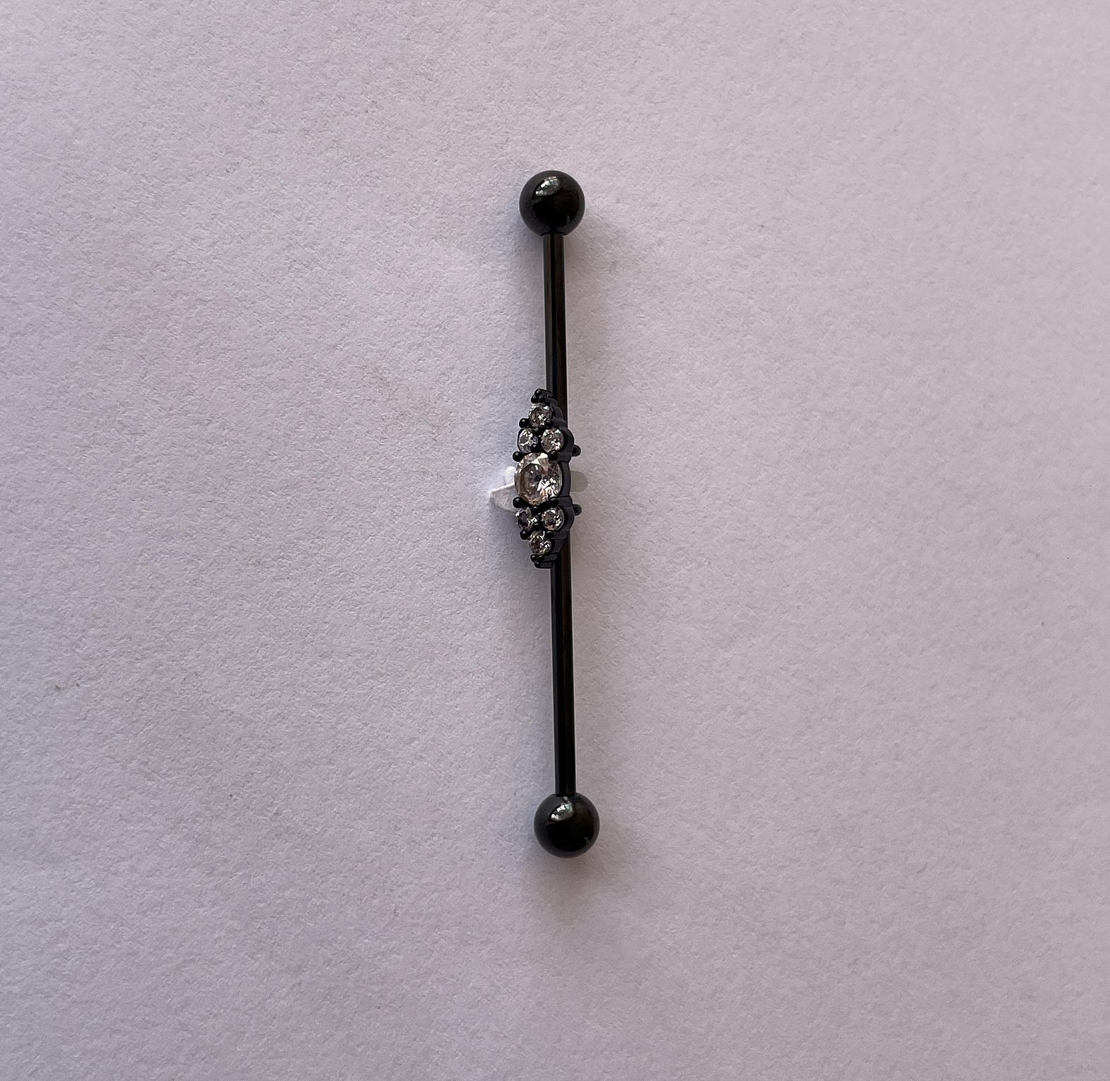 A striking floral dazzling industrial bar that combines edgy body jewelry design with delicate, sparkling detail.