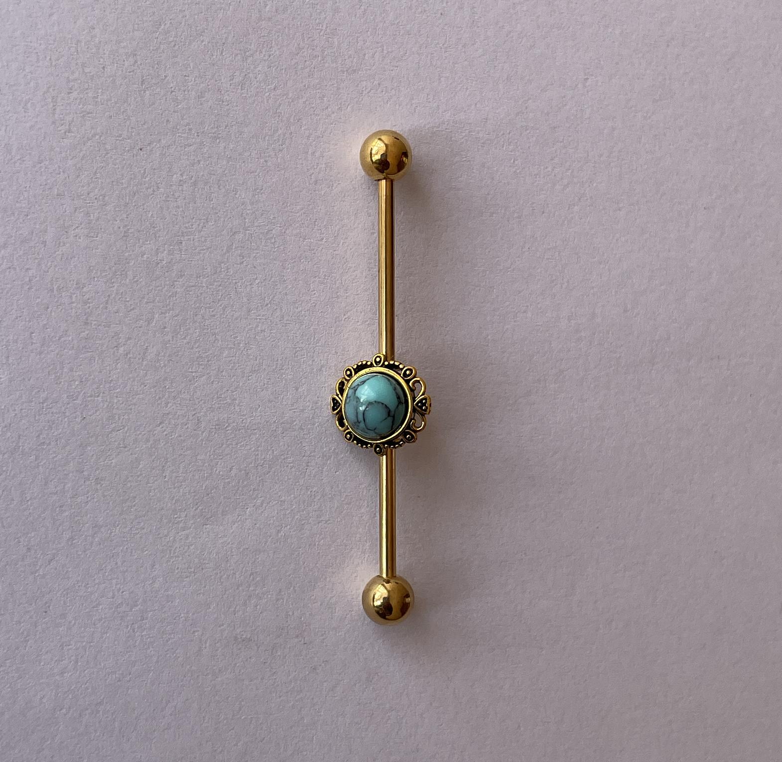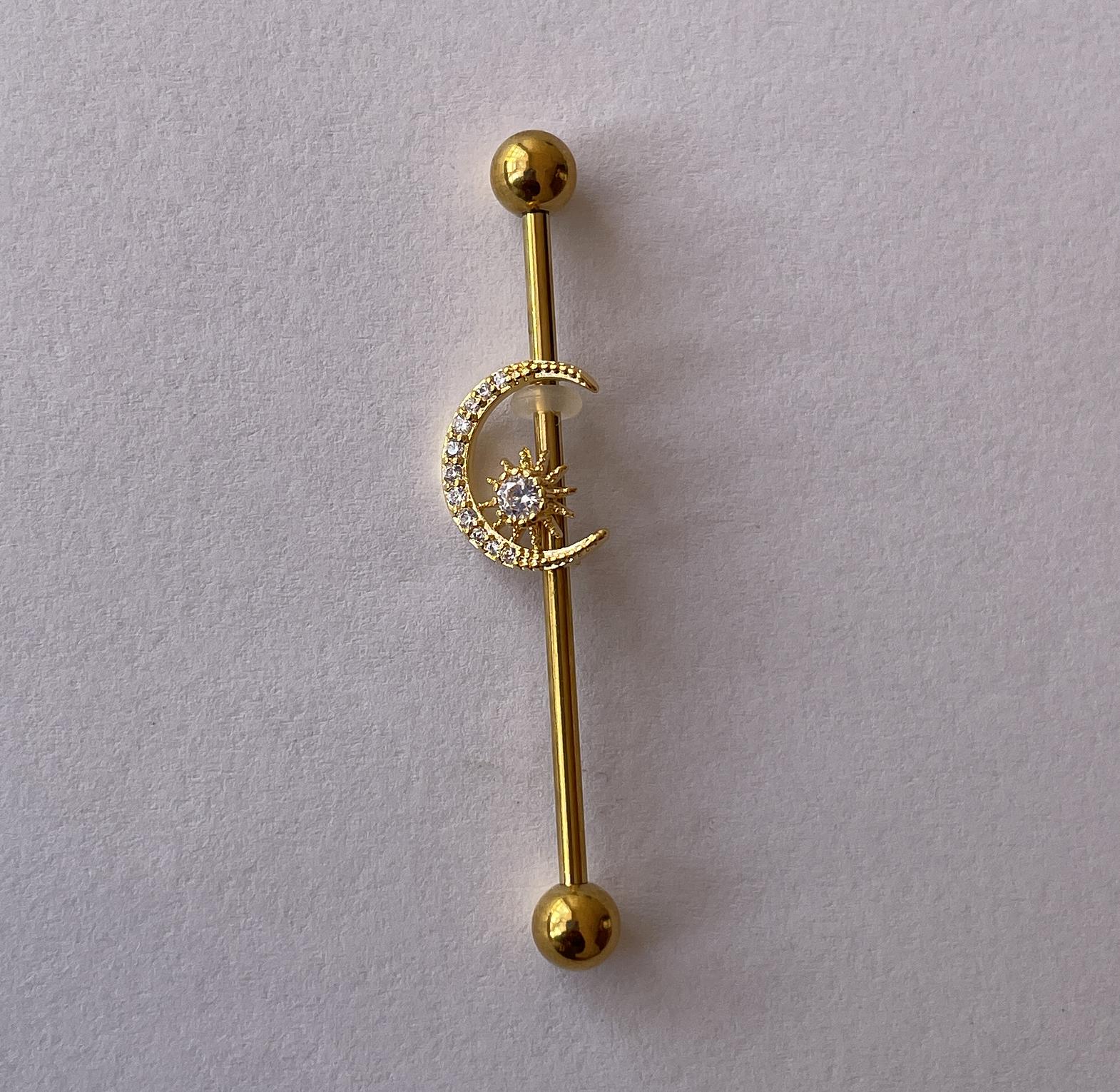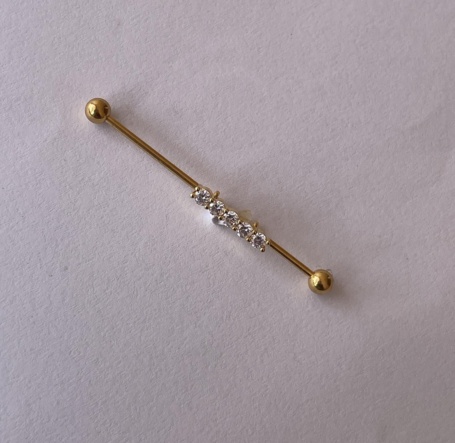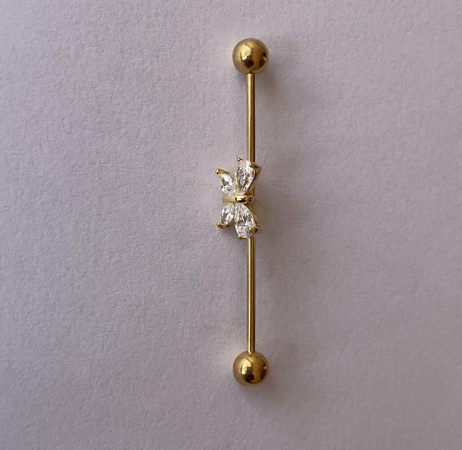 A striking floral dazzling industrial bar that combines edgy body jewelry design with delicate, sparkling detail.