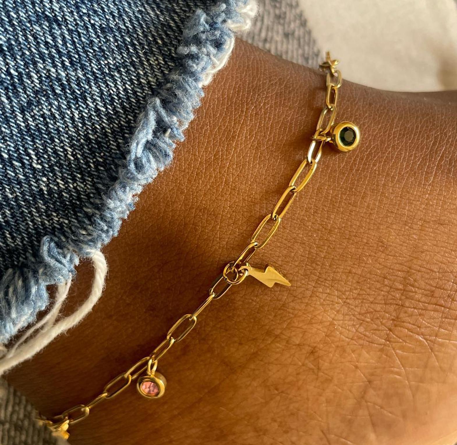 Ignite your style with this trendy anklet featuring a popular paperclip chain and a striking miniature lightning bolt charm. It’s playfully accented with colorful, bezel-set crystal drops for an energetic, modern look.