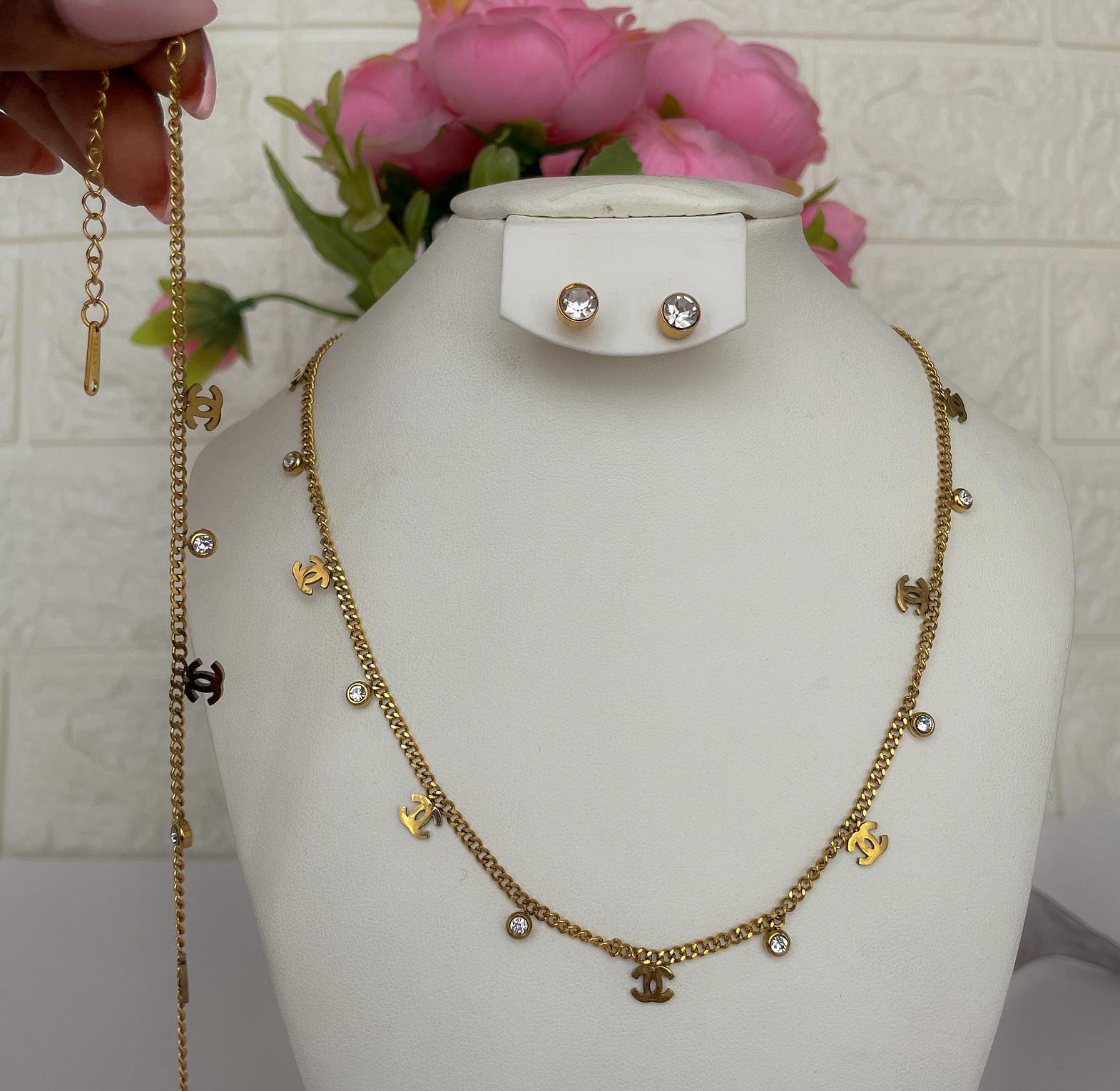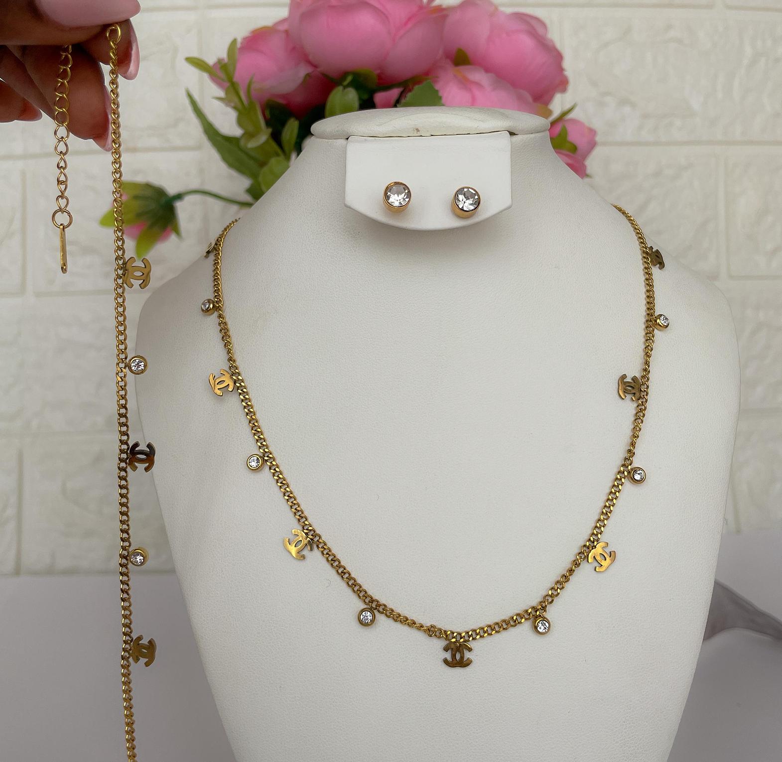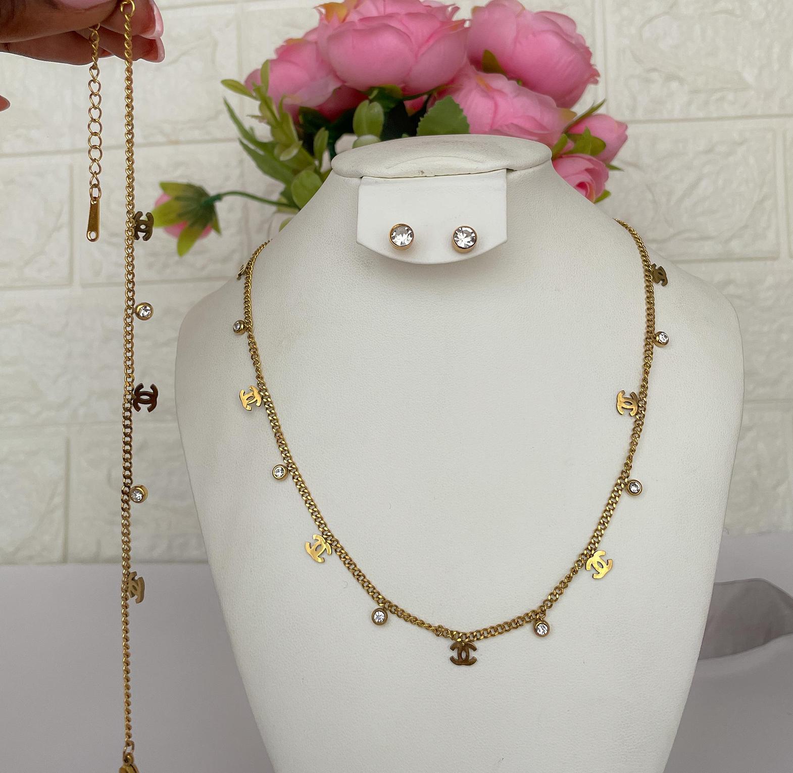 Adorn yourself with the Elegant Interlocking Charm Set, a sophisticated collection featuring iconic 'C' motifs and shimmering accents. This matching necklace, bracelet, and earring set offers a touch of designer-inspired elegance.