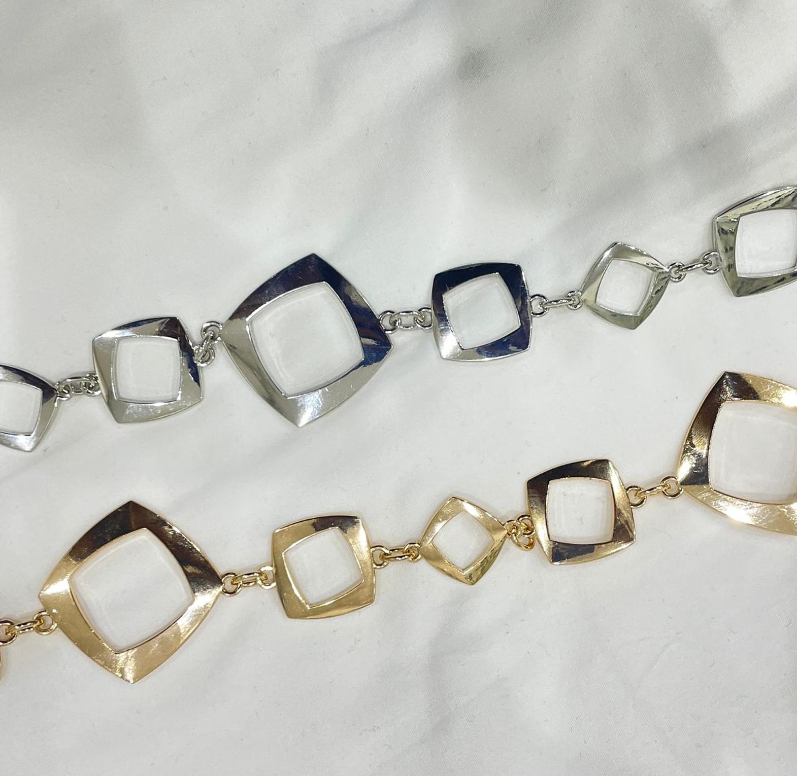 This contemporary geometric square link chain belt delivers modern elegance with its clean-lined design and lustrous metallic finish that complements any fashion-forward wardrobe. Each precisely crafted square link features smooth, polished surfaces that create beautiful light reflection while maintaining a sophisticated minimalist aesthetic perfect for today's style-conscious woman. Available in classic gold and timeless silver finishes, this versatile waist chain belt effortlessly transitions from office wear to evening outfits, making it ideal for cinching blazers, defining loose dresses, or adding structural detail to flowing tops. The durable metal construction ensures long-lasting wear and maintains its mirror-like shine, while the adjustable length accommodates various waist sizes and styling preferences. Whether you're creating a professional look for the workplace or adding geometric interest to casual weekend outfits, this square link chain belt provides the perfect balance of modern design and timeless appeal that enhances both structured and fluid silhouettes with effortless sophistication.