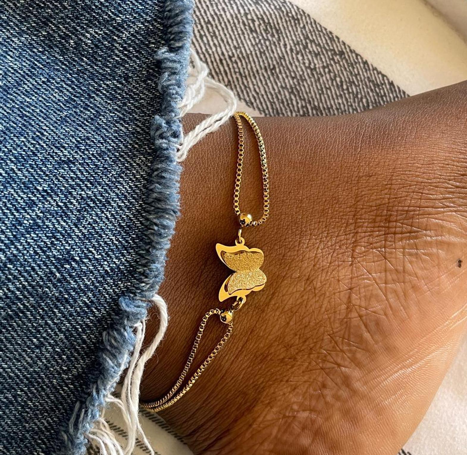 This enchanting layered anklet features a beautiful, textured butterfly charm centered between two fine chains. The subtle sparkle of the charm adds a whimsical, sophisticated focal point to your foot.
