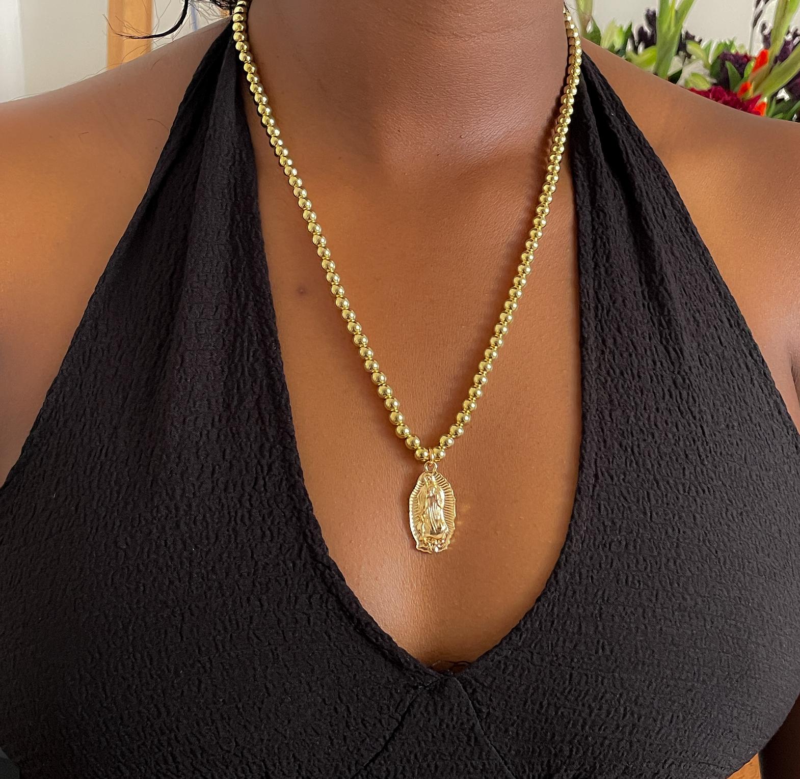 Channel divine energy and warmth with our Gold Guadalupe Pendant Necklace. Featuring polished gold beads and a radiant Virgin of Guadalupe medallion, this eye-catching necklace celebrates tradition while offering a modern, stylish twist. Ideal for everyday wear, its classic design brings a touch of sacred charm to any look.
