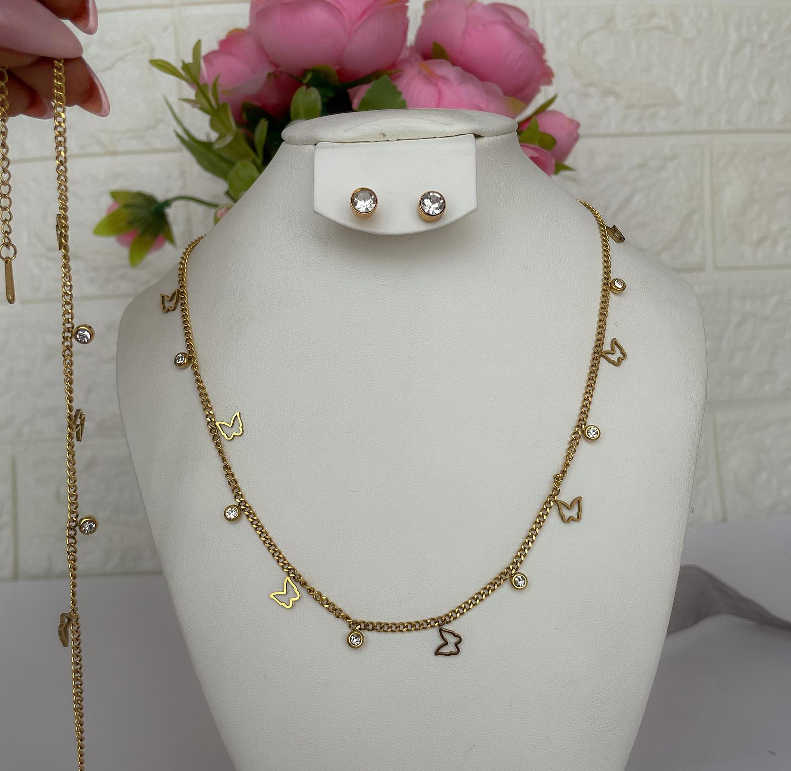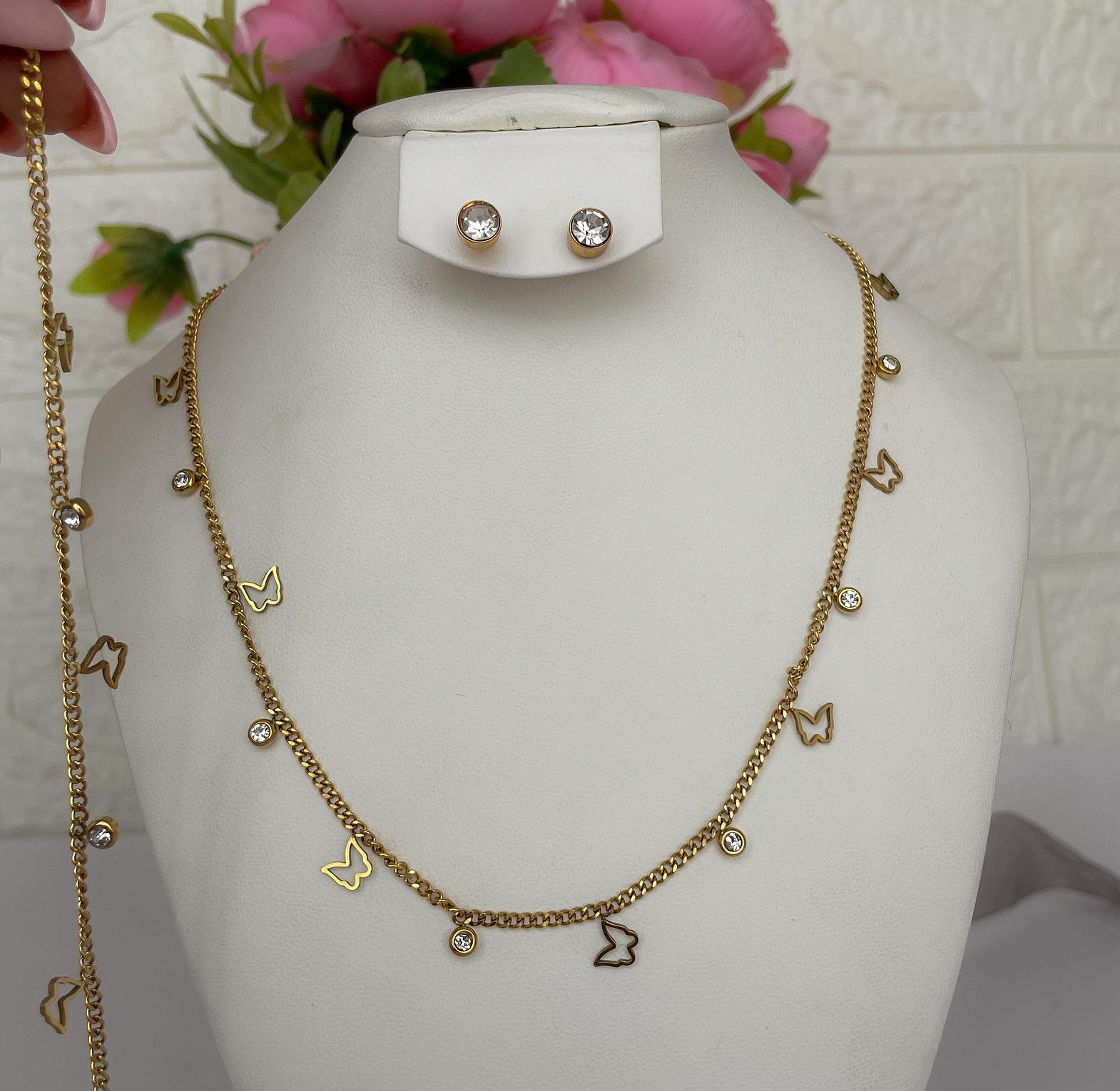 Adorn yourself with the delightful Golden Flutter & Sparkle Set, featuring graceful butterflies and shimmering accents. This charming necklace, bracelet, and earring collection offers a touch of whimsical elegance to any look.
