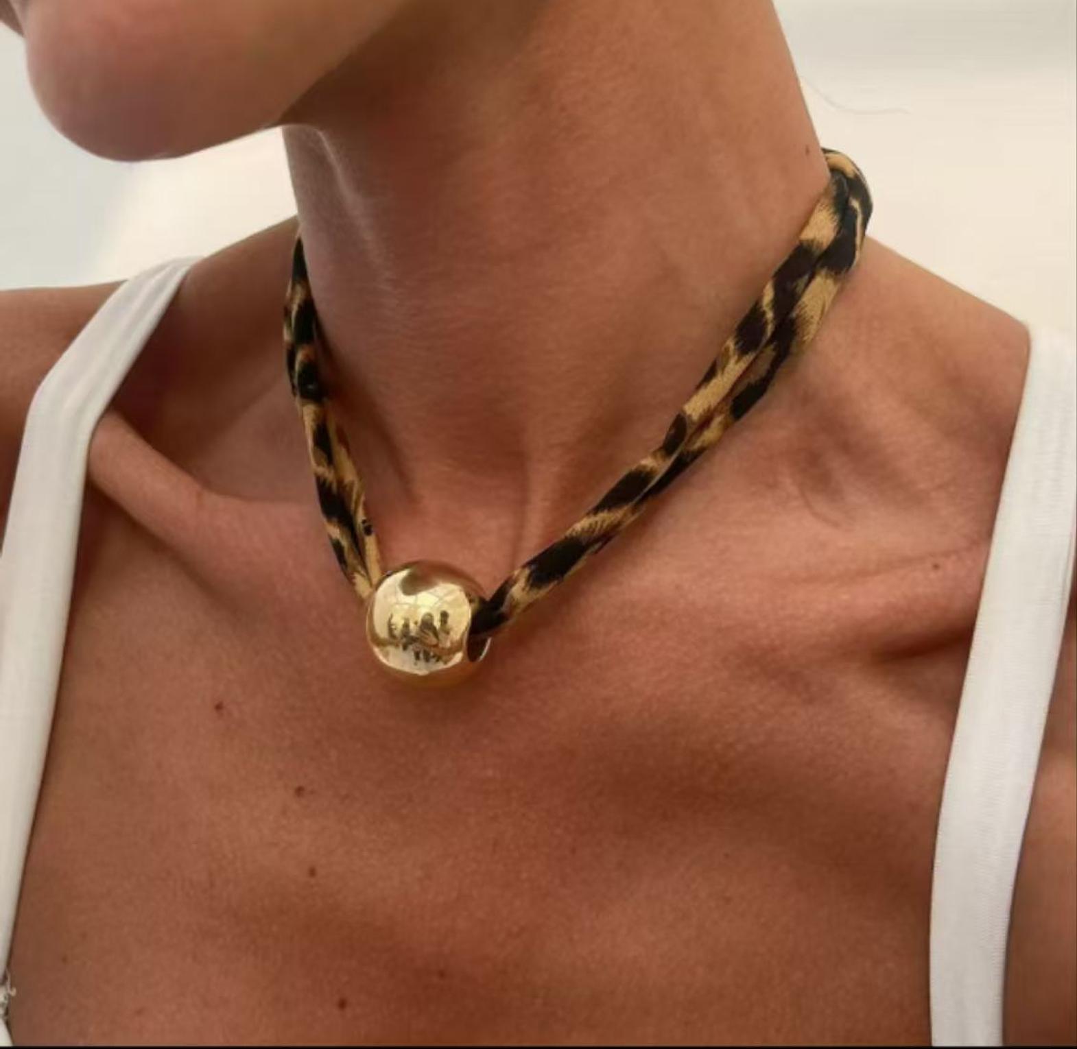 A sleek gold-toned circular pendant featuring a distinctive hammered texture that creates beautiful light reflection, suspended from a bold leopard print fabric chain. This minimalist yet striking piece combines modern sophistication with wild fashion flair for effortless everyday elegance.