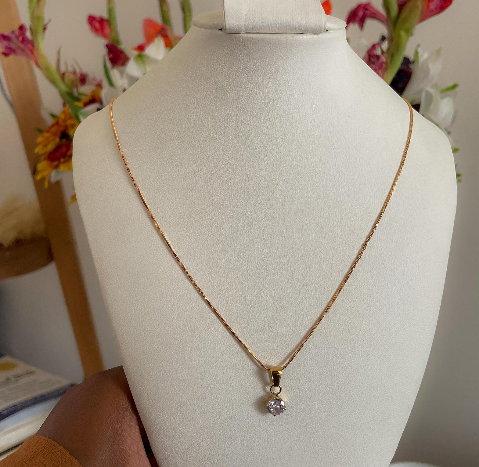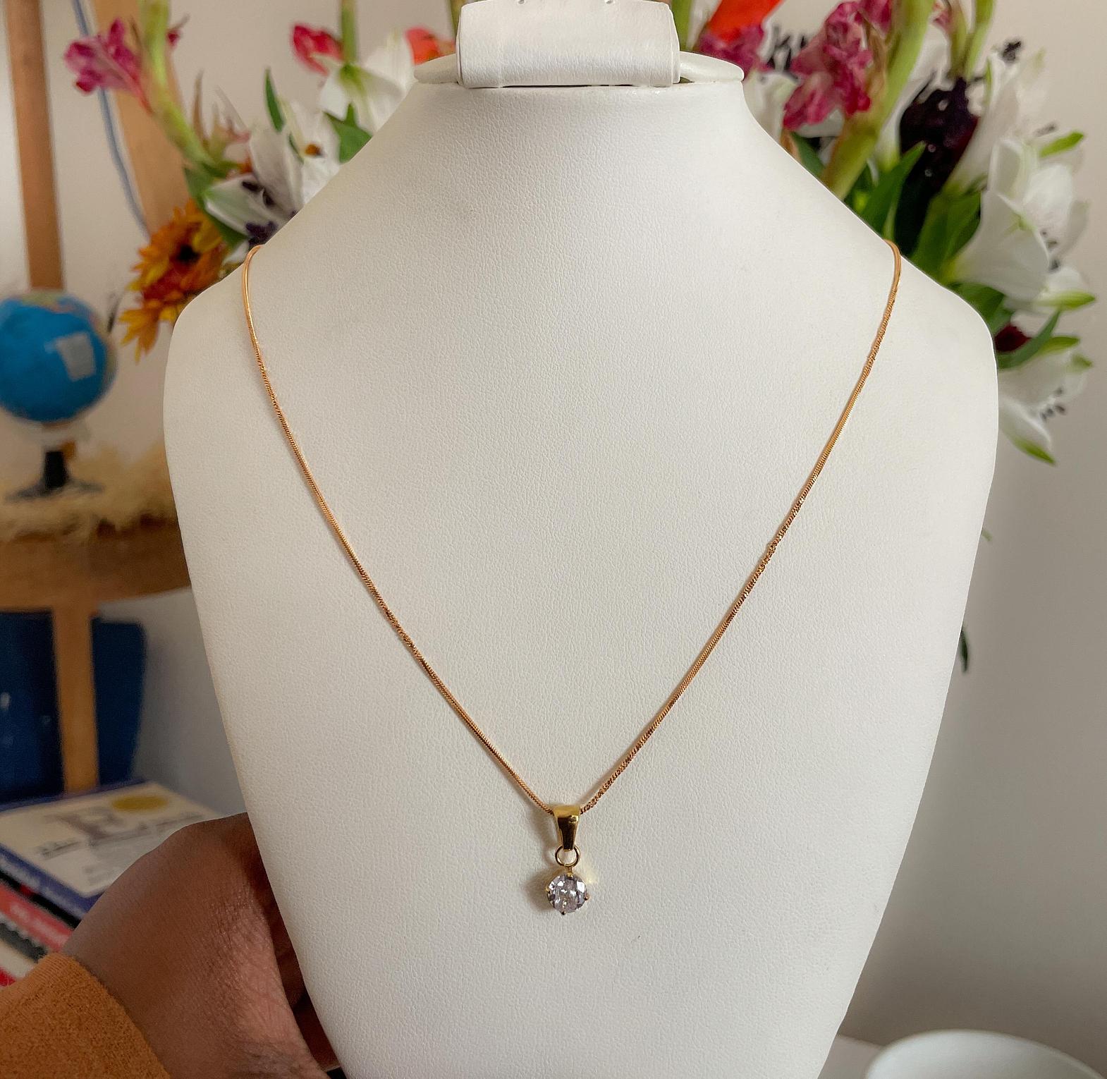 Embrace minimalist elegance with the Golden Solitaire Gleam Necklace, featuring a single, captivating cubic zirconia. This refined piece offers understated brilliance for every occasion.