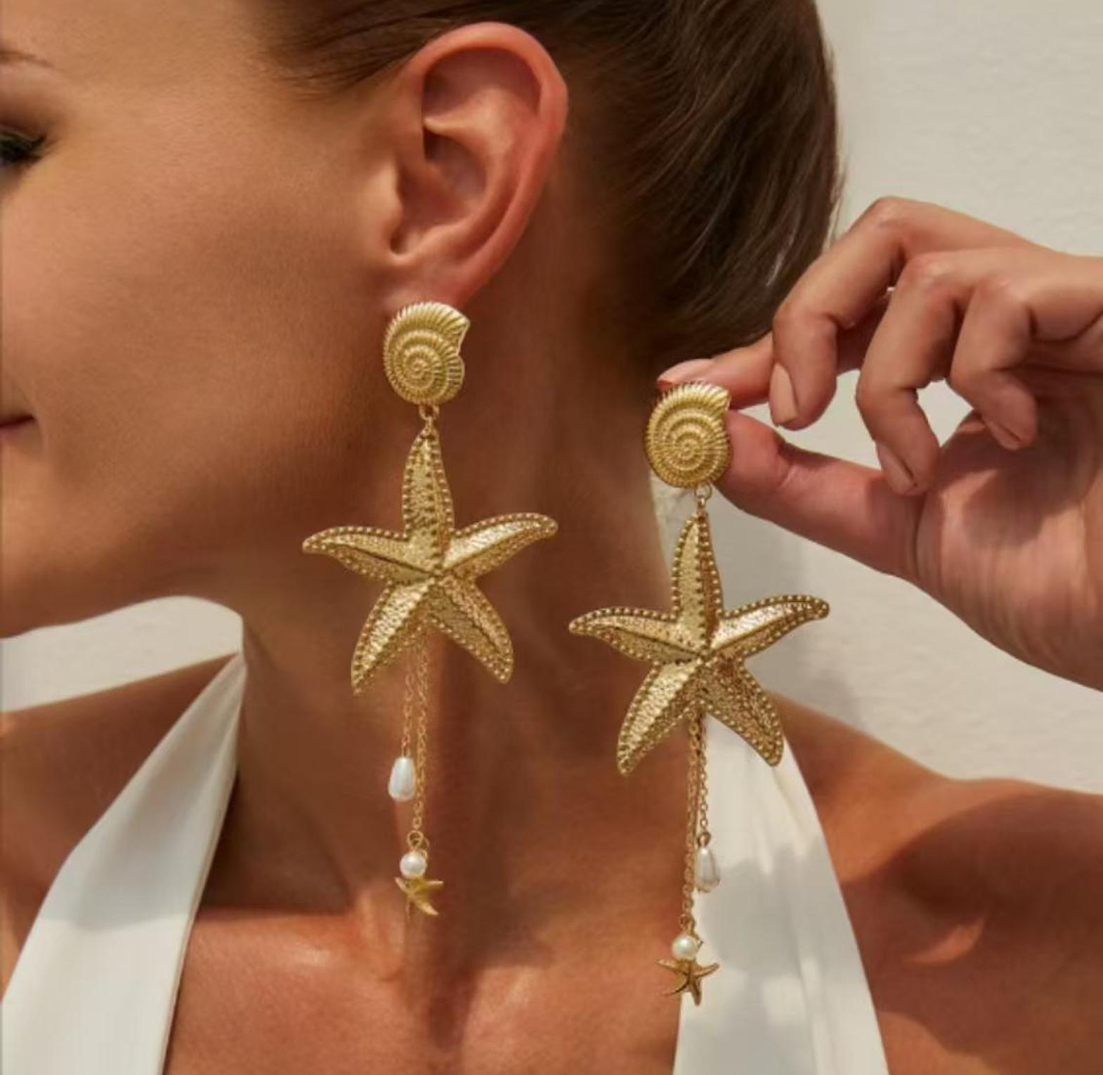 Make a striking statement with these opulent gold-toned earrings, featuring large textured starfish, cascading pearls, and a unique spiral shell stud. Perfect for commanding attention with a touch of glamorous seaside charm.