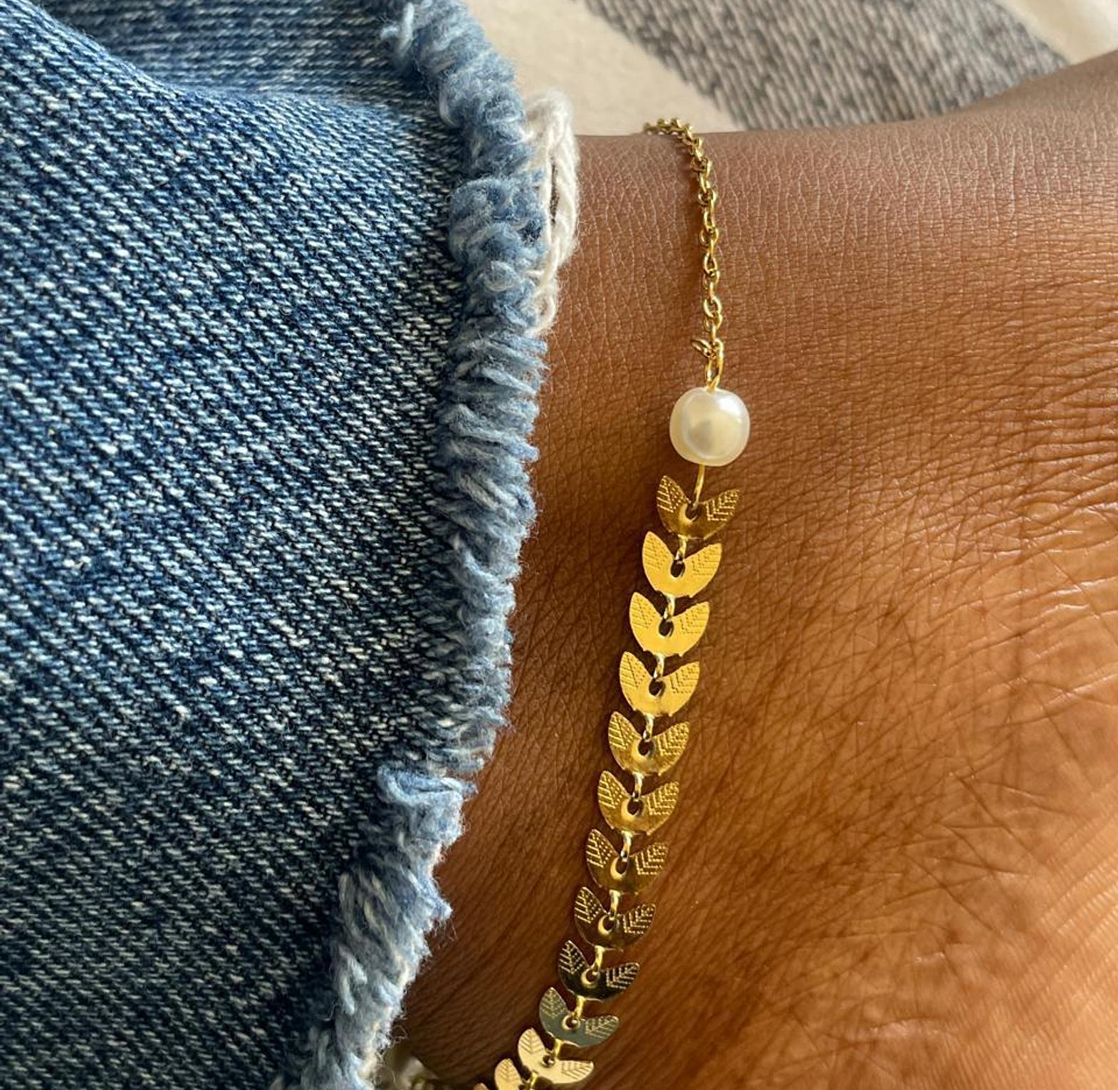 This elegant piece combines a flowing gold-plated leaf chain with a single, lustrous pearl for sophisticated contrast. It's a timeless accessory that perfectly blends natural beauty with refined polish.