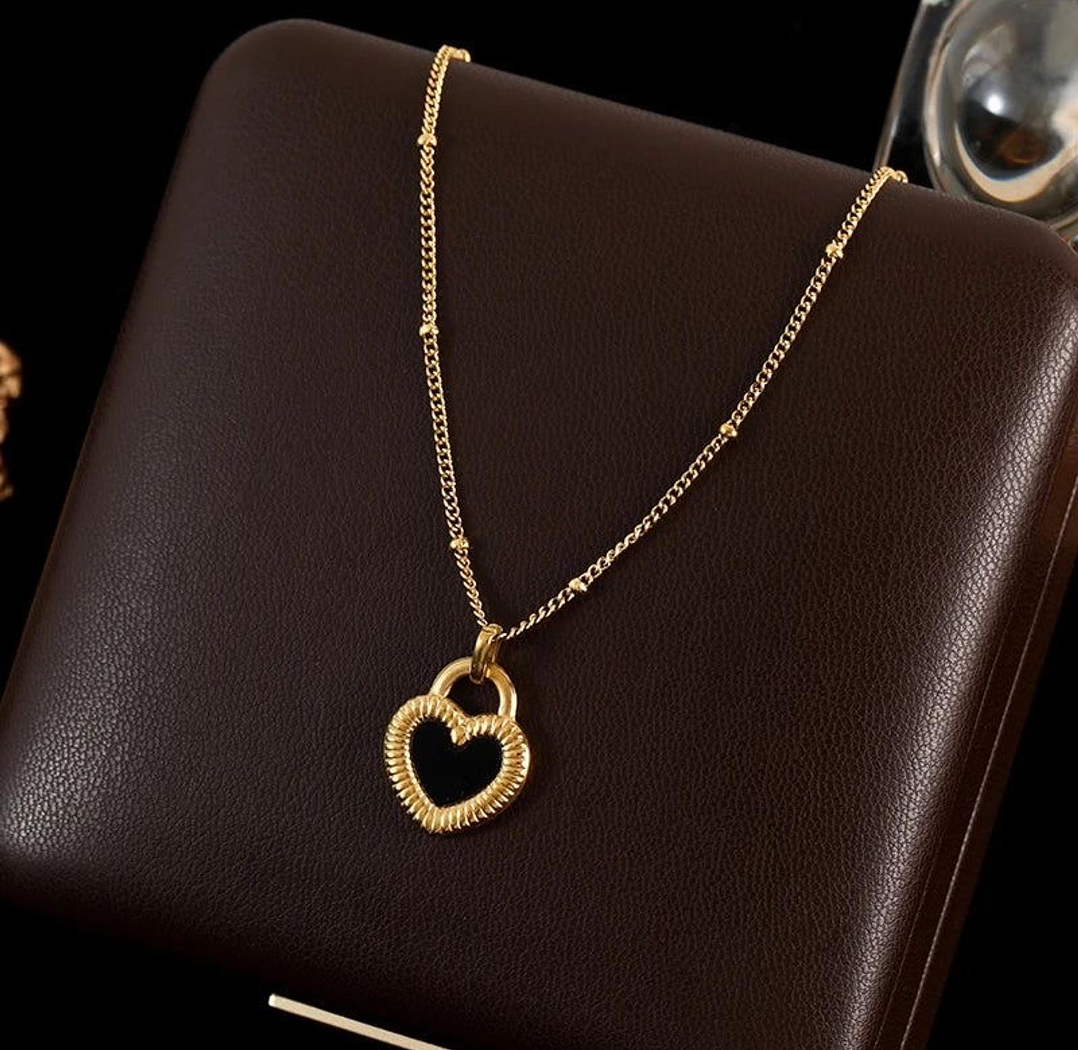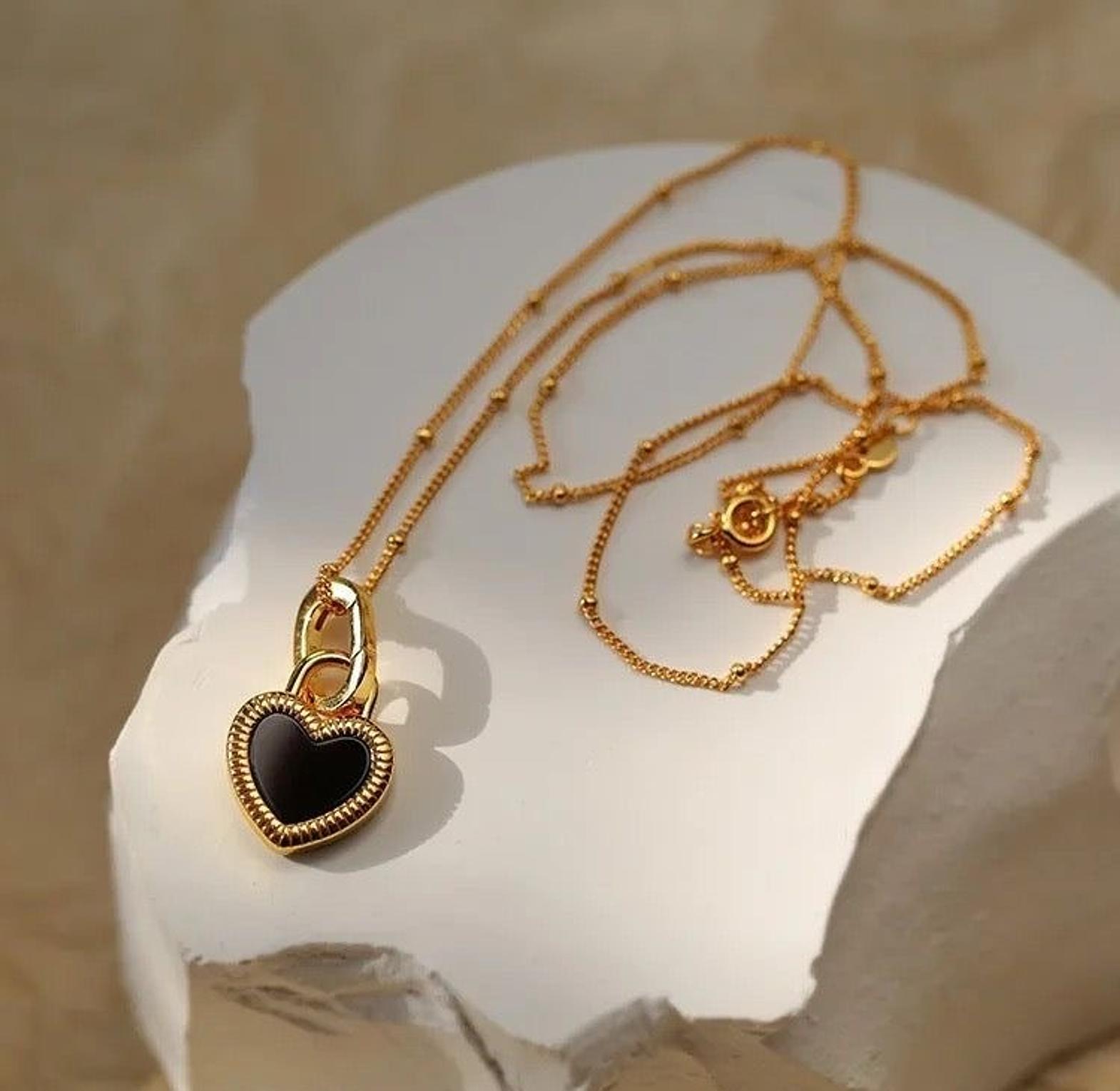 A bold yet romantic black heart padlock pendant necklace, finished in 18K gold plating for a striking contrast of edge and elegance.