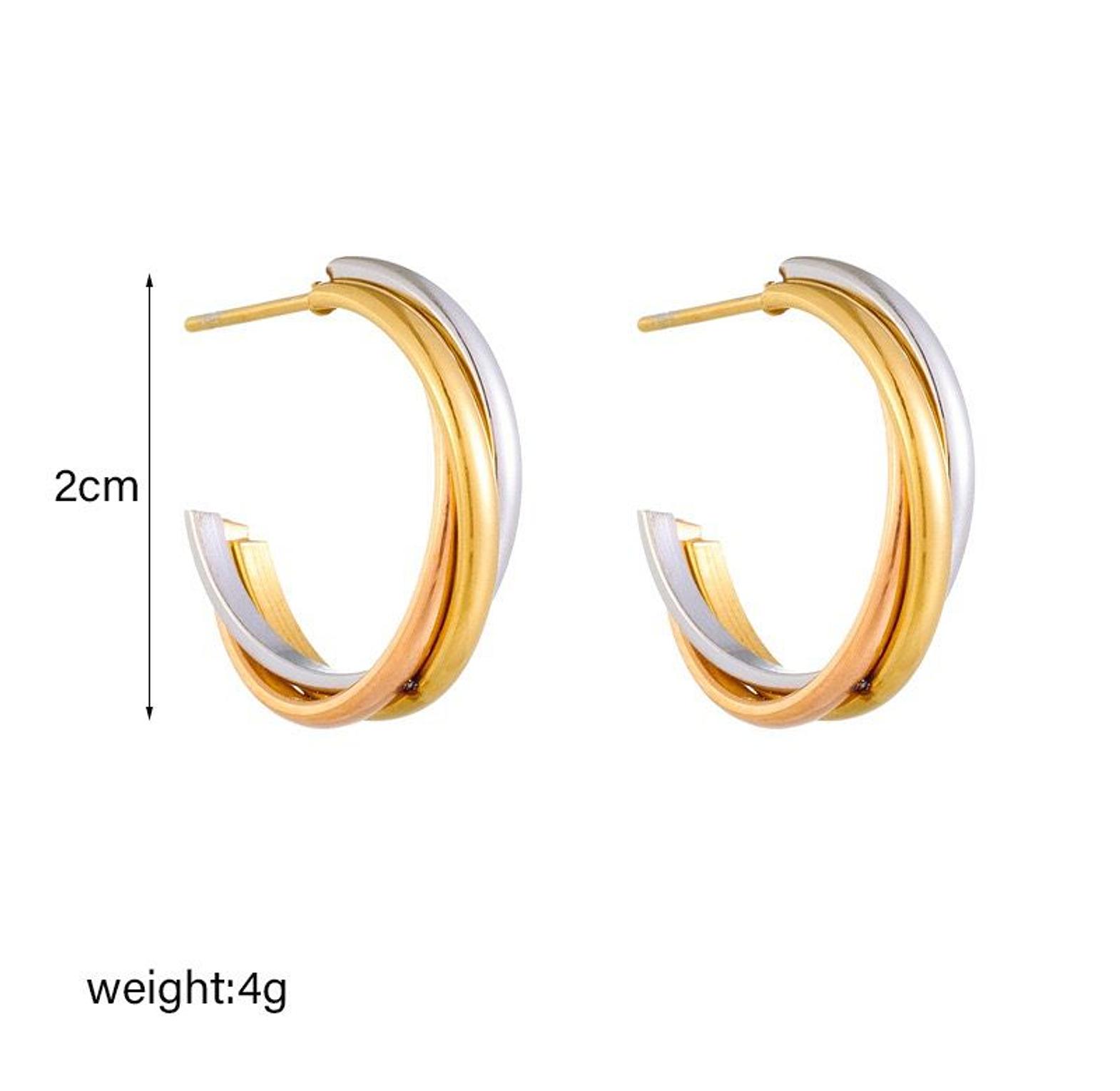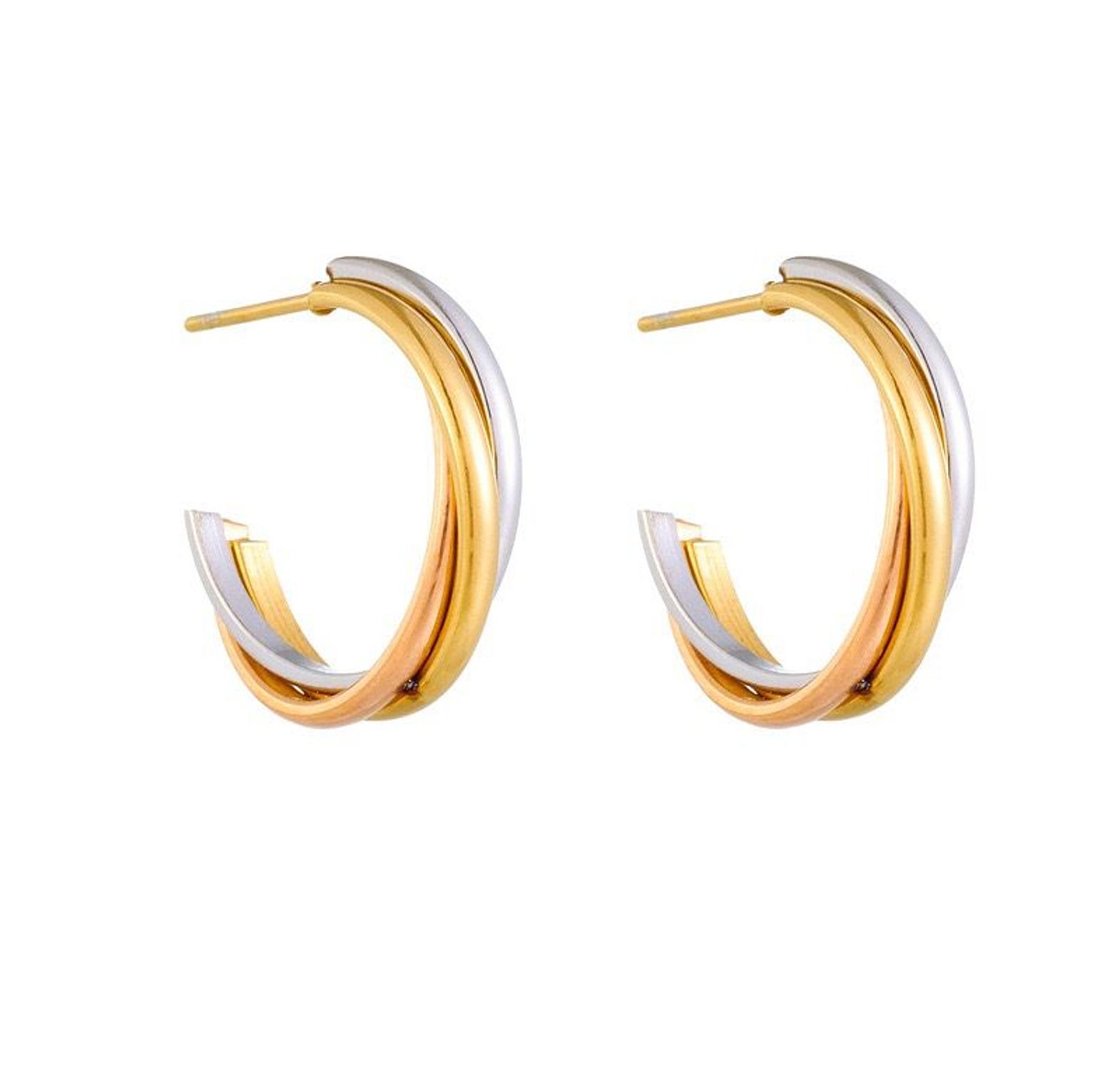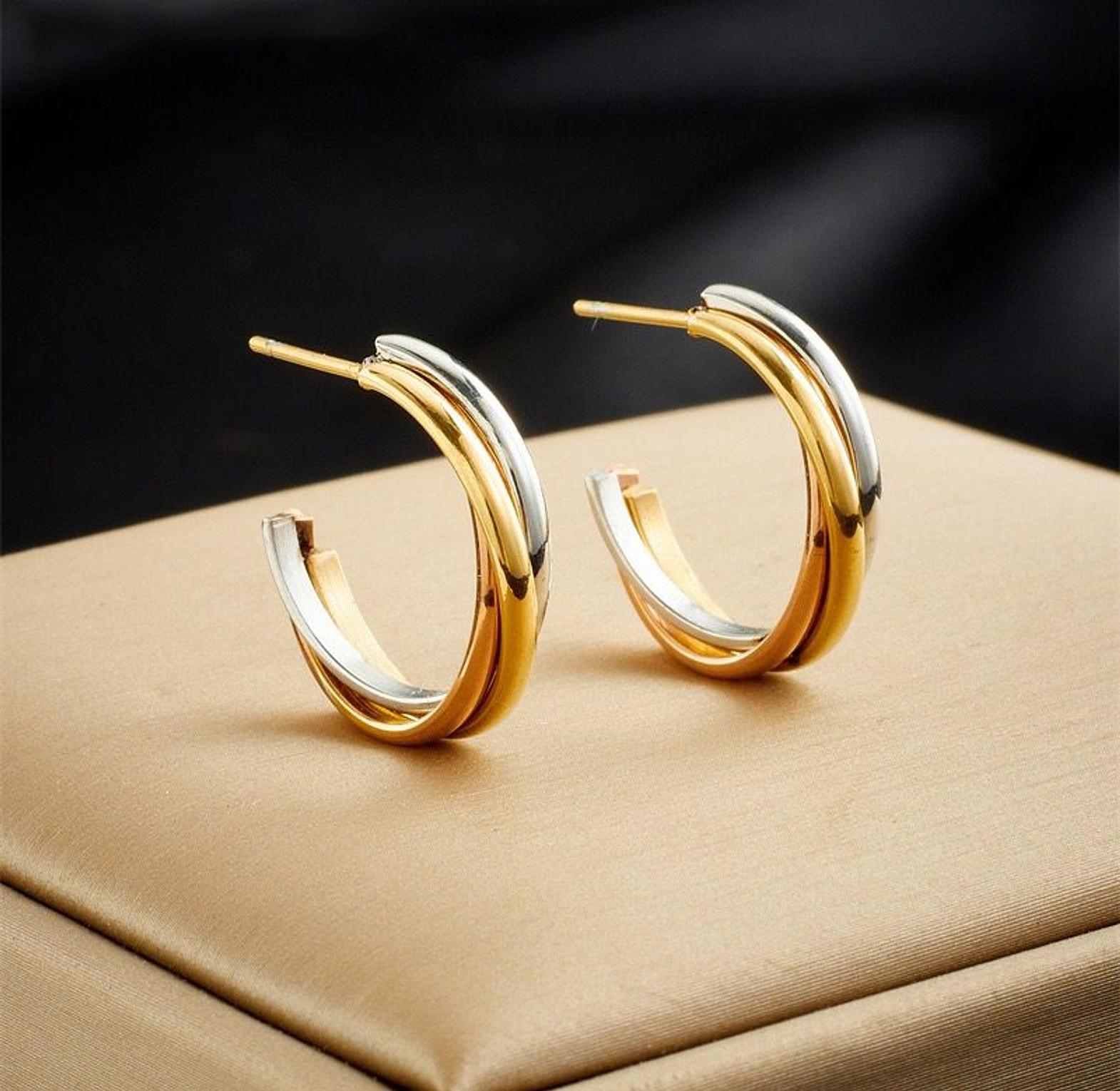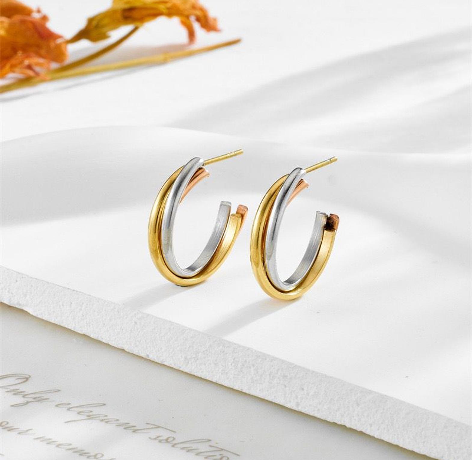 These elegant hoops create a captivating dual-tone effect by gracefully intertwining gold and silver bands. A perfect accessory for those who love to mix metals with sophisticated flair.