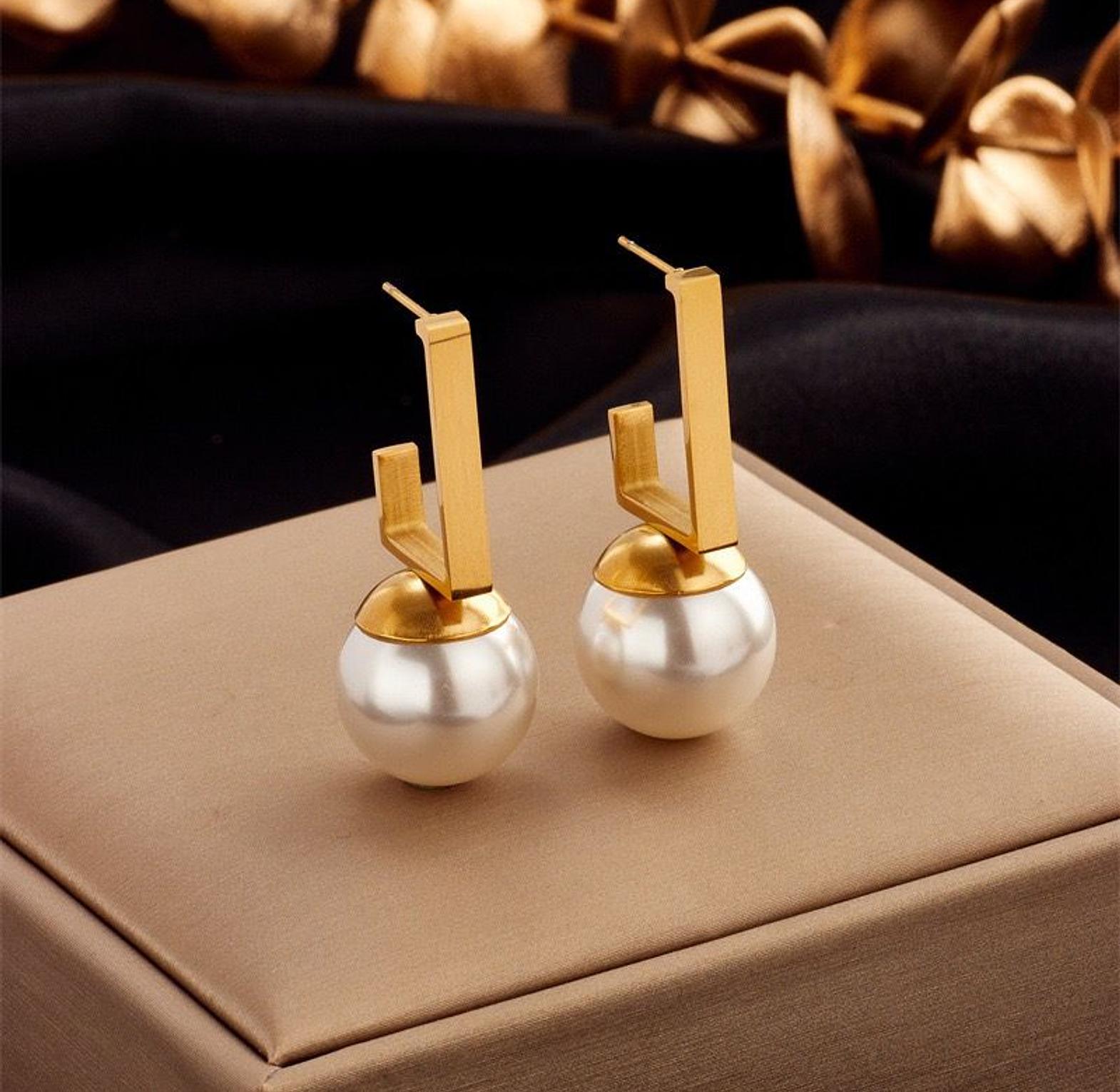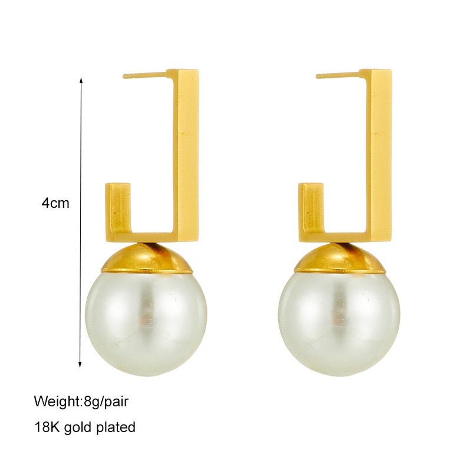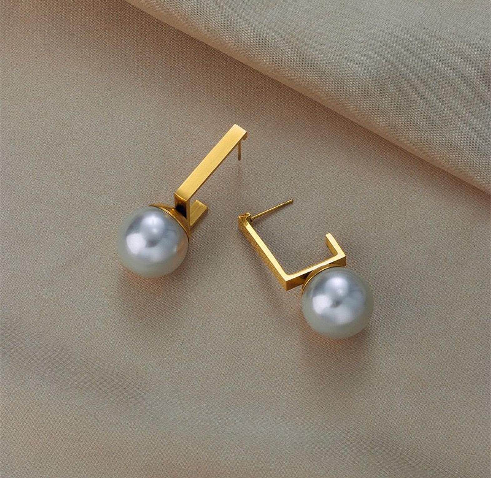 Experience a blend of classic elegance and modern design with these striking earrings. A bold gold square suspends a lustrous faux pearl, creating a look that is both artistic and sophisticated.