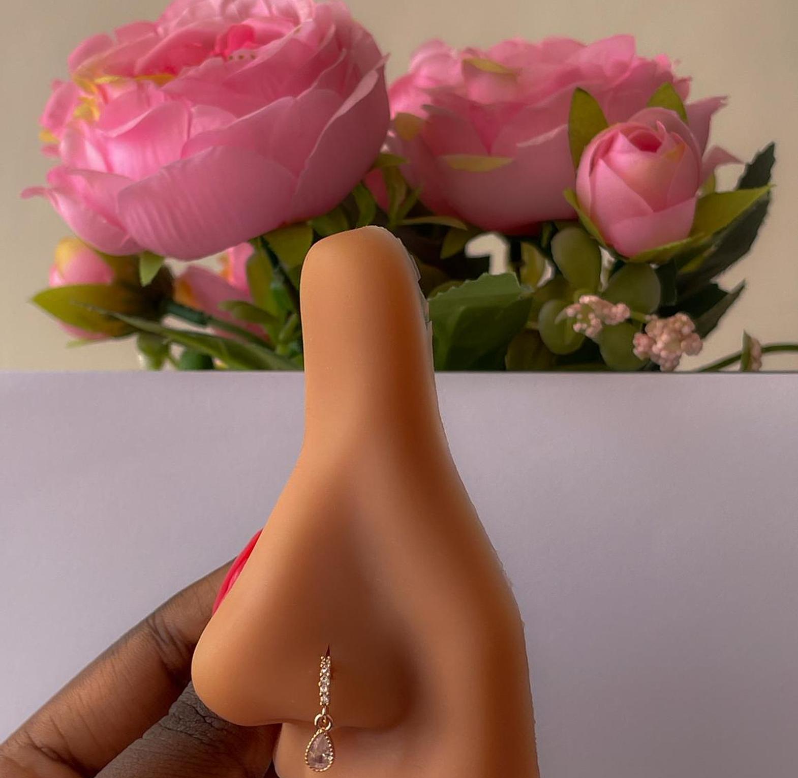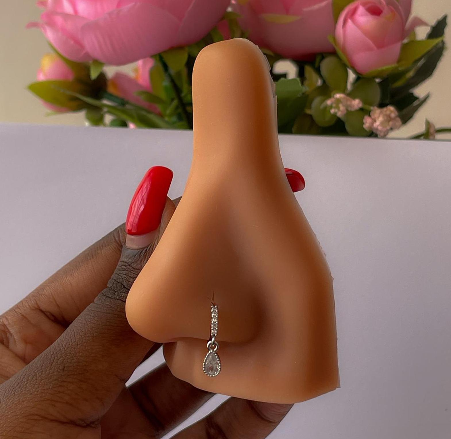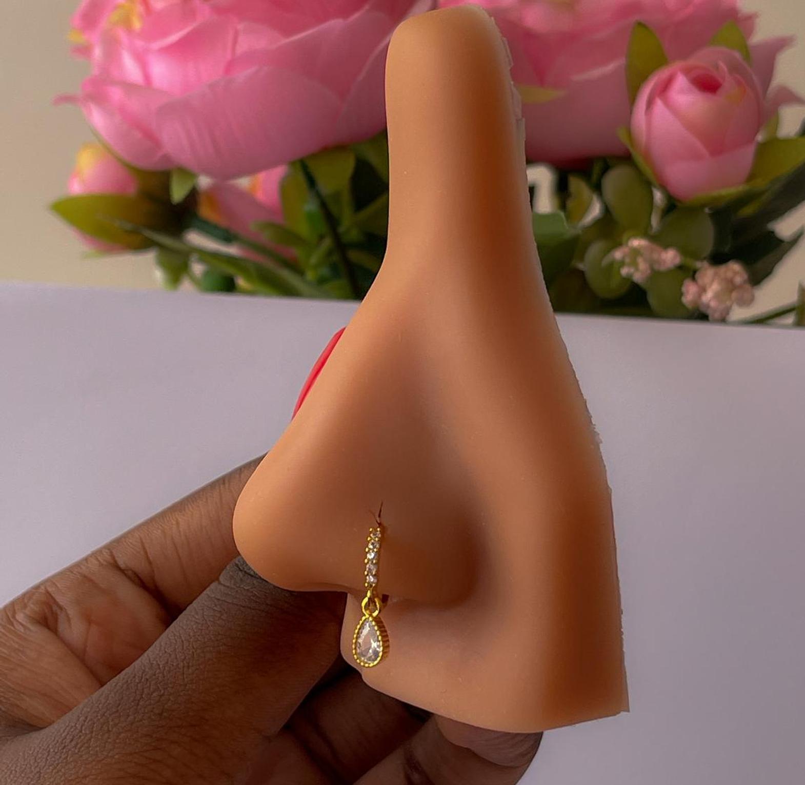 Adorn your nose piercing with this exquisite pear-shaped drop nose ring, featuring a brilliant faceted cubic zirconia. Available in stunning silver, gold, and rose gold finishes.