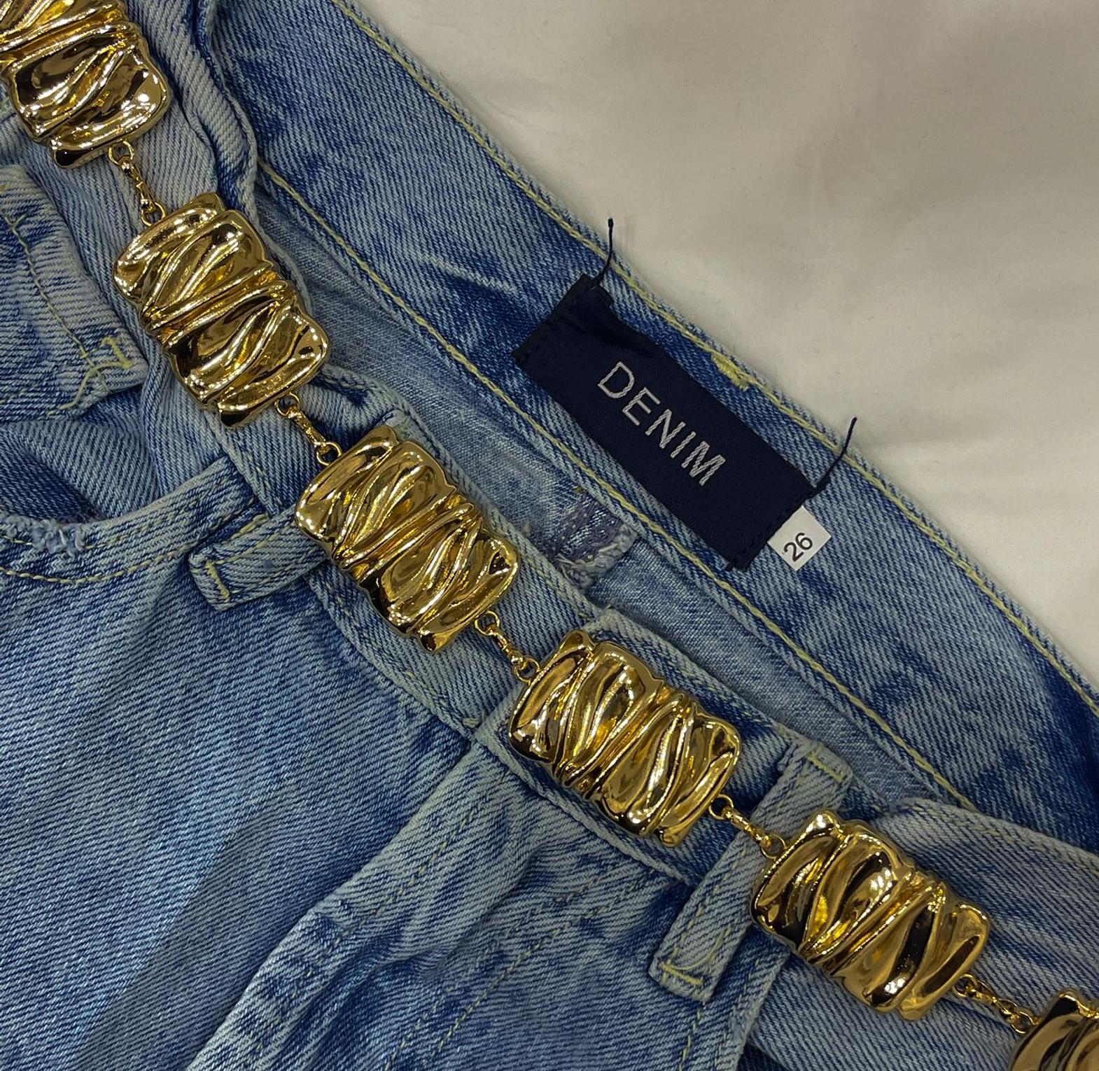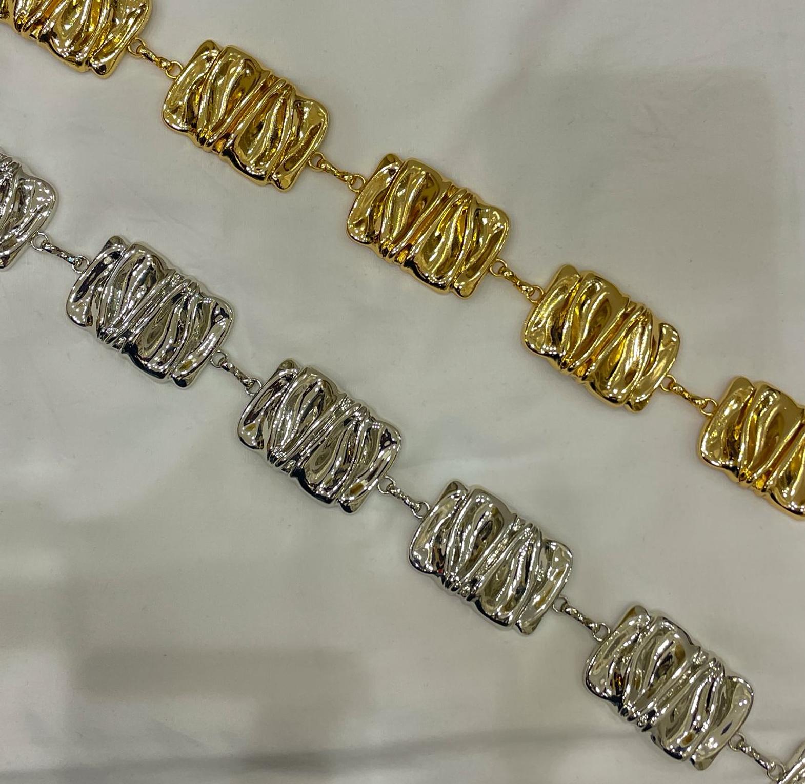 The Luxe Ribbed Chain Waist Belt elevates any ensemble with its striking geometric design featuring chunky rectangular links adorned with vertical ribbed texturing that creates captivating light reflection and visual depth. Available in lustrous gold-tone and silver-tone finishes, this statement waist belt combines modern minimalist aesthetics with luxurious metallic shine, making it ideal for defining silhouettes over dresses, blazers, oversized shirts, or cardigans. Each rectangular link measures approximately 25mm in length and features smooth connecting joints that ensure comfortable wear and flexible movement around the waist. The substantial weight and premium construction provide durability while the adjustable chain design accommodates various waist sizes and styling preferences. This versatile accessory seamlessly transitions from casual streetwear to evening elegance, making it essential for fashion-conscious women who appreciate bold metallic accents, contemporary geometric designs, and statement pieces that instantly transform basic outfits into polished, sophisticated looks.