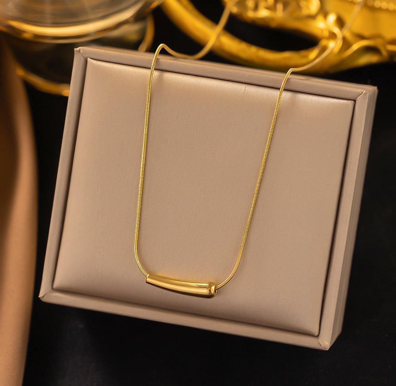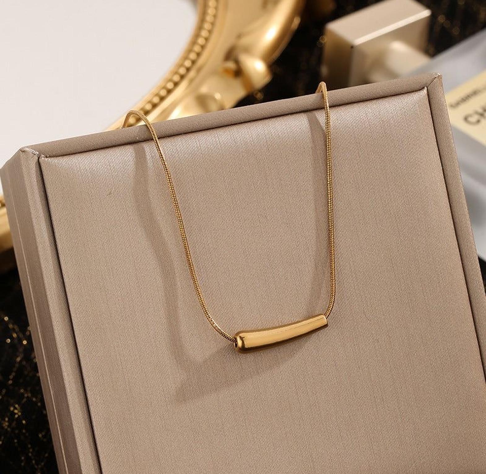 A sleek 18K gold plated necklace featuring a minimalist horizontal bar pendant for timeless, everyday elegance.