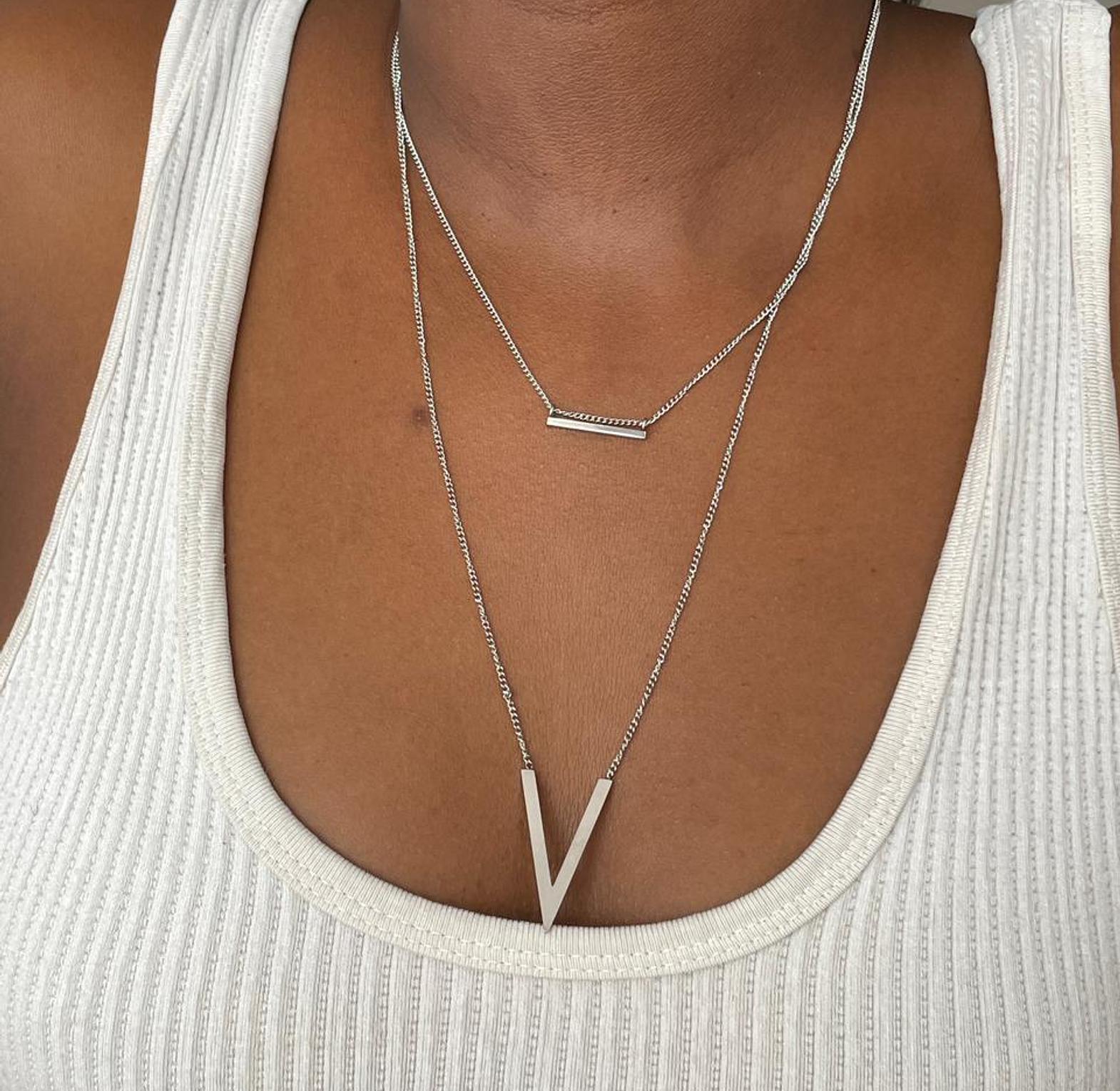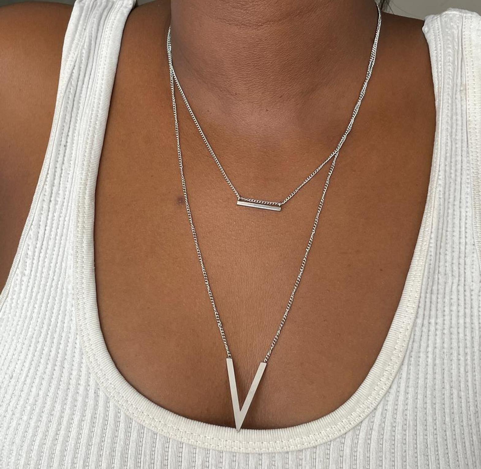 Adorn your neckline with this sleek multi-layered silver necklace, featuring a modern bar pendant and a striking V-shaped charm. This contemporary piece offers sophisticated geometry for an effortlessly chic look.