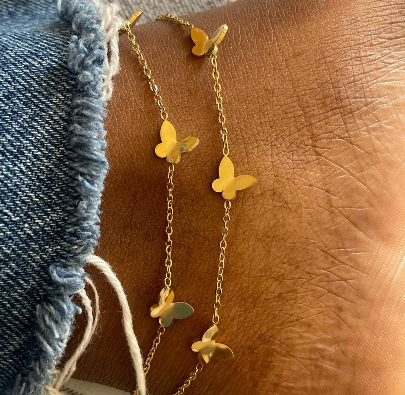 Celebrate transformation and freedom with this stunning anklet featuring delicate fluttering butterfly charms. Crafted for durability, it adds a whimsical, golden touch to your everyday style.