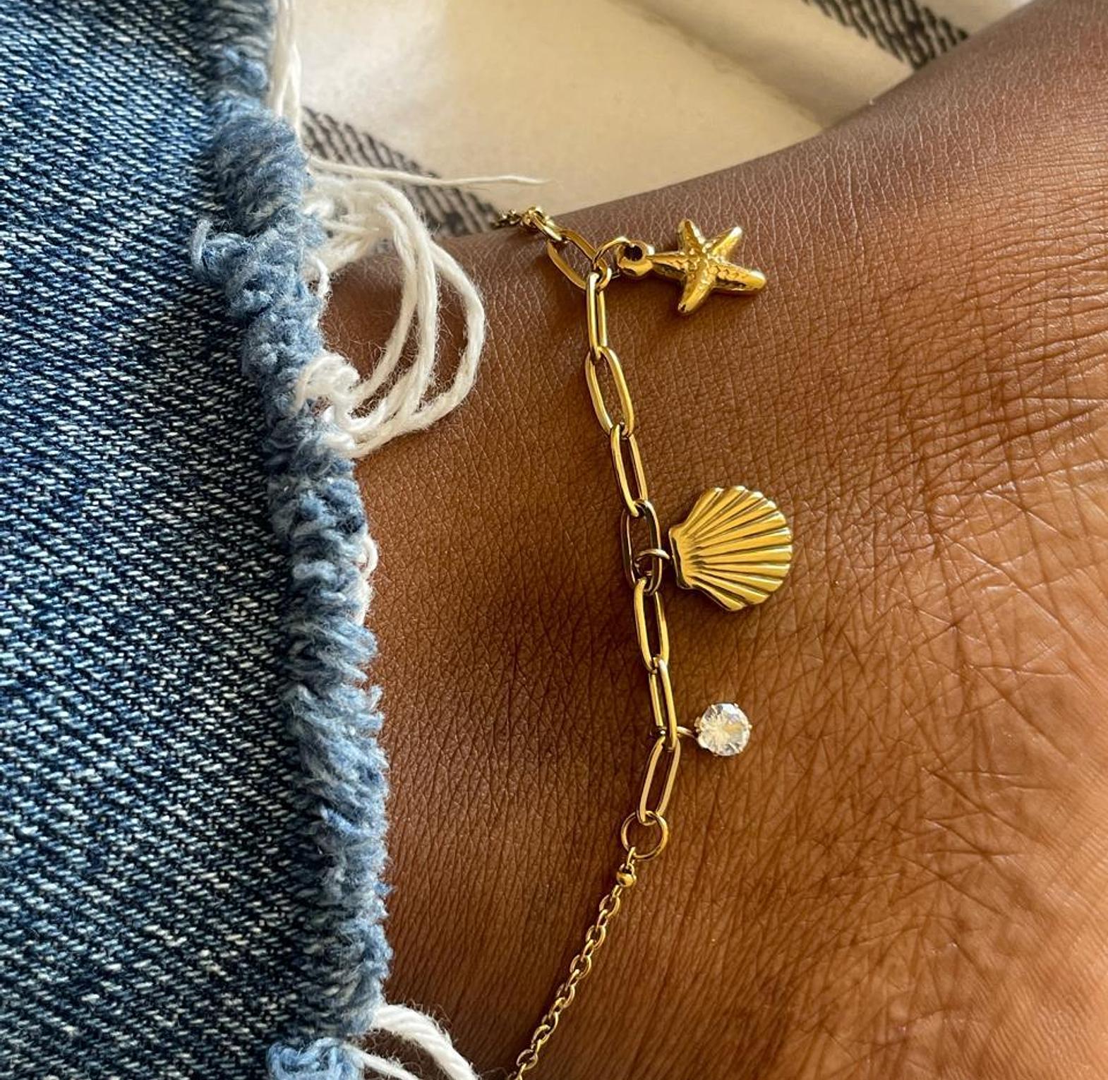 Dive into effortless style with this charming anklet featuring a mix of chains adorned with starfish, shell, and dazzling crystal charms. It's a playful tribute to the sea, perfect for sunny days.