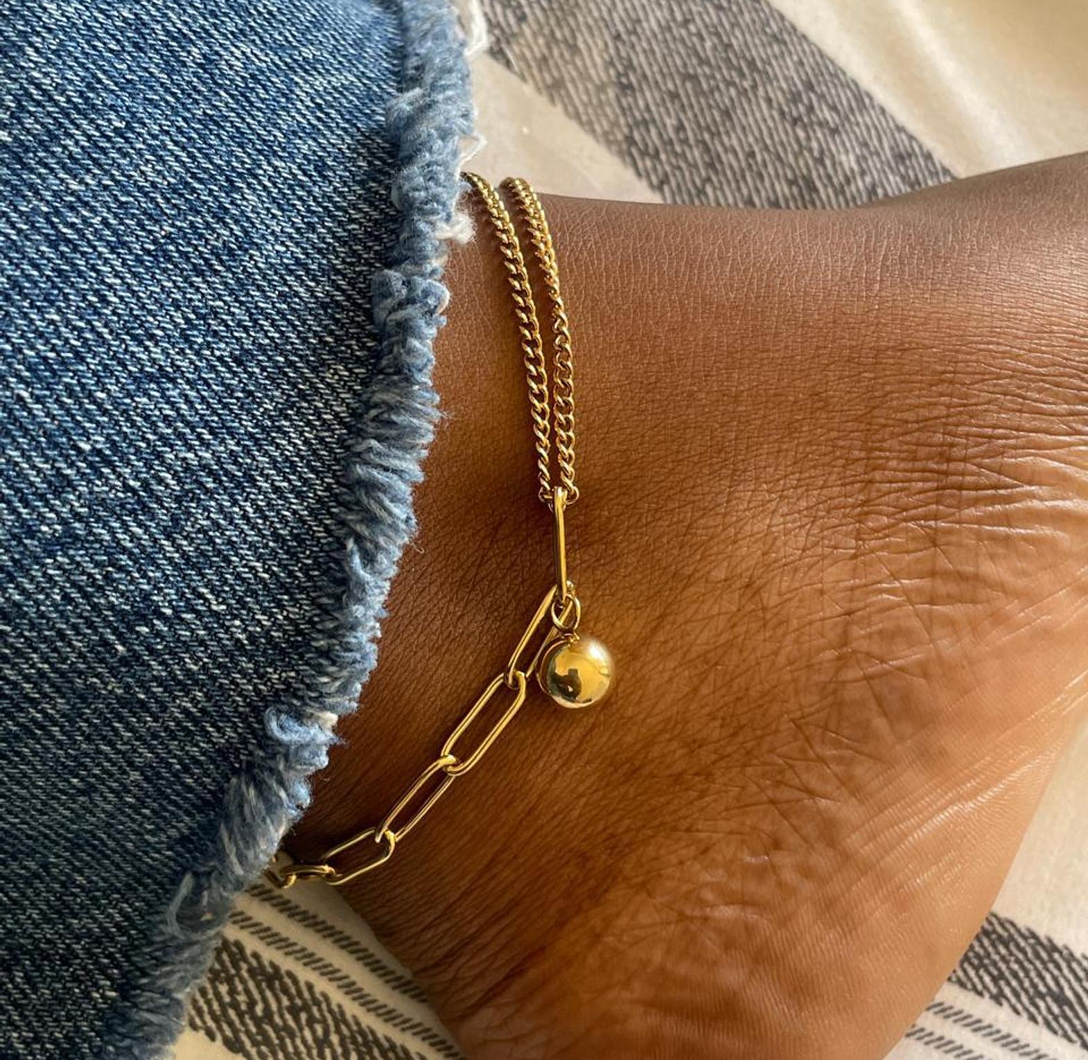 Featuring a contemporary blend of curb and paperclip chains, this dual-strand anklet makes a modern statement. The single polished gold sphere adds a captivating, weighted movement to the design.