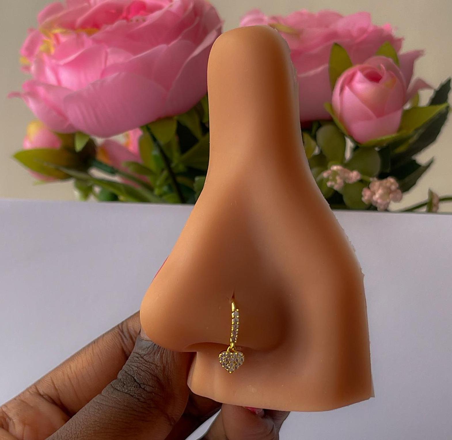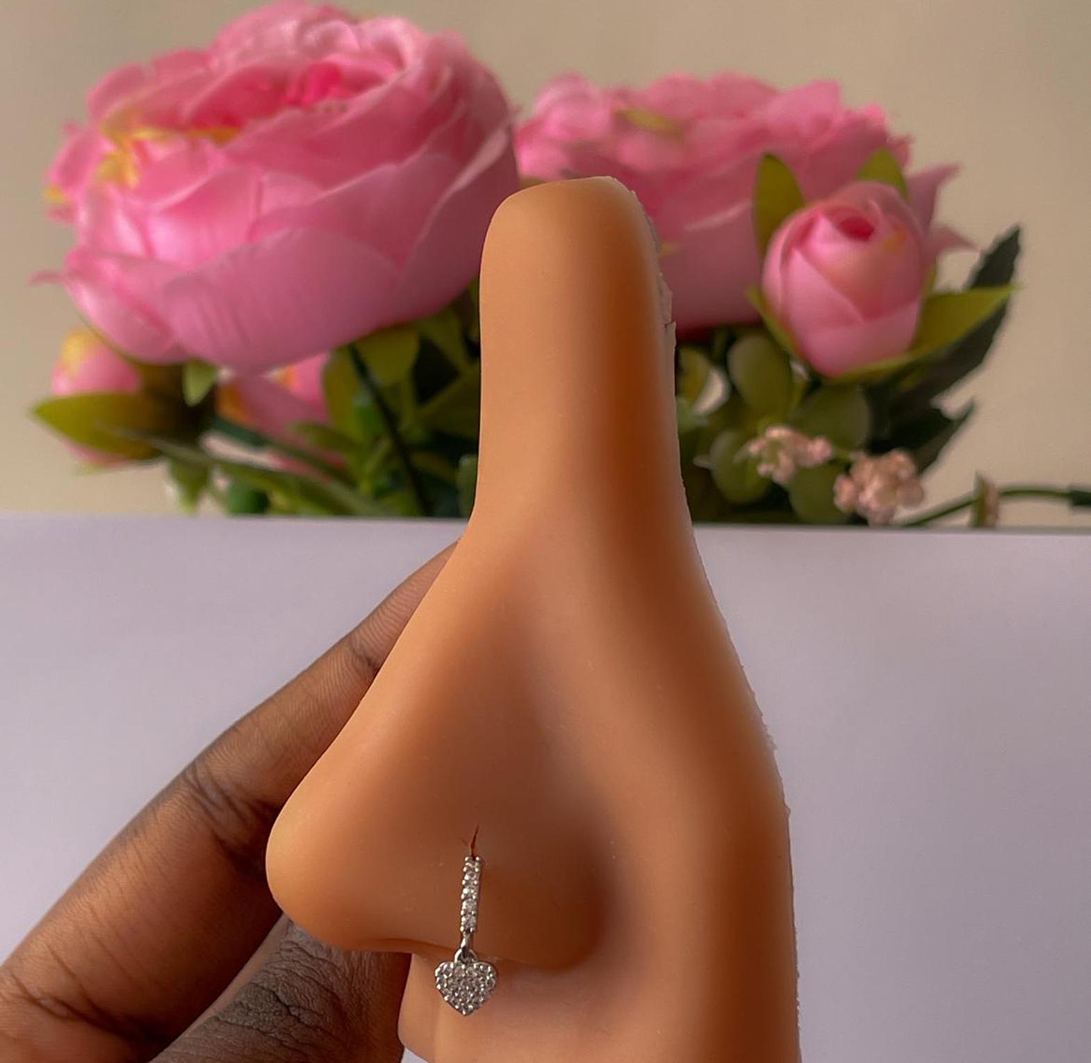 Express your style with this charming heart dangle nose ring, featuring a sparkling pave-set heart. Available in sleek silver, radiant gold, and romantic rose gold.
