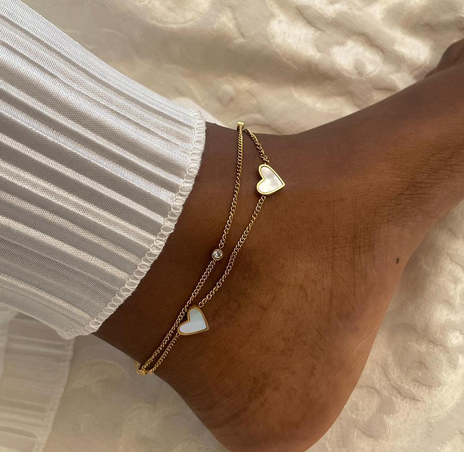 Showcasing two delicate chains with shimmering mother-of-pearl heart charms, this layered anklet captures romance and ethereal beauty. A small crystal adds a final touch of brilliant, captivating sparkle.