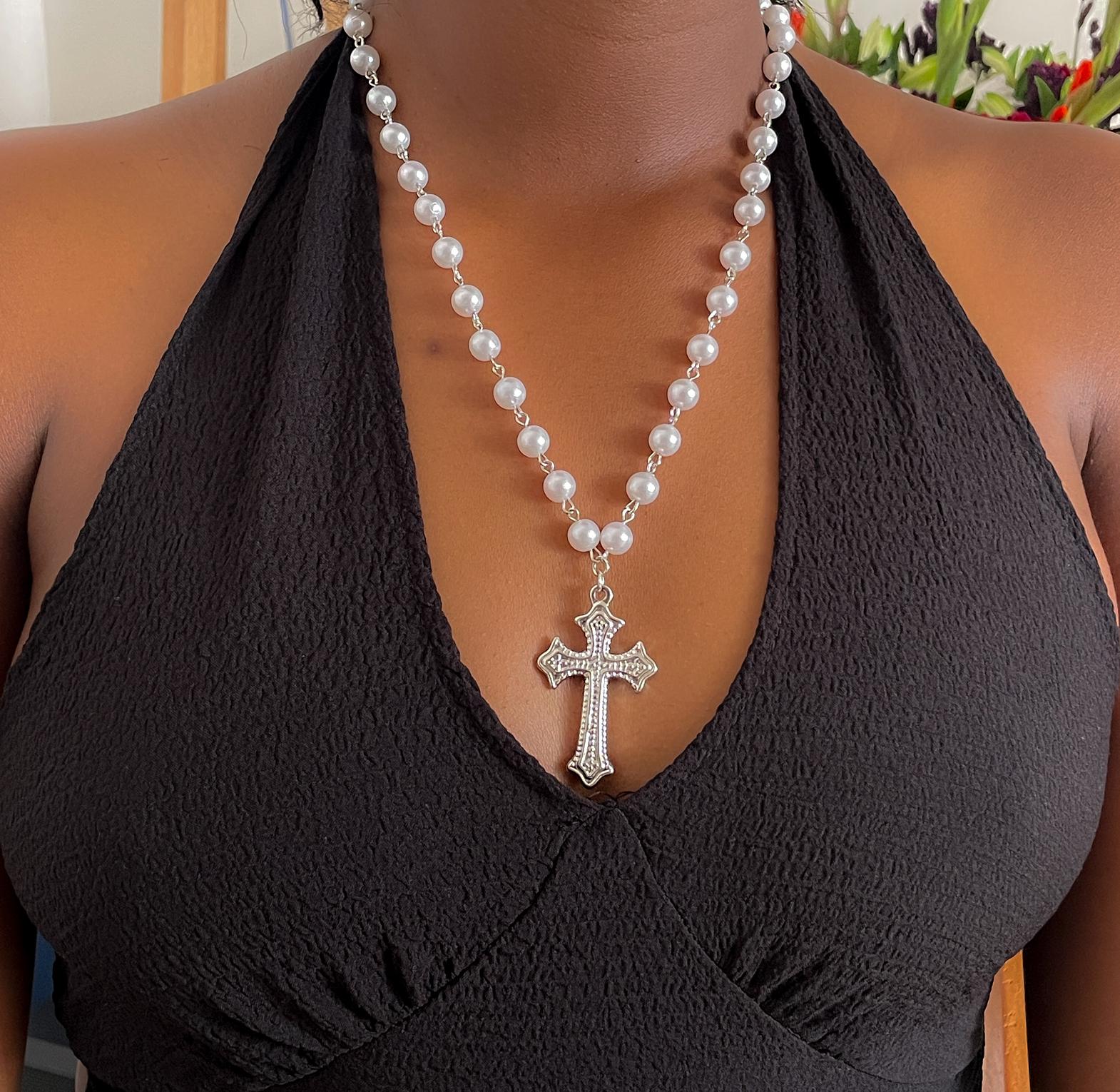 Embrace timeless elegance with our Pearly Cross Rosary Necklace. Adorned with lustrous white beads and a stunning silver-finished cross pendant, this handcrafted piece elevates any outfit — whether worn casually or styled for a formal occasion. Perfect as a thoughtful gift or a personal keepsake of faith and beauty.