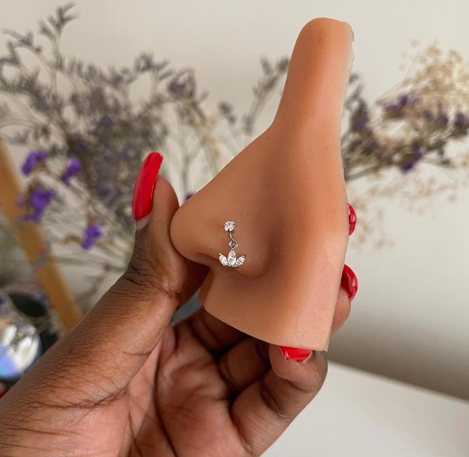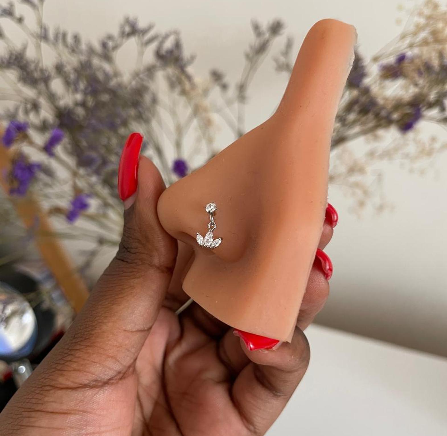 Adorn your nose with this elegant corkscrew nose ring, featuring a brilliant cubic zirconia stud and a graceful triple-petal dangle. Available in luminous silver.