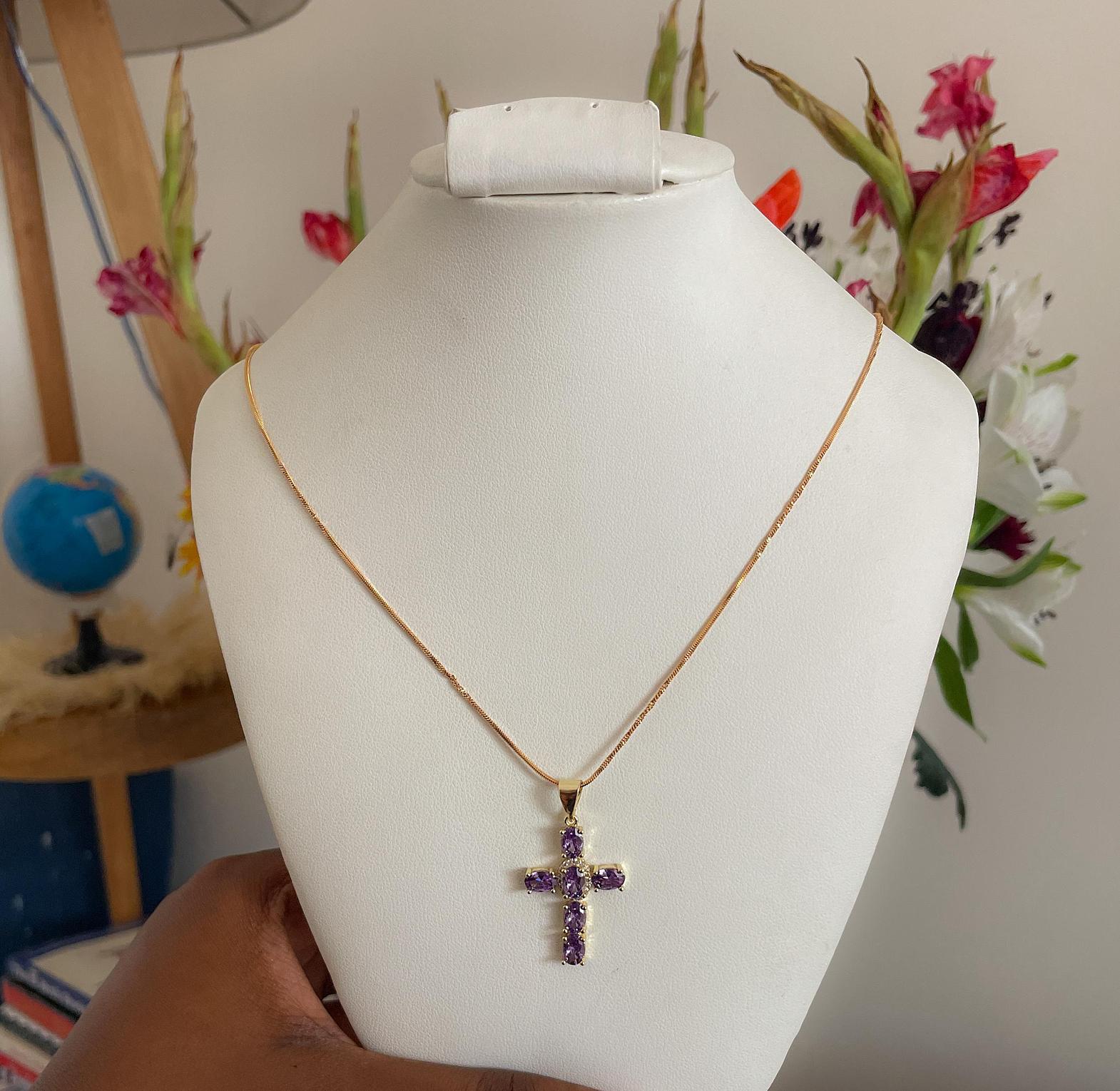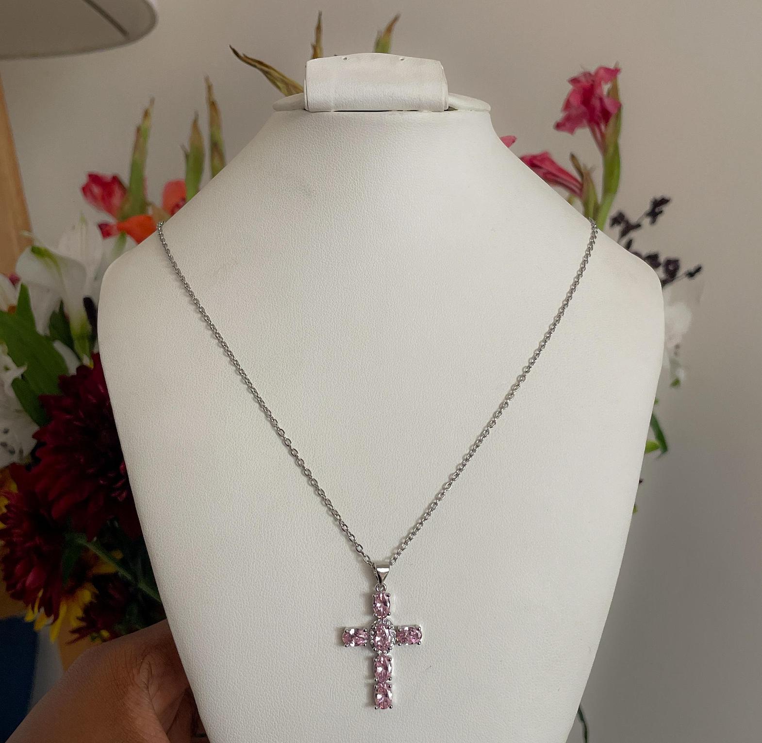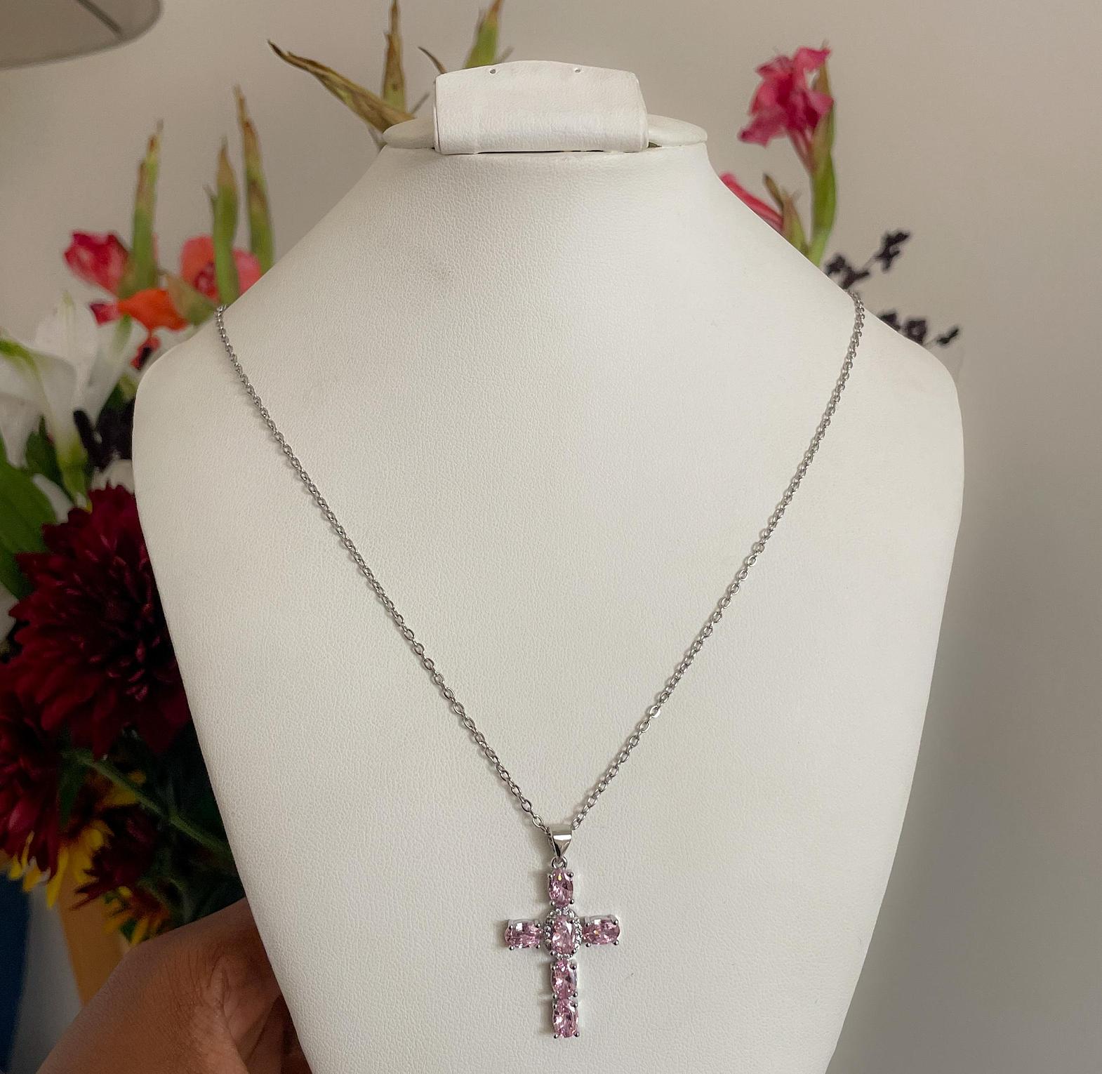 Embrace spiritual grace with a touch of soft color in the Rose Quartz Radiance Cross Necklace. This beautifully crafted and meaningful accessory offers serene elegance for any occasion.