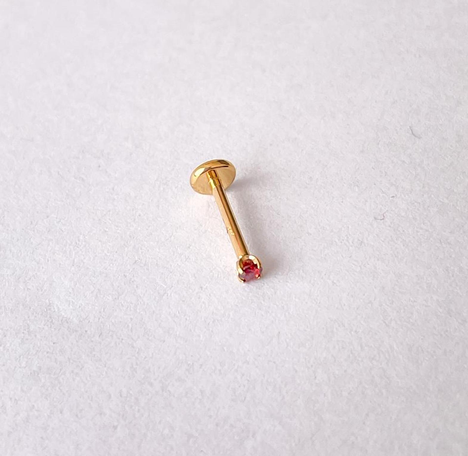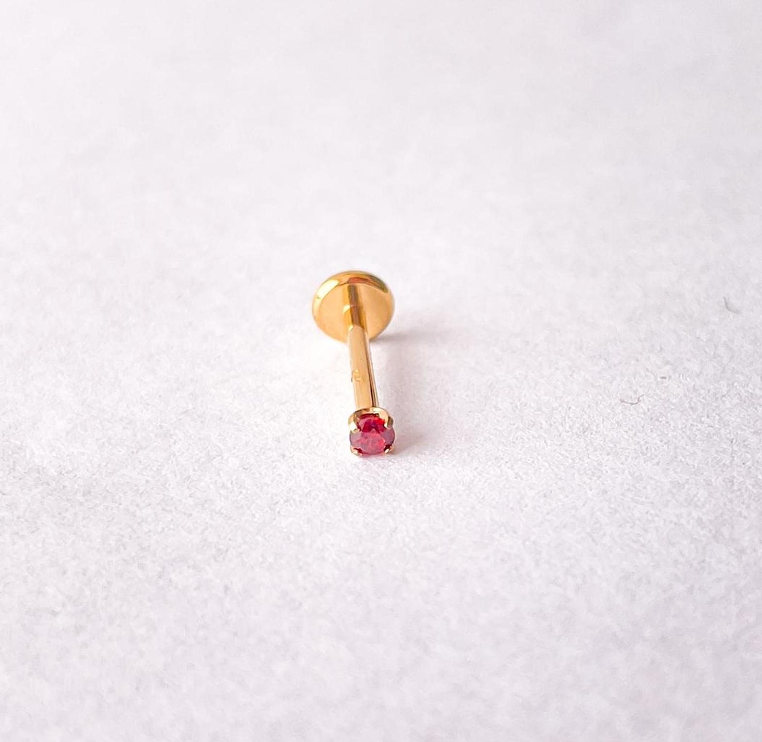 A radiant ruby gemstone set in polished yellow gold with a flat-back design. Perfect for adding refined color to a wide range of piercings.