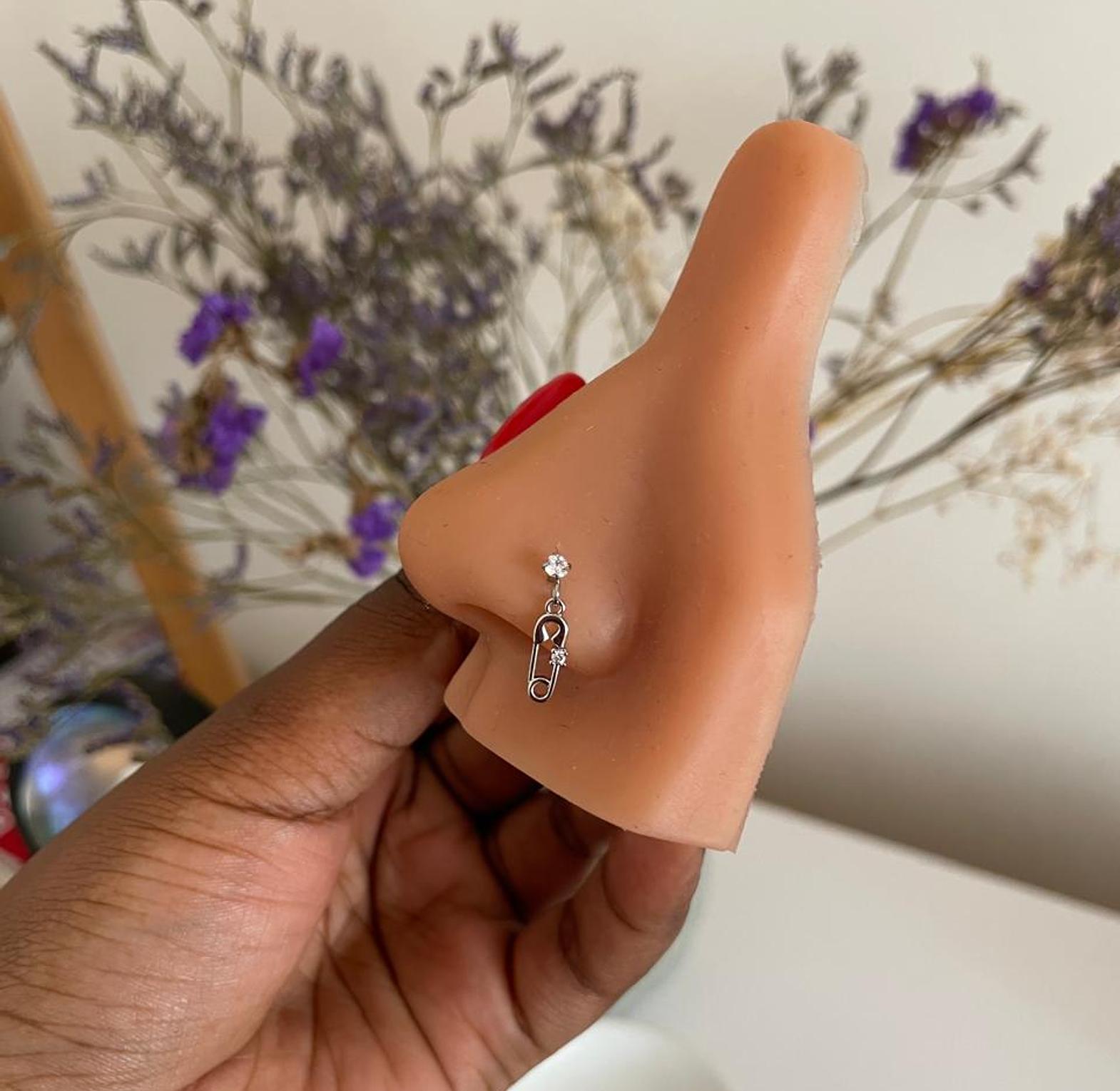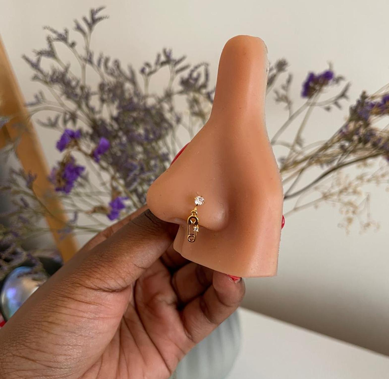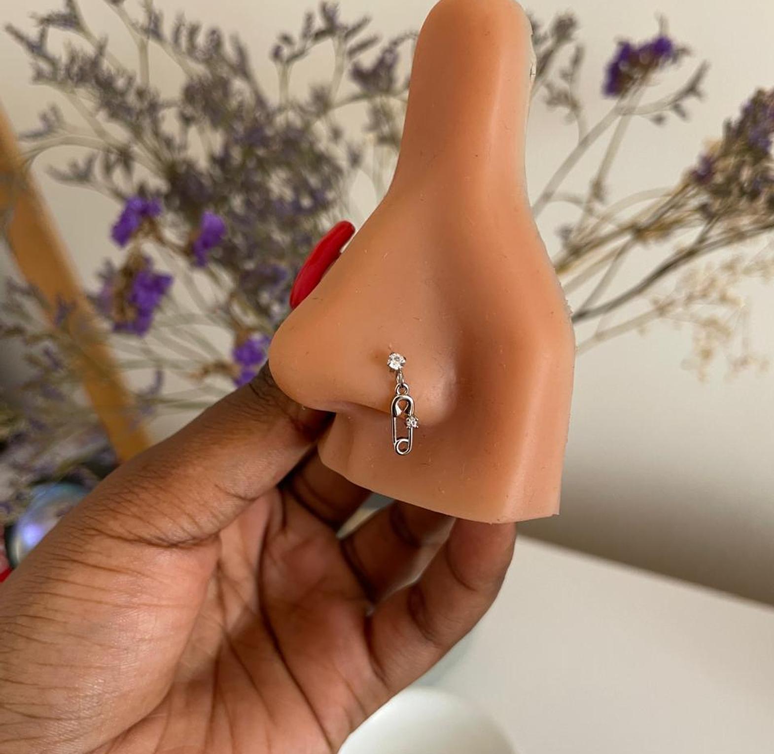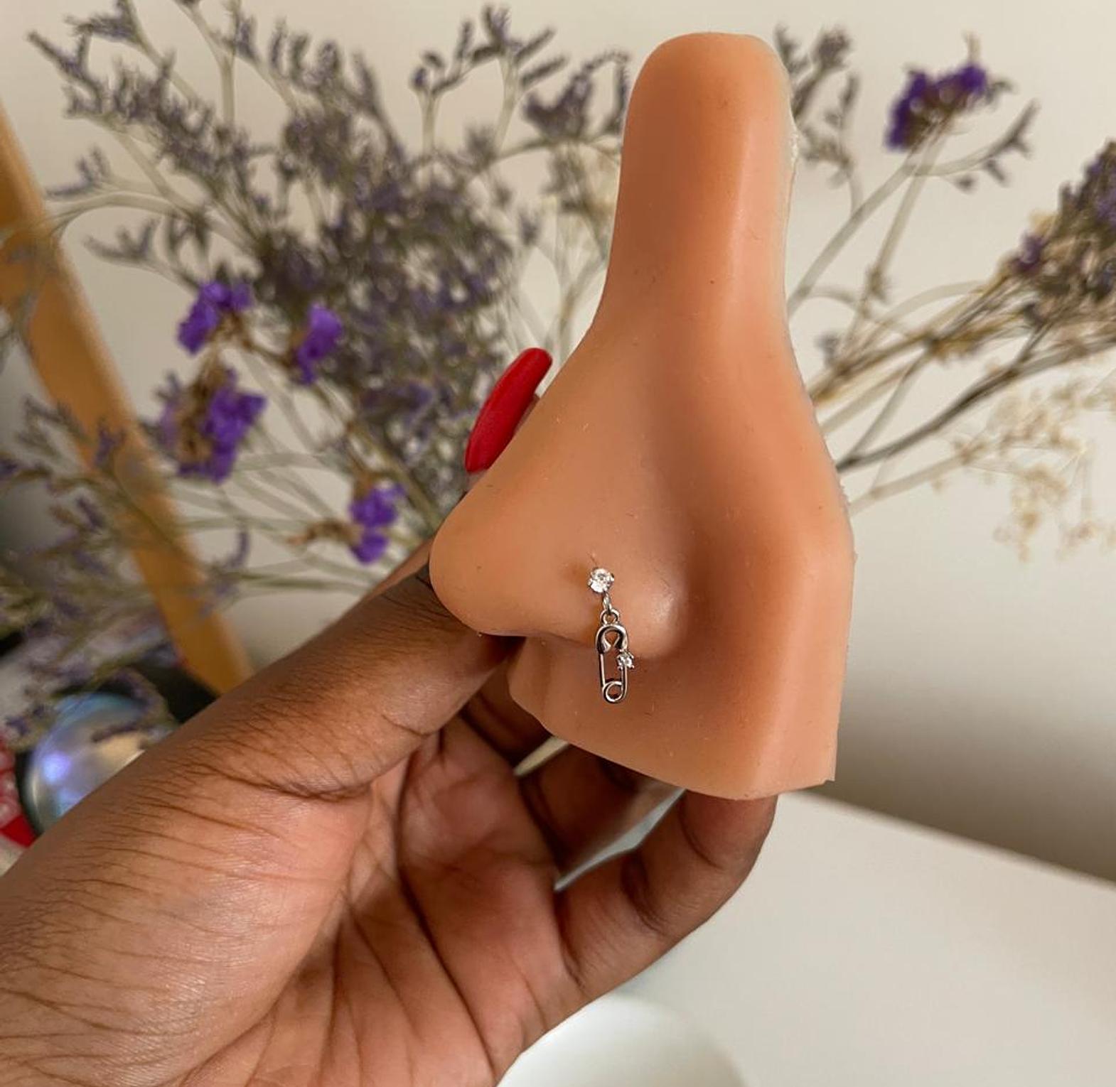 Add an edgy yet elegant touch with this unique corkscrew nose ring, featuring a sparkling cubic zirconia stud and a charming safety pin dangle. Available in brilliant silver and radiant gold.