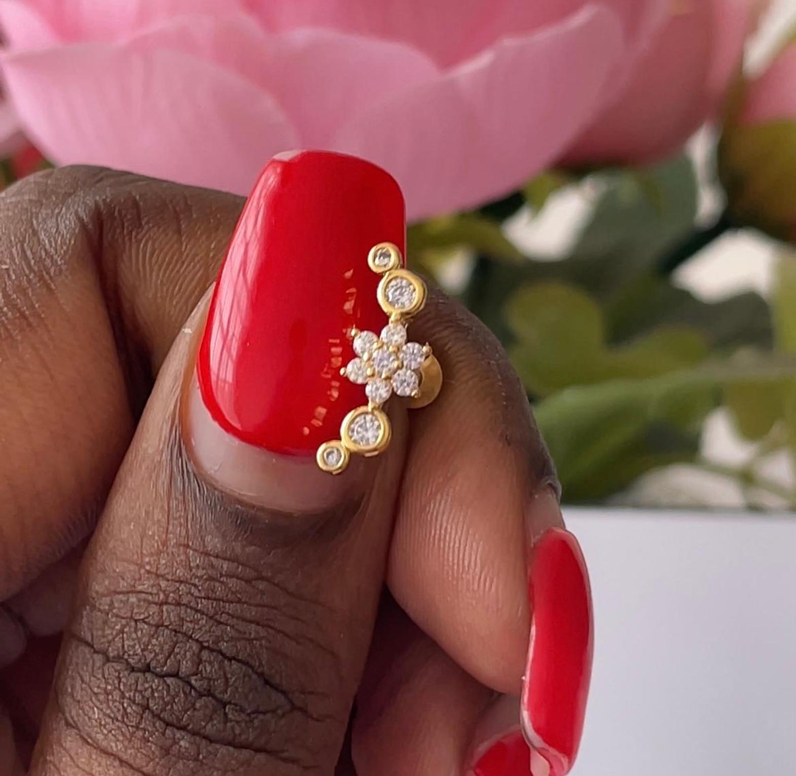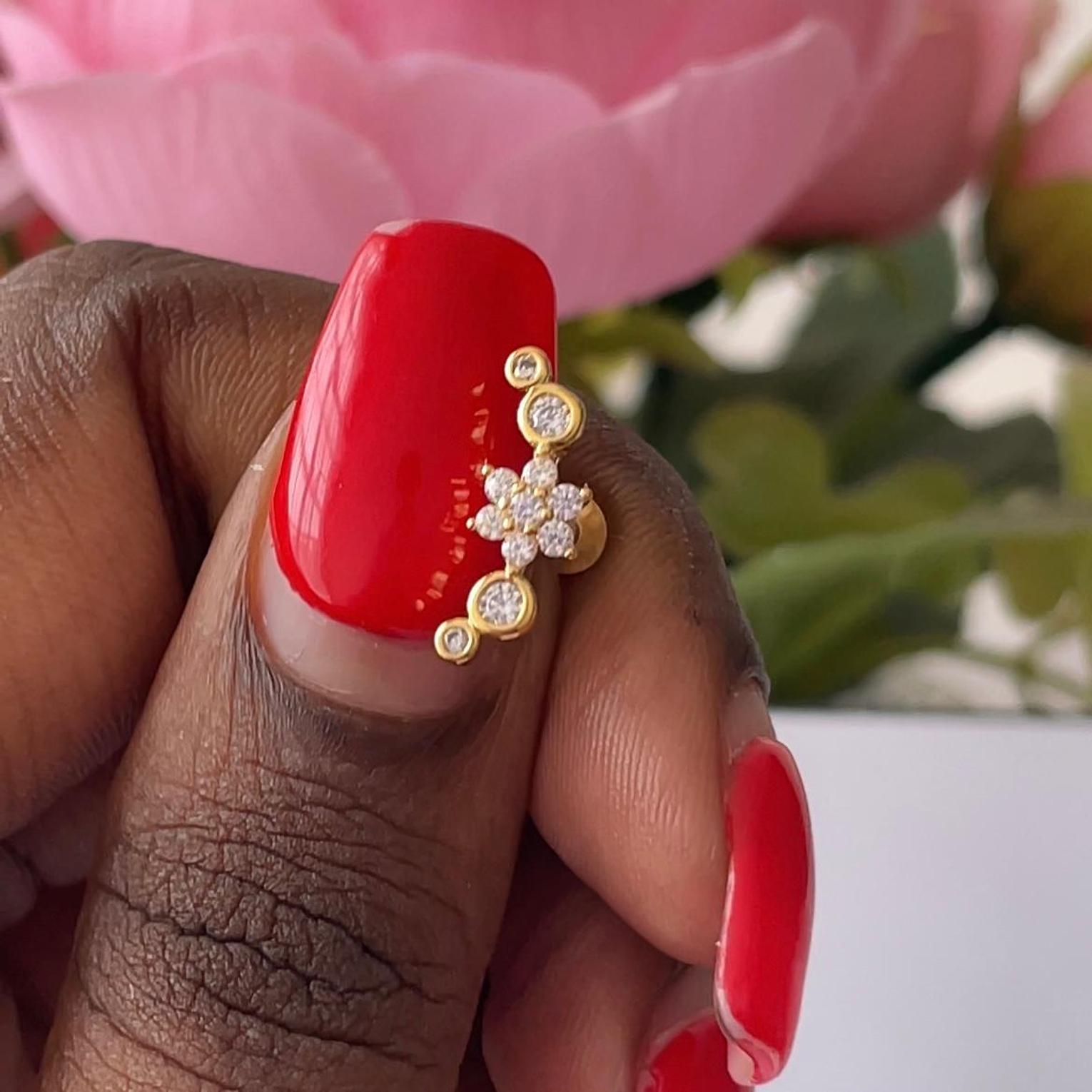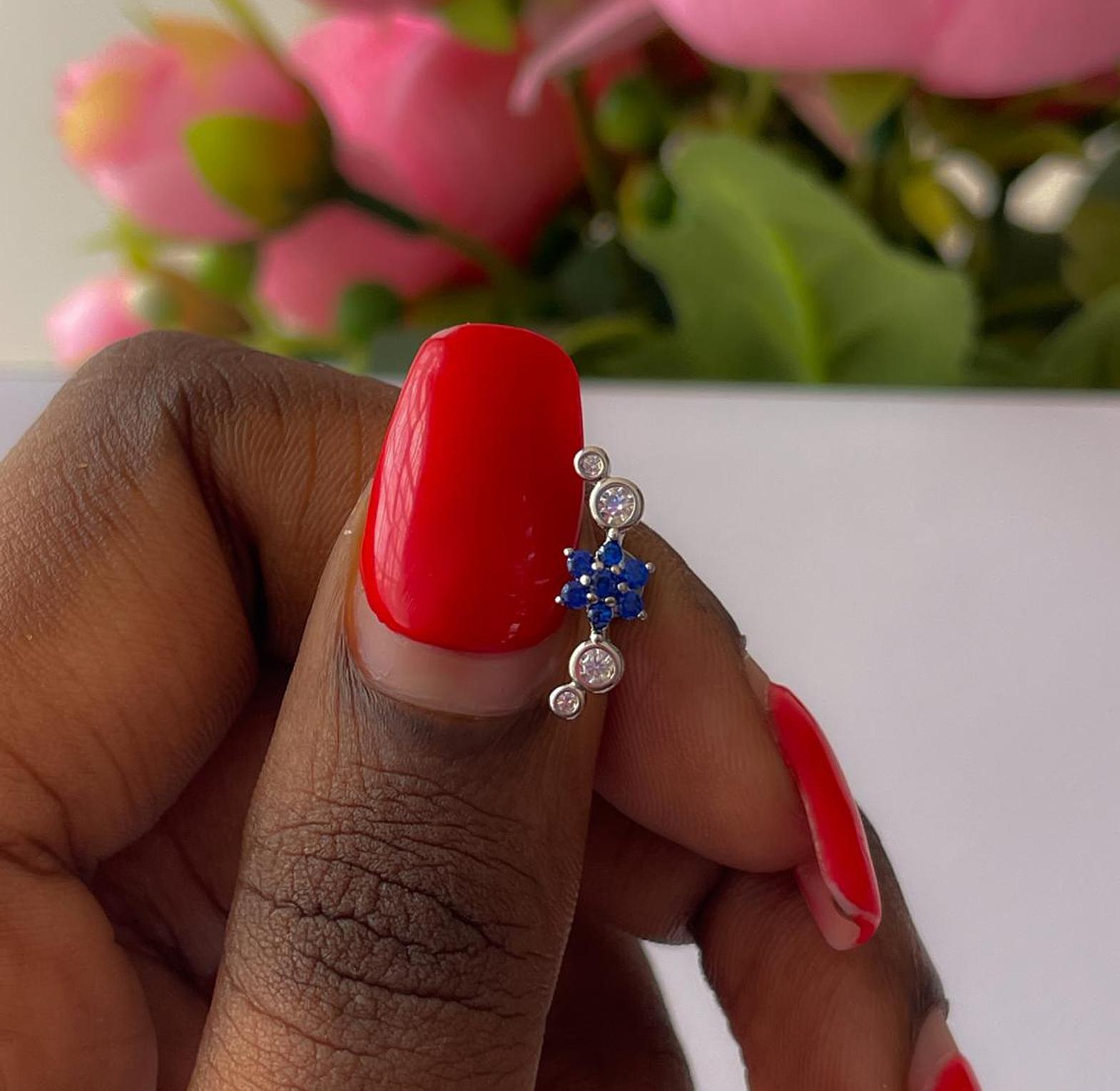 Adorn your ear with the captivating beauty of our Sapphire Blossom & Bead Flat Back Stud, a distinctive addition to any curated ear stack. This high-quality piece of body jewelry is expertly crafted from premium 16G (1.2mm) stainless steel, ensuring exceptional durability, hypoallergenic properties, and resistance to tarnish for enduring wear. The centerpiece features a stunning cluster of vibrant sapphire blue cubic zirconia stones, arranged to form a striking floral design. This is complemented by delicate silver-tone beaded accents, each with a sparkling clear cubic zirconia, creating a dynamic and eye-catching arrangement. This versatile and elegant flower piercing is ideal for various ear piercings, including helix piercings, conch piercings, tragus piercings, and lobe piercings, providing a comfortable and secure fit. The flat back design ensures a smooth profile against the skin, minimizing irritation. Elevate your style with this long-lasting, fashionable, and beautiful stud that seamlessly blends botanical charm with brilliant color and sophisticated sparkle.