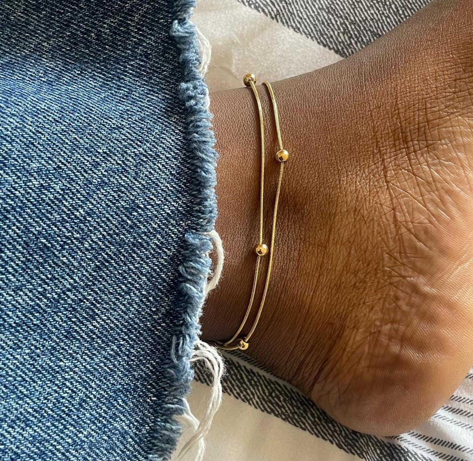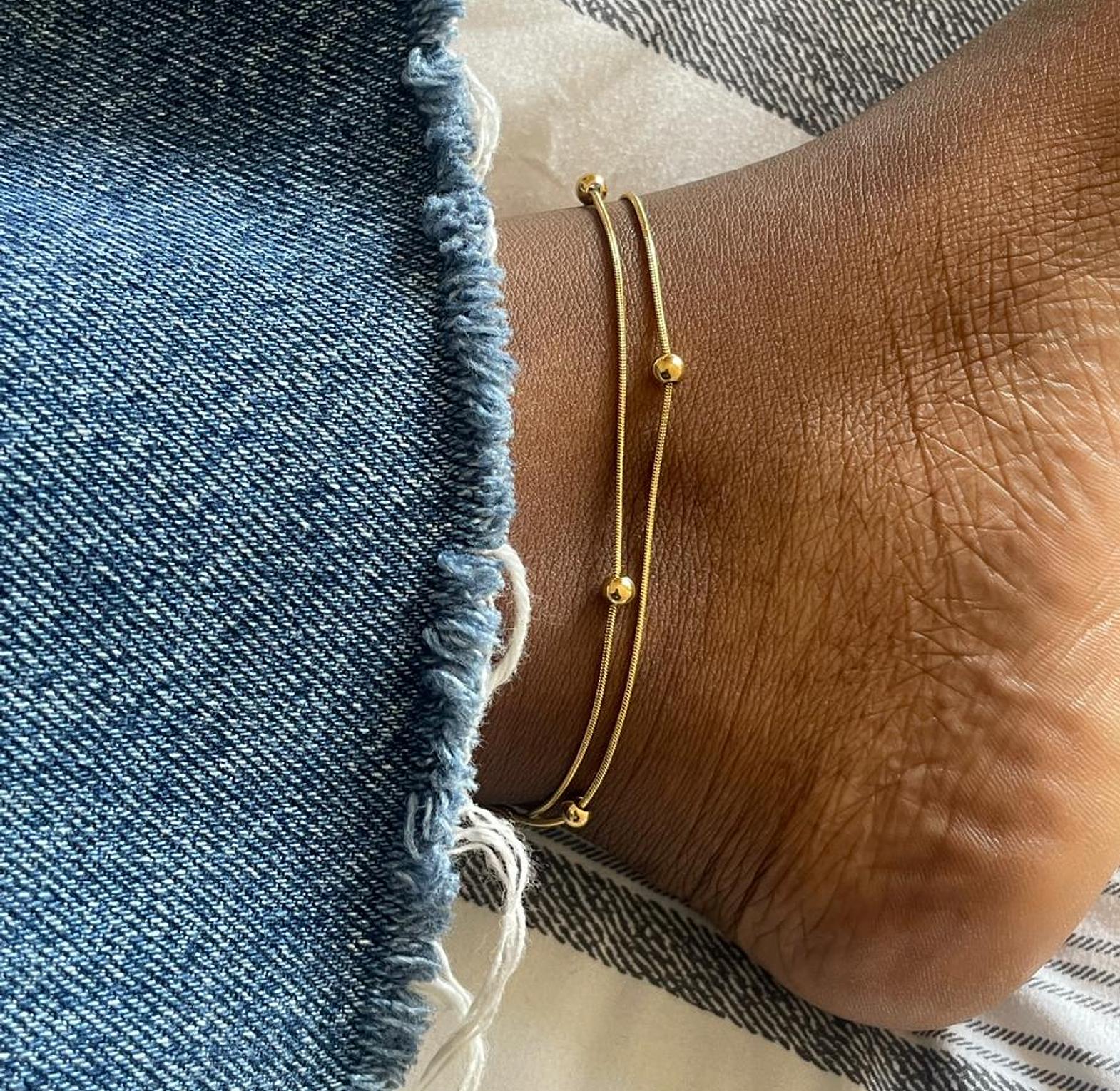 This contemporary layered piece features a dual-chain design, pairing a smooth snake chain with a fine strand accented by polished gold orbs. It’s a versatile accessory that offers beautiful texture and fluid movement