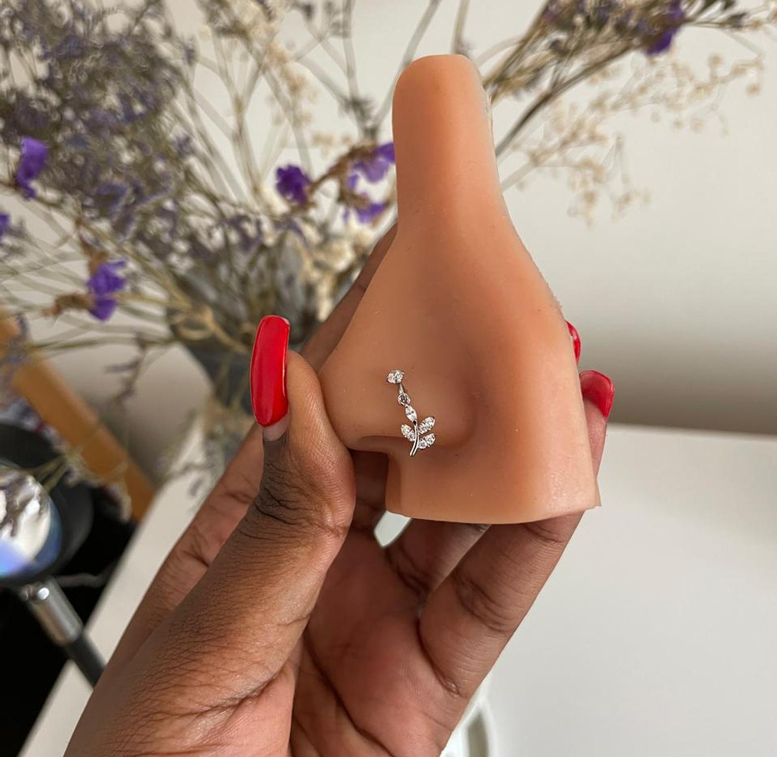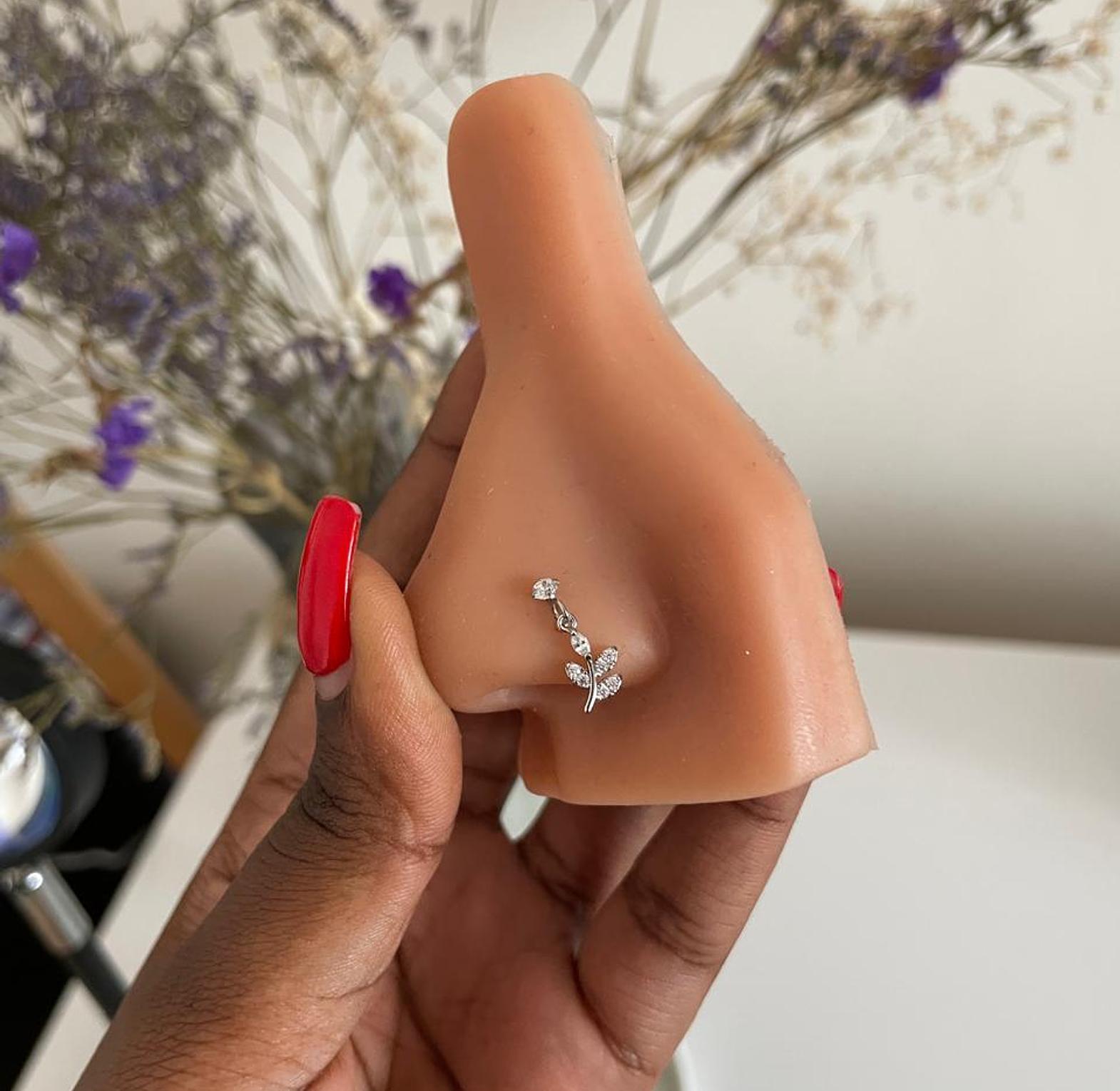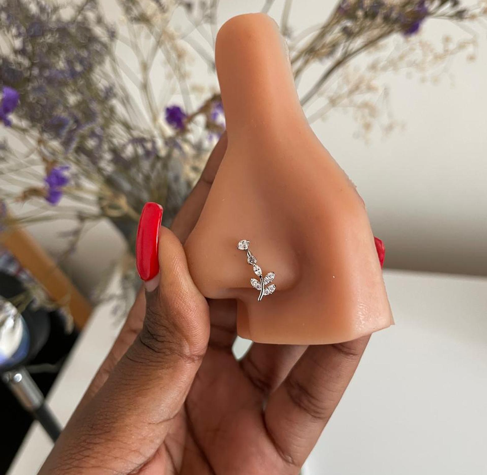 Adorn your nostril with this gorgeous nose stud featuring a delicate vine of shimmering cubic zirconia stones. Hypoallergenic and non-tarnish, it promises enduring sparkle.