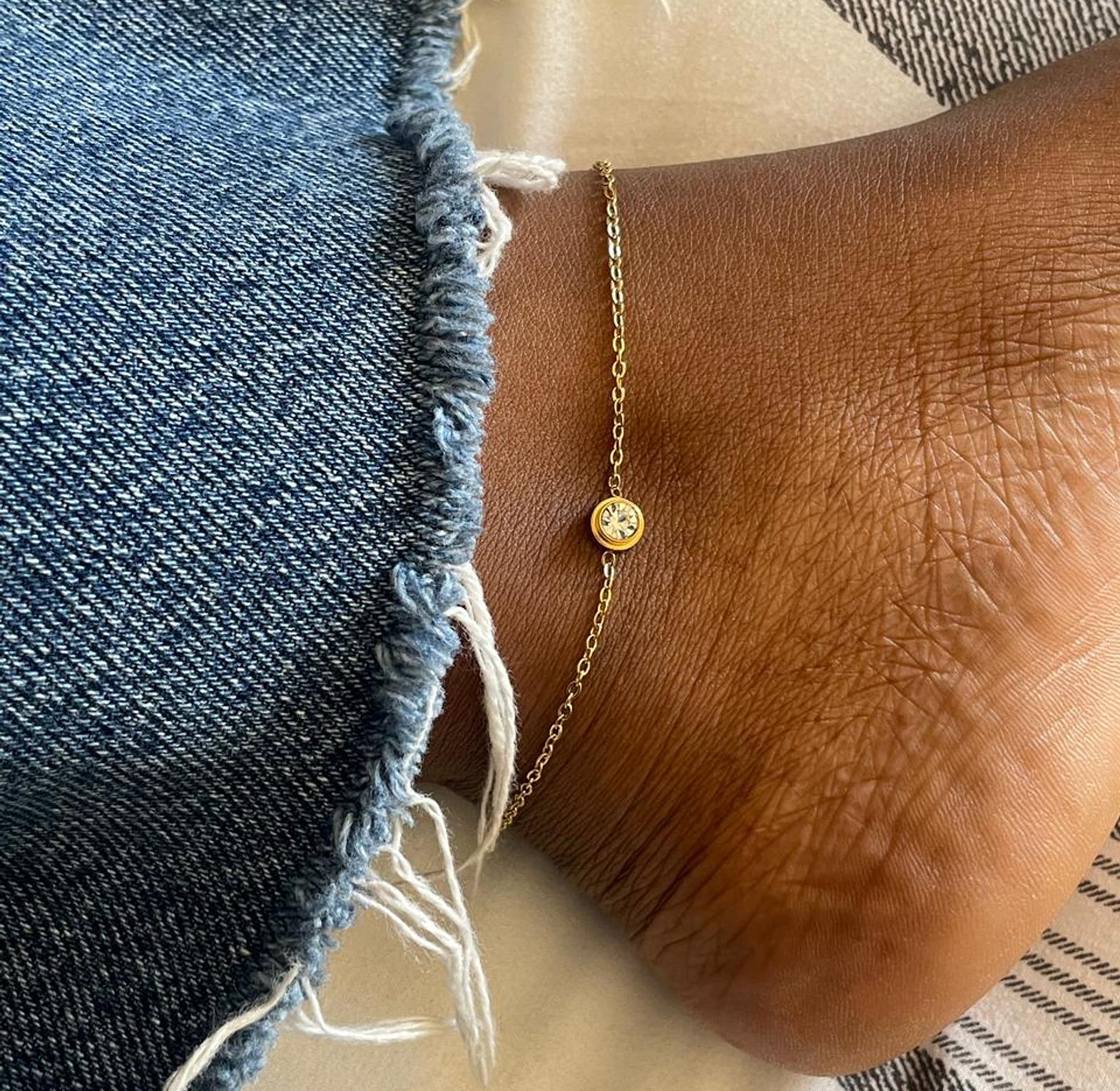This elegant anklet features a single, captivating bezel-set crystal resting delicately on a fine chain. The minimalist design provides a flash of enduring sparkle and polished sophistication.
