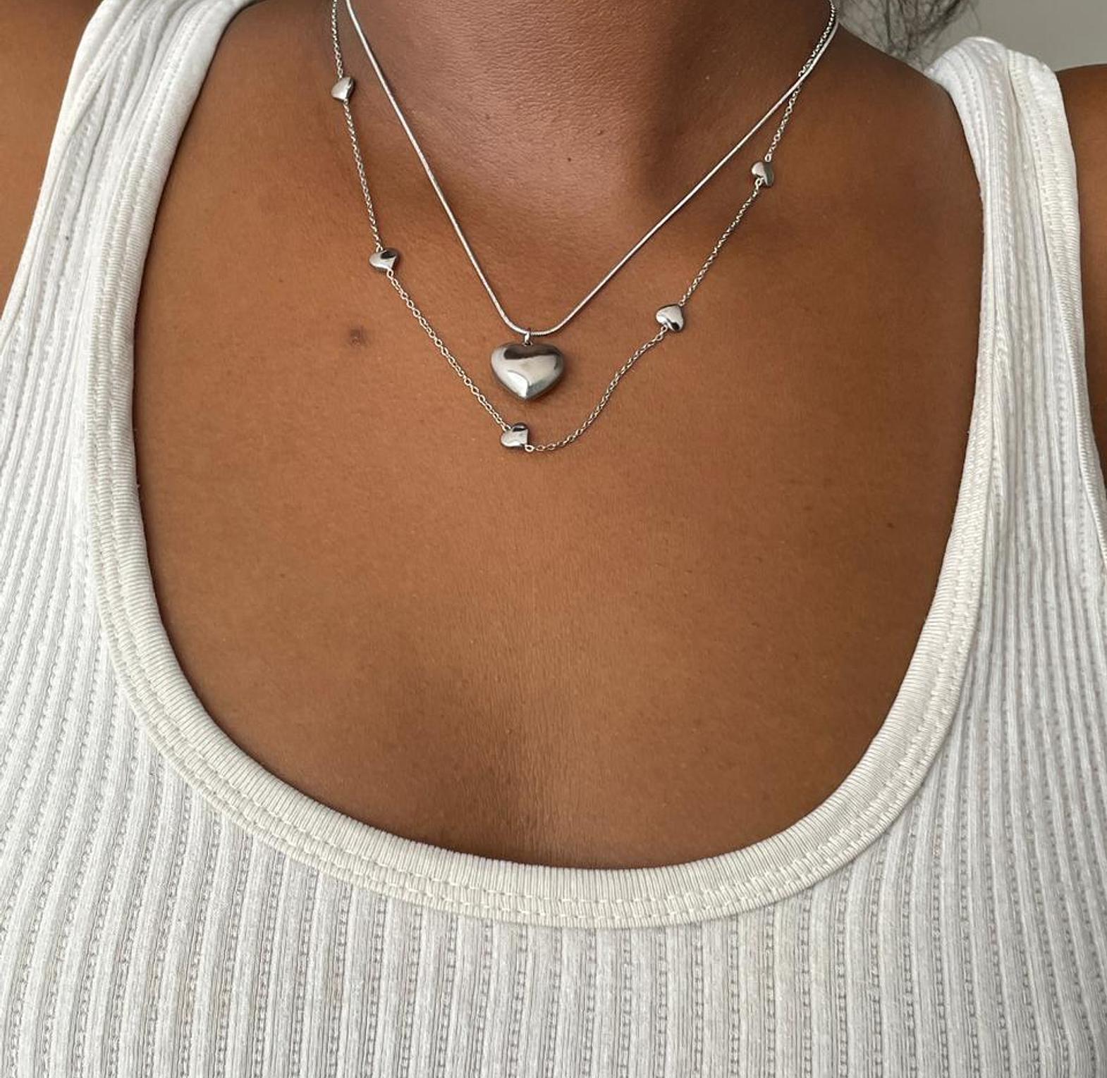 Express your affectionate side with this charming multi-layered silver-toned necklace, featuring a prominent puffy heart pendant and delicate mini heart accents. A romantic and stylish piece perfect for adding a touch of love to your look.