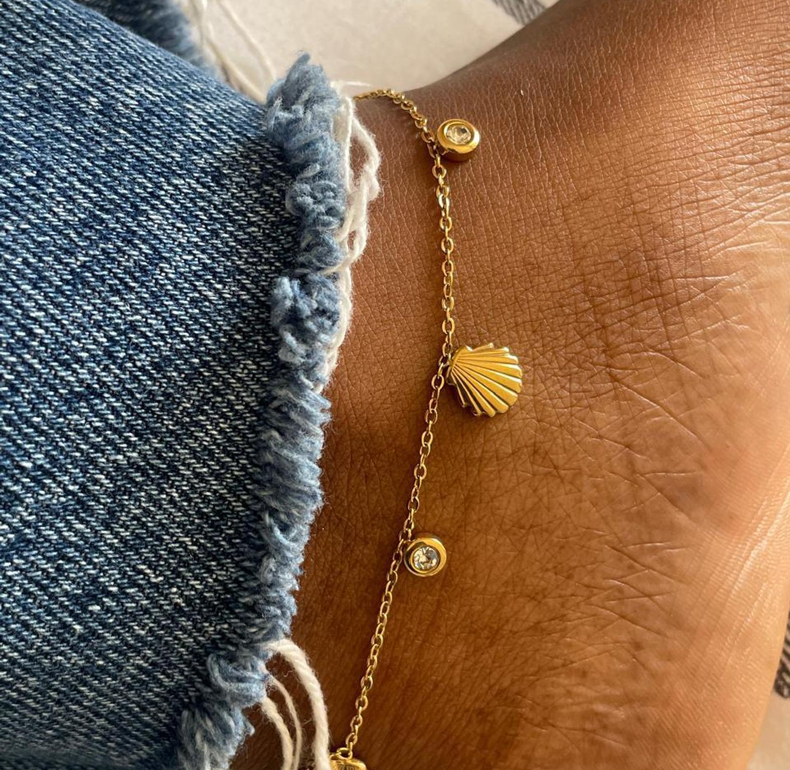 Adorn your ankle with the subtle sparkle of the ocean. This delicate chain features charming shell pendants and brilliant crystal accents, perfect for effortless summer elegance.