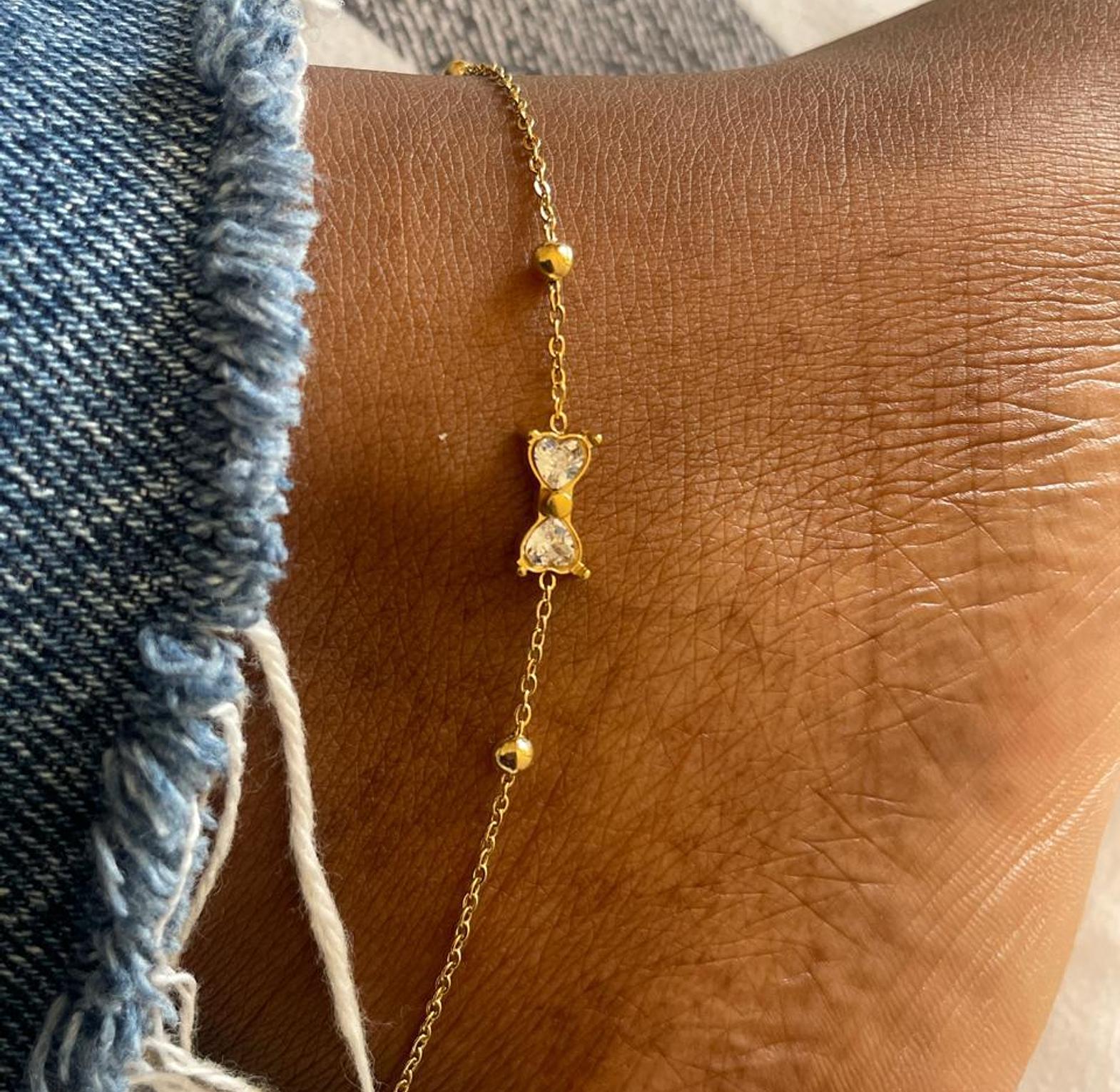 Capture the moment with this delicate anklet featuring a brilliant, hourglass-shaped crystal centerpiece. The slender chain, accented with miniature gold beads, offers a sophisticated and meaningful shine.