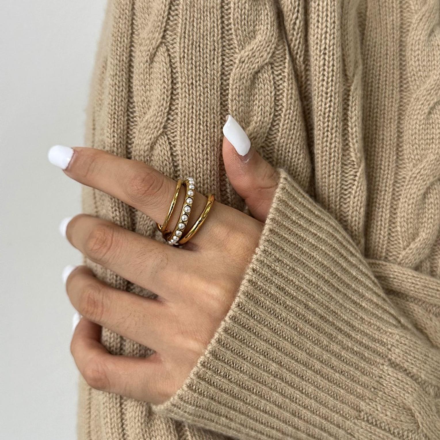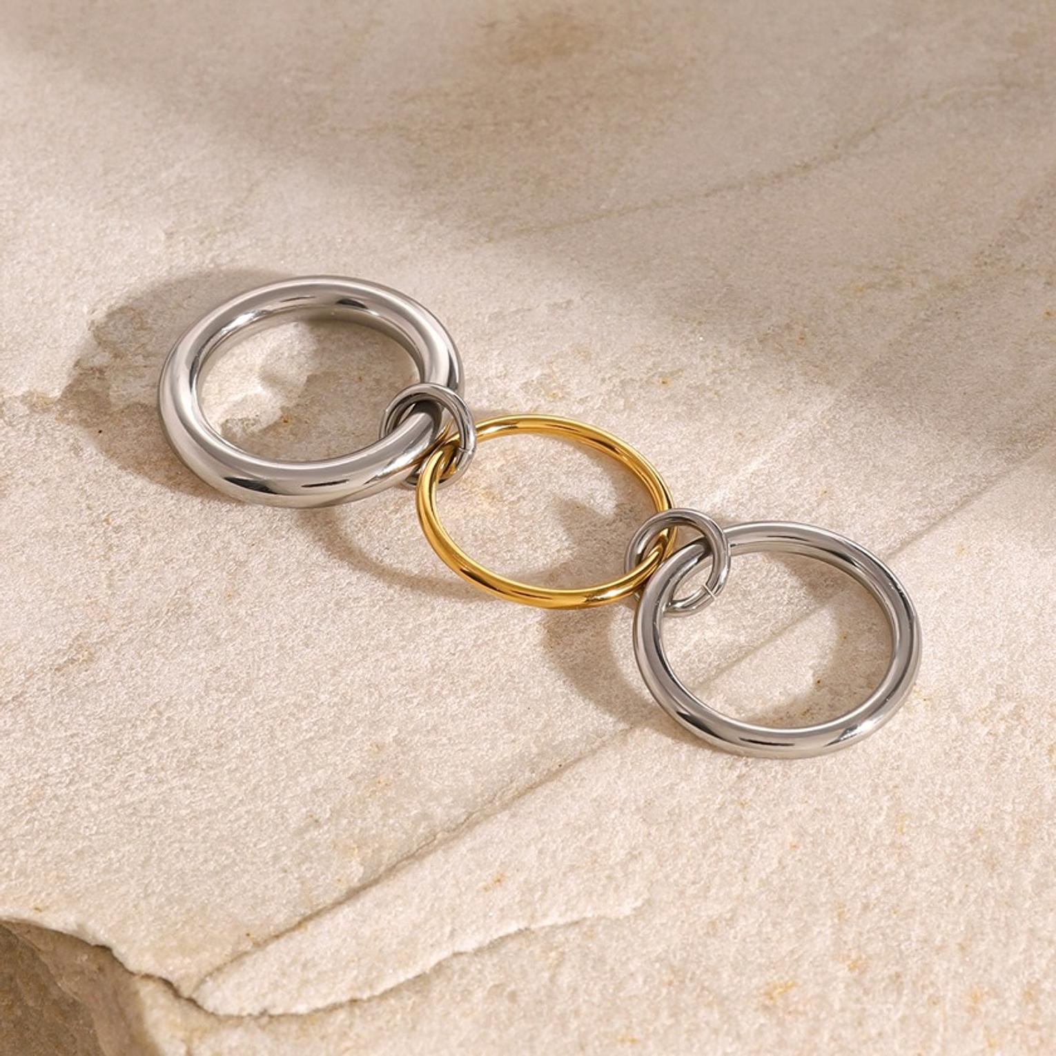 Three interlocked rings in mixed metal tones, symbolizing unity and balance.