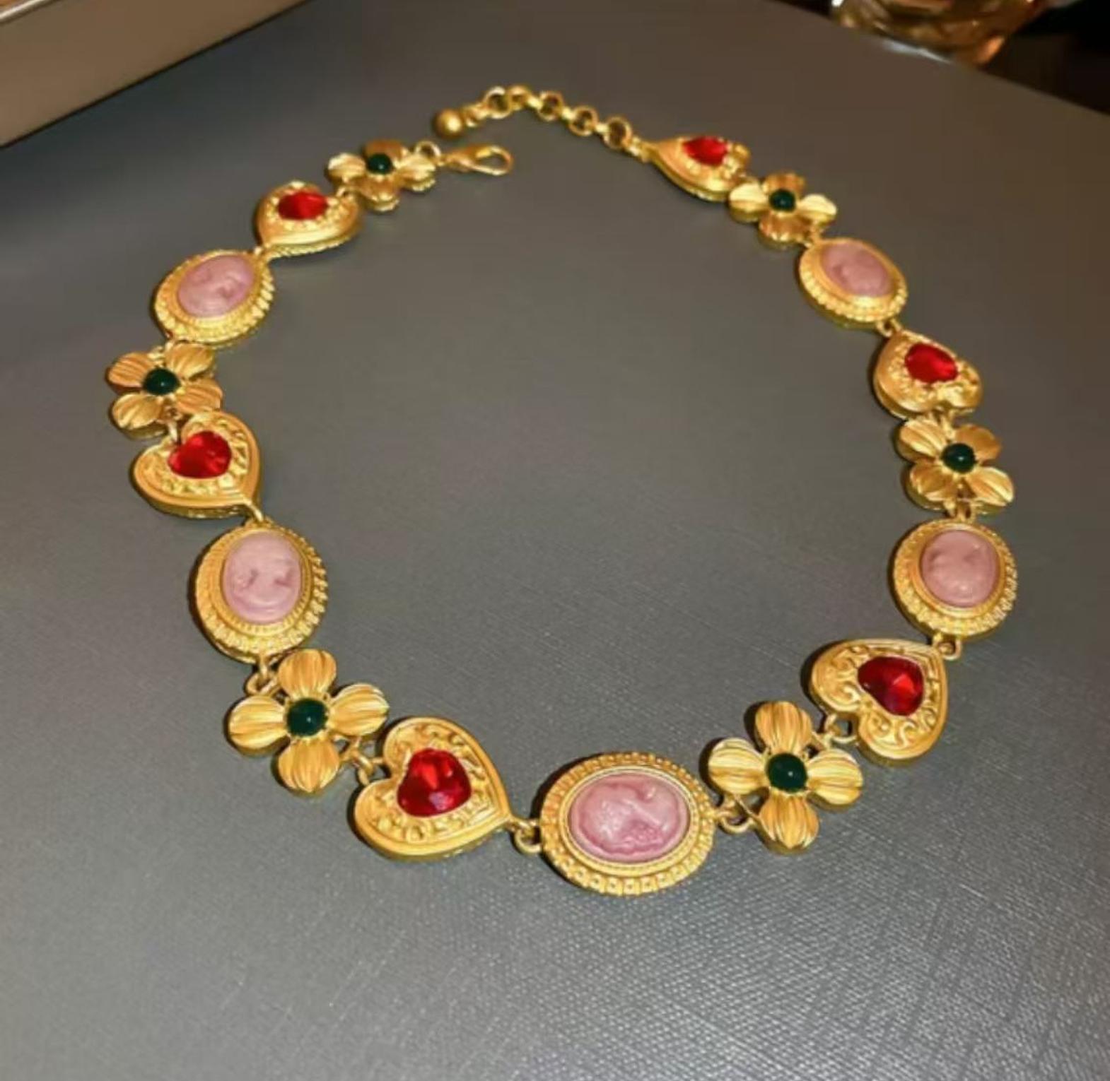 The Vintage Garden Gemstone Statement Necklace is an exquisite masterpiece that captures the essence of timeless elegance and botanical beauty in one stunning piece. This luxurious necklace features a rich gold-tone setting adorned with alternating pink rose quartz and ruby-red gemstones, each carefully framed in ornate vintage-inspired bezels that showcase their natural brilliance. The design is elevated by charming floral motifs with emerald-green accent stones that add a touch of garden-inspired whimsy throughout the piece. Each element is meticulously crafted with intricate detailing, from the delicate petal work on the flower charms to the classic milgrain edges that enhance the vintage aesthetic. The necklace's substantial weight and quality construction ensure durability while maintaining comfortable wearability for special occasions. Perfect for formal events, romantic dinners, or any moment when you want to make an unforgettable impression, this statement piece transforms simple outfits into sophisticated ensembles. The harmonious blend of warm gold tones with the soft pink and vibrant red gemstones creates a versatile color palette that complements both neutral and bold wardrobe choices, making it an essential addition to any jewelry collection.
