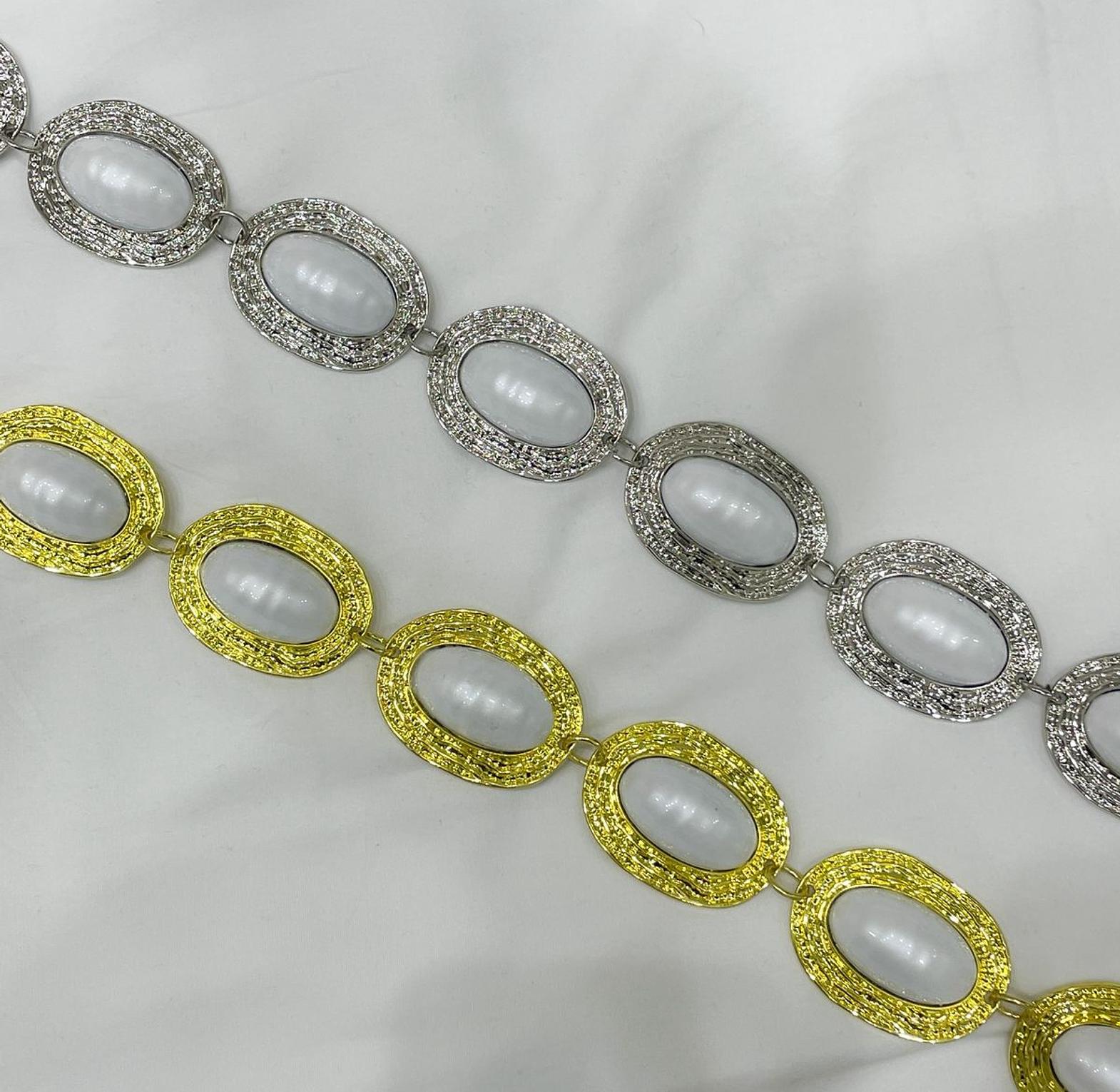 The Vintage Oval Pearl Chain Belt delivers classic elegance with its stunning sequence of luminous oval pearl cabochons, each beautifully framed by intricately textured metallic borders that create depth and visual interest. Available in both luxurious gold-tone and sophisticated silver-tone finishes, this premium waist belt combines the timeless appeal of pearls with contemporary chain design for maximum versatility. Each oval medallion measures approximately 25mm in length and features a smooth, lustrous pearl center that contrasts beautifully with the detailed textured frame, creating an eye-catching interplay of smooth and ornate surfaces. The adjustable chain construction ensures comfortable fit across various waist sizes while providing secure interlocking connections for durability and longevity. Perfect for cinching flowing dresses, blazers, cardigans, or adding sophisticated detail to casual denim outfits, this statement belt appeals to women who appreciate vintage-inspired accessories, pearl jewelry, and versatile pieces that transition effortlessly from office to evening wear. The dual color options allow for seamless coordination with both warm and cool-toned wardrobes, making it an essential accessory for the modern woman's collection.