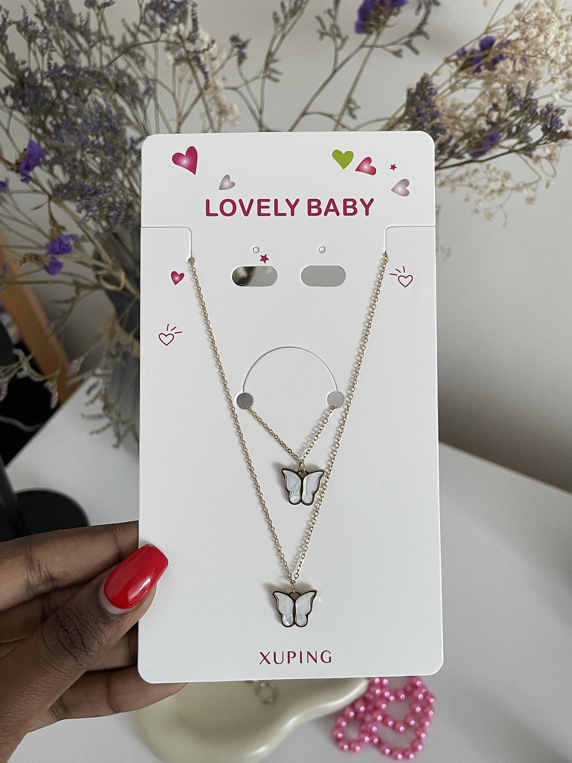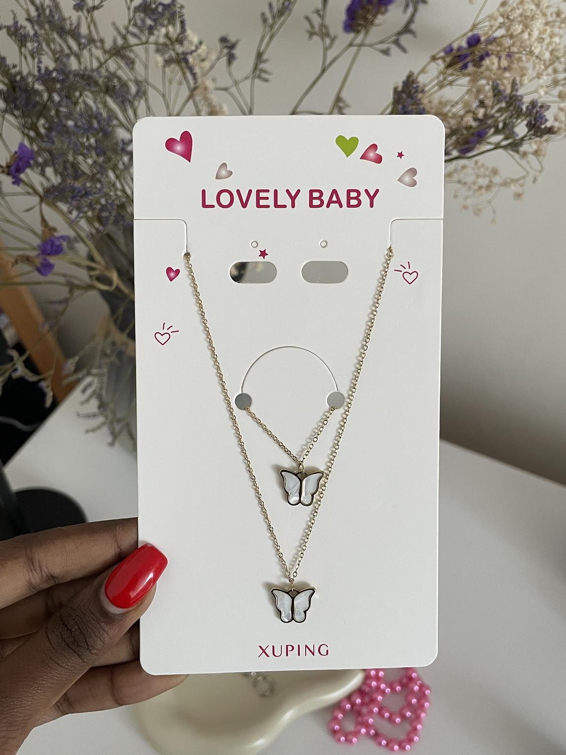 2 pcs children necklace set with butterfly. The set has a necklace and a bracelet. All the jewelry is stainless and hypoallergenic.