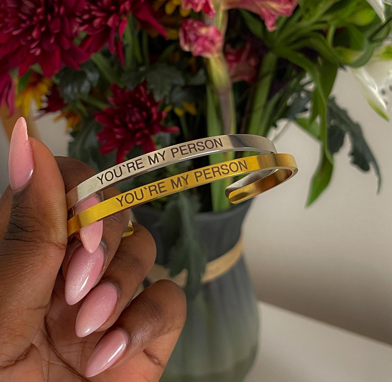 Celebrate your special bond with these meaningful "You're My Person" cuff bracelets. Crafted from durable stainless steel, they come in a gleaming gold and sleek silver finish, perfect for sharing.
