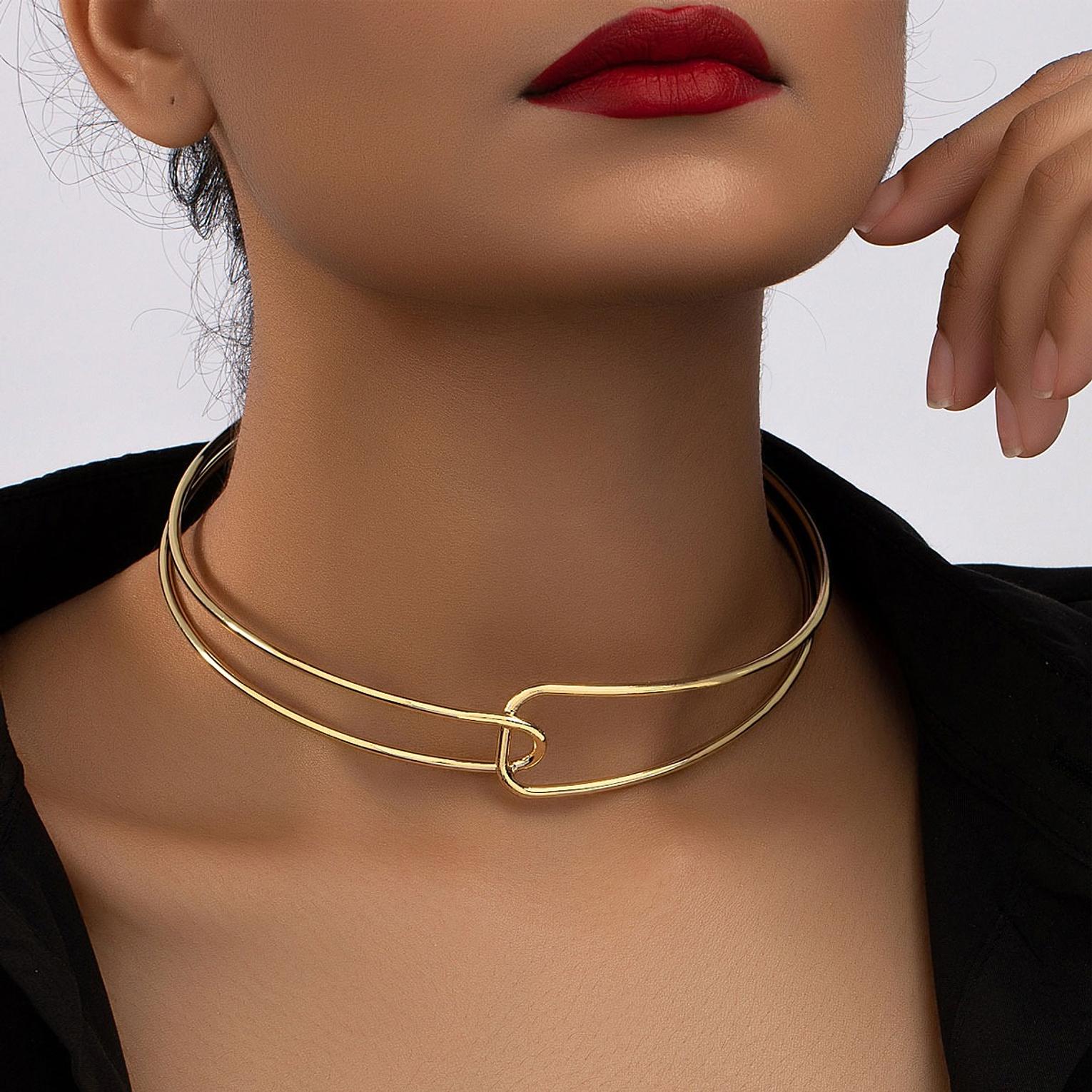 Bold gold-yellow punk choker featuring an exaggerated alloy ring buckle and open vintage-inspired design. A trendy statement collarbone chain for confident, fashion-forward looks.