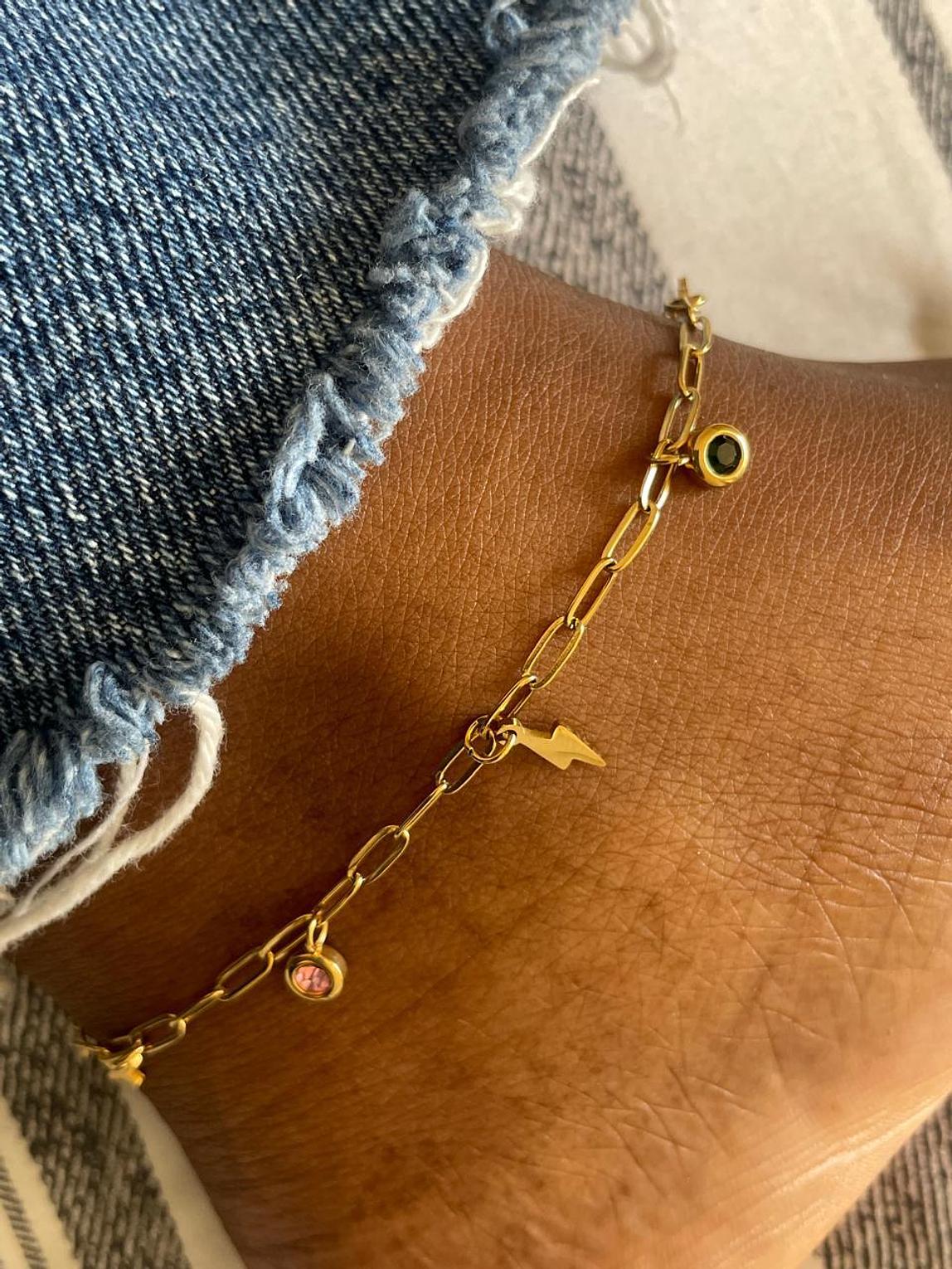 Ignite your style with this trendy anklet featuring a popular paperclip chain and a striking miniature lightning bolt charm. It’s playfully accented with colorful, bezel-set crystal drops for an energetic, modern look.